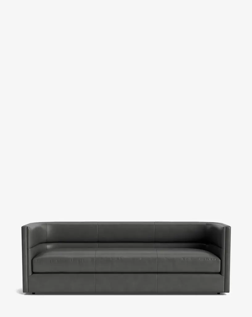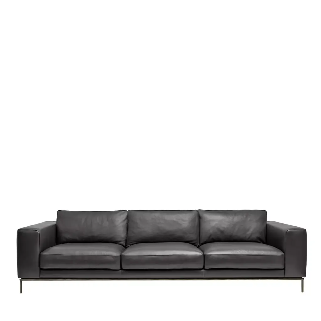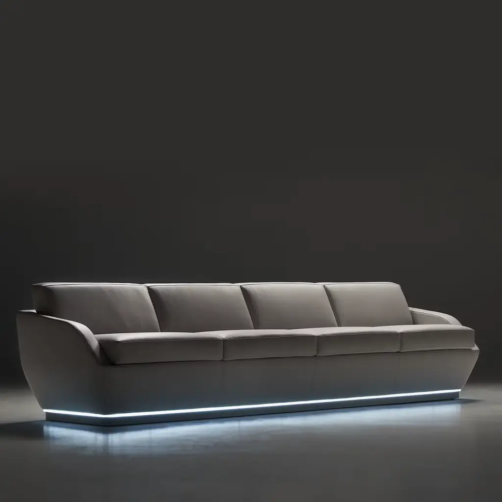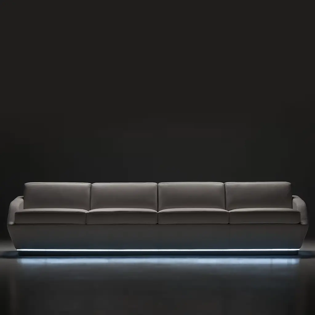 Clean profiles outlining generous volumes padded with polyurethane foam seem to be the ones distinguishing this elegant sofa with a solid wooden core. Luxuriously covered in fine light-gray leather, it stands out for the captivating light emitted from a belt of LED lights that contour its lower profile, an effect that cannot help but capture the eye.