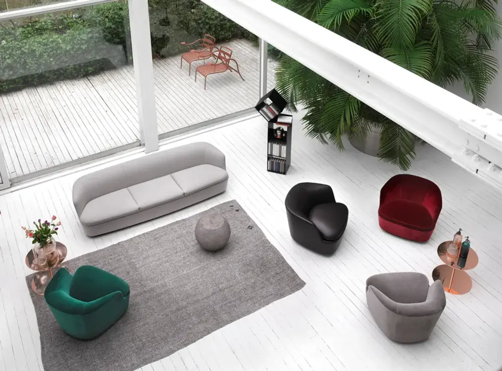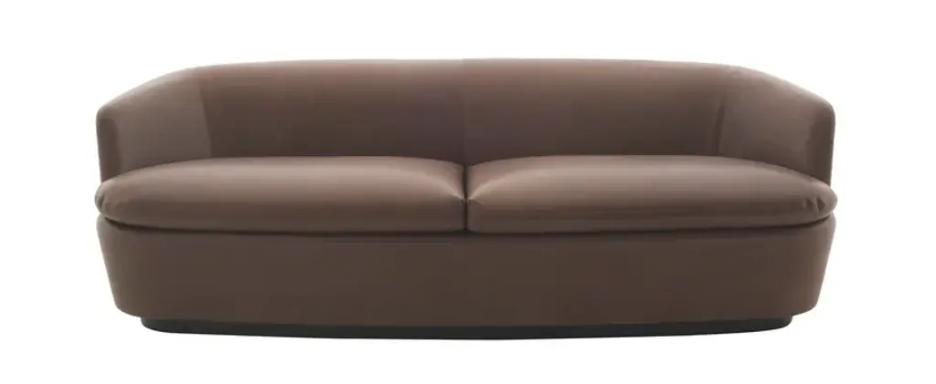 Sofa from the Orla collection by Jasper Morrison. Fixed cover for structure and removable for cushions, in fabrics and leathers of the collection.This collection is composed of two and three-seater sofa, right and left hand curved sofa, two-seater small sofa, armchair and small armchair, both either fixed or swivelling, and pouf. Fixed cover for structure and removable for cushions, in fabrics and leathers of the collection, for sofas and armchairs; fixed cover for structure and cushion, in fabrics and leathers of the collection, for small sofa and small armchairs.Sofas and pouf structure: composite rigid polyurethane with elements in poplar plywood and elastic beltsArmchair and small armchair structure: foam with metal frame and elastic beltsPadding: multi-density polyurethane foam and fibreBase: medium-density wooden conglomerate panelBase finish: matt lacquer, 04 blackFeet: grey felt padsCastors: only on small armchair without swivelling mechanism, self-blocking round casters, white colourSwivelling base on armchair: swivelling base without spring return mechanismSwivelling base on small armchair: steel swivelling base with spring return mechanism, painted natural aluminium RAL 9006Structure cover: fixed in fabric, leather G, leather Extra G2Cushions cover: removable in fabric, leather G, leather Extra G2Cushion cover for small armchair and small sofa: fixed in fabric, leather G and leather Extra G2Notes- Stitch thread in the same fabric and leather color- Free fabric matching between armchair and seat cushion not available- Loose seat cushions for sofas (not small sofa), armchair and pouf