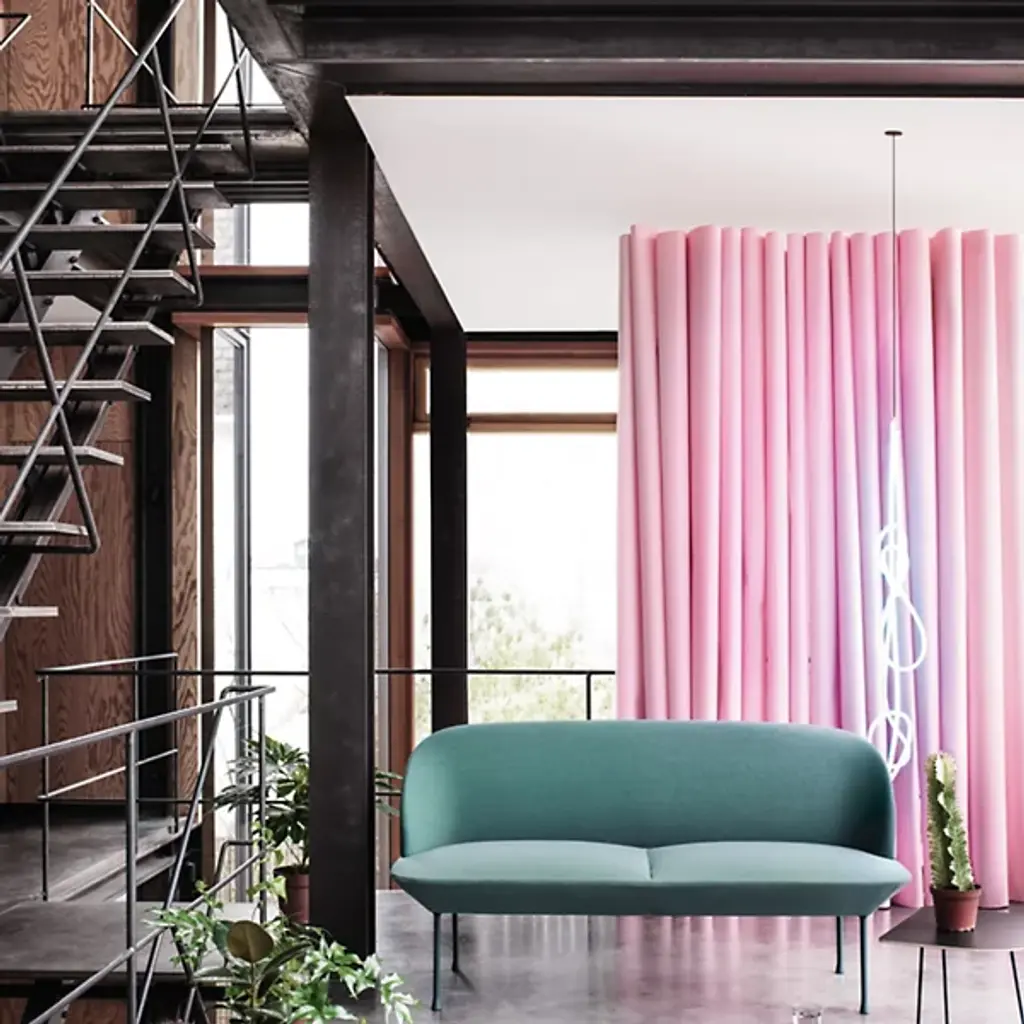Bring hygge home with the comfort and character of the Oslo Sofa from Muuto. This plush and appealing example of Scandinavian minimalism is made in Denmark and is characteristic of the ethos of at-home comfort, incorporating a strong steel frame atop four slim legs of powder-coated steel. A bisected seat section offers carefully-considered comfort, completed by a curving back that curls slightly around the sides and surfaced with appealing Kvadrat fabric for enduring and endearing comfort.