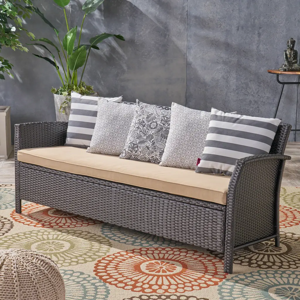 Upgrade your outdoor space with a stylish and durable three-seater sofa designed for both comfort and elegance. Crafted with a sturdy PE rattan weave over a strong iron frame, this piece ensures long-lasting use in any setting. Slightly curved armrests add a subtle flair, enhancing both aesthetics and relaxation. The plush seat cushion, covered in waterproof fabric, provides a cozy seating experience while resisting the elements. Perfect for patios, gardens, or backyards, this sofa invites you to unwind in style.