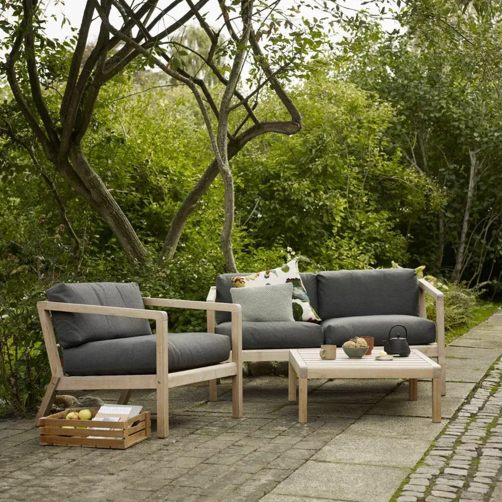 Outdoor 'Virkelyst' 2-seater sofa in teak and honey yellow fabric for SkagerakSkagerak was founded in 1976 by Jesper and Vibeke Panduro, who took inspiration from their love of Scandinavian design and its rich tradition. The brand emphasizes sustainability by using responsibly sourced materials and production methods that minimize waste and reduce environmental impact. Each piece of handcrafted furniture is designed to age with grace and last for generations.Virkelyst is a series of modern outdoor furniture with the seating comfort of indoor furniture. The simple wooden 100% FSC Certified Teak frame strikes a contrast with the thick, soft cushions. Able to withstand wind and weather, the upholstery fabrics are Oeko-Tex certified and extremely color and lightfast as well as water and dirt-repellent and even mildew-resistant. The cushion dries quickly even after heavy downpour, as the foam has an open-cell structure that allows both water and air to pass through. Fabricated to the exacting standards of Skagerak using the highest quality materials available.Price per item. Available to order in unlimited quantities in colors of honey yellow, papyrus, ash, charcoal, white, golden yellow stripe and sea blue stripe. Also available as a 3-seater sofa, chair and pouf - please see our separate listings. This listing is for the 'Virkelyst' 2-seater sofa in honey yellow fabric.In stock lead time 2-3 weeks. Out of stock lead time can be an additional 3-4 weeks, or longer. Lead times and stock availability are subject to change at any time and without notice. Please inquire for current lead times prior to placing time sensitive orders.Made to order.All sales final.