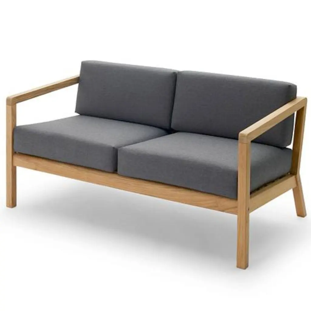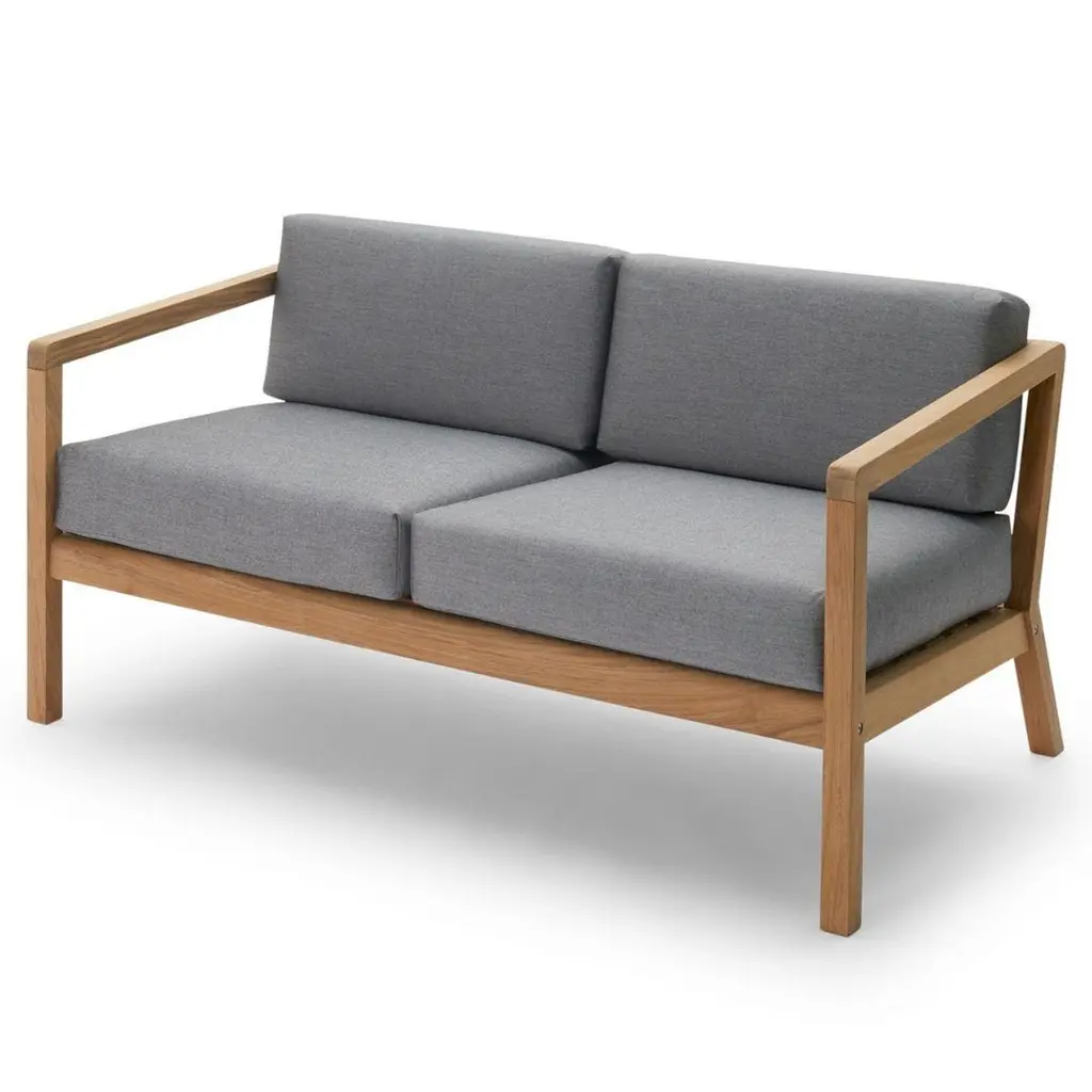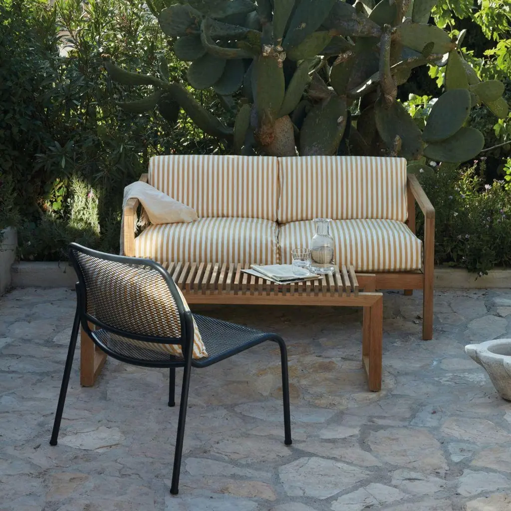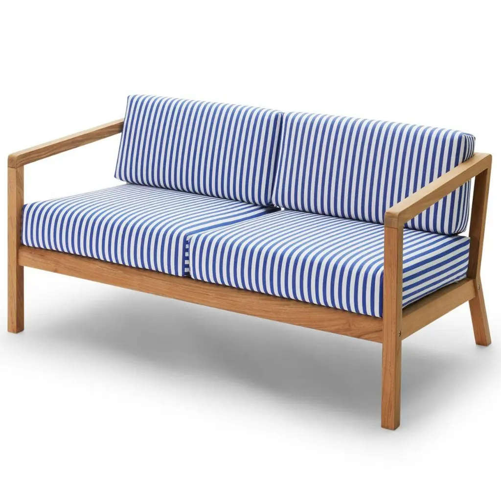 Outdoor 'Virkelyst' 2-seater sofa in teak and yellow striped fabric for SkagerakSkagerak was founded in 1976 by Jesper and Vibeke Panduro, who took inspiration from their love of Scandinavian design and its rich tradition. The brand emphasizes sustainability by using responsibly sourced materials and production methods that minimize waste and reduce environmental impact. Each piece of handcrafted furniture is designed to age with grace and last for generations.Virkelyst is a series of modern outdoor furniture with the seating comfort of indoor furniture. The simple wooden 100% FSC Certified Teak frame strikes a contrast with the thick, soft cushions. Able to withstand wind and weather, the upholstery fabrics are Oeko-Tex certified and extremely color and lightfast as well as water and dirt-repellent and even mildew-resistant. The cushion dries quickly even after heavy downpour, as the foam has an open-cell structure that allows both water and air to pass through. Fabricated to the exacting standards of Skagerak using the highest quality materials available.Price per item. Available to order in unlimited quantities in colors of honey yellow, papyrus, ash, charcoal, white, golden yellow stripe and sea blue stripe. Also available as a 3-seater sofa, chair and pouf - please see our separate listings. This listing is for the 'Virkelyst' 2-seater sofa in yellow striped fabric.