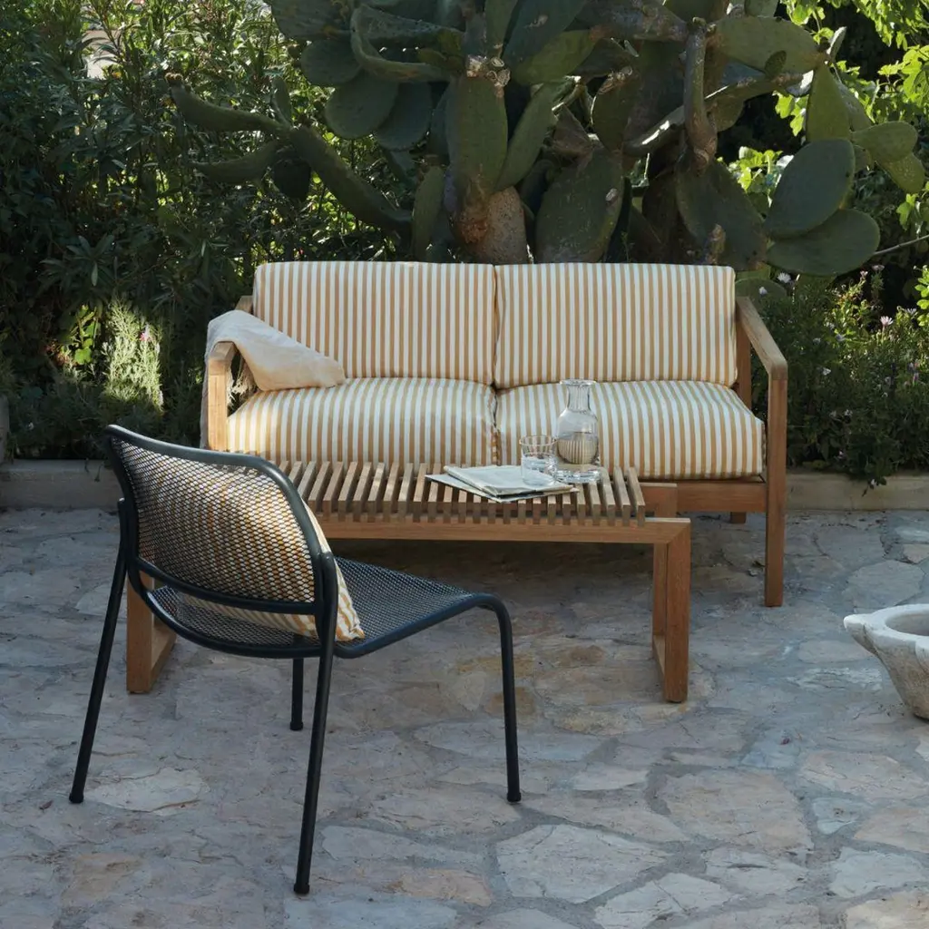 Outdoor 'Virkelyst' 3-seater sofa in teak and ash fabric for SkagerakSkagerak was founded in 1976 by Jesper and Vibeke Panduro, who took inspiration from their love of Scandinavian design and its rich tradition. The brand emphasizes sustainability by using responsibly sourced materials and production methods that minimize waste and reduce environmental impact. Each piece of handcrafted furniture is designed to age with grace and last for generations.Virkelyst is a series of modern outdoor furniture with the seating comfort of indoor furniture. The simple wooden 100% FSC Certified Teak frame strikes a contrast with the thick, soft cushions. Able to withstand wind and weather, the upholstery fabrics are Oeko-Tex certified and extremely color and lightfast as well as water and dirt-repellent and even mildew-resistant. The cushion dries quickly even after heavy downpour, as the foam has an open-cell structure that allows both water and air to pass through. Fabricated to the exacting standards of Skagerak using the highest quality materials available.Price per item. Available to order in unlimited quantities in colors of honey yellow, papyrus, ash, charcoal, white, golden yellow stripe and sea blue stripe. Also available as a 2-seater sofa, chair and pouf - please see our separate listings. This listing is for the 'Virkelyst' 3-seater sofa in ash fabric.