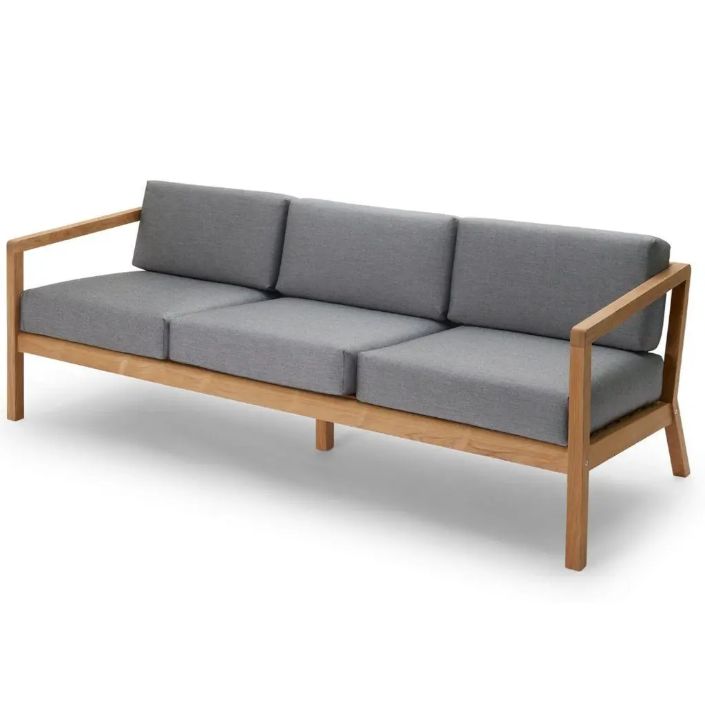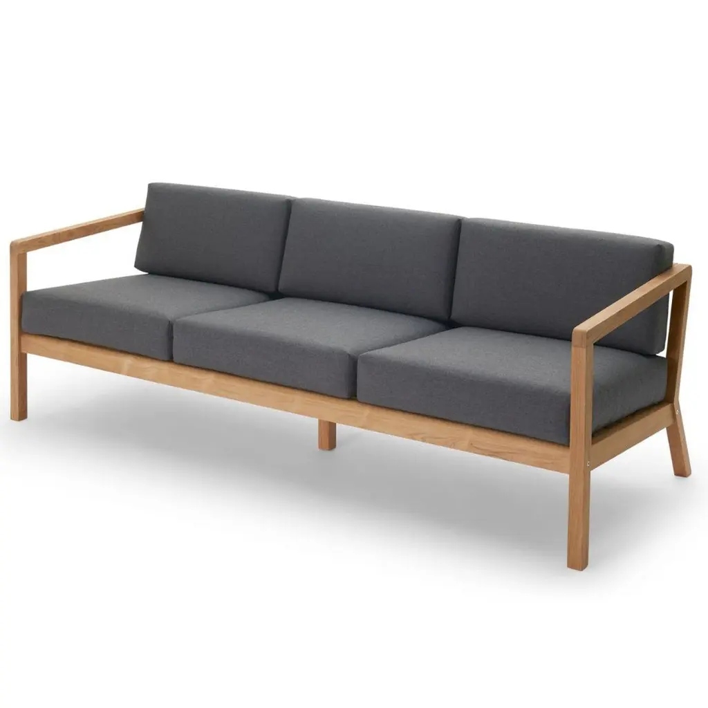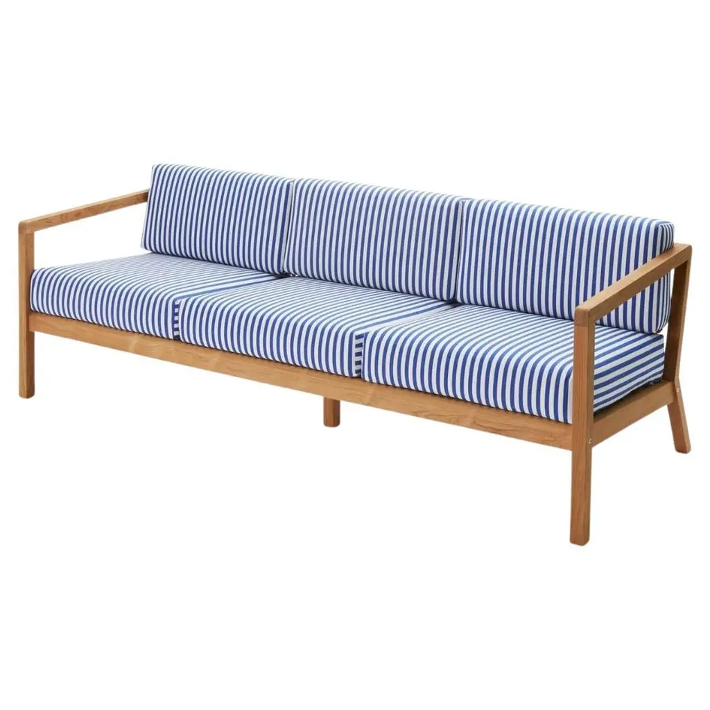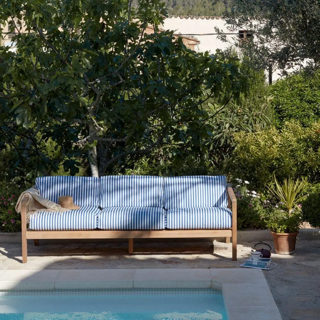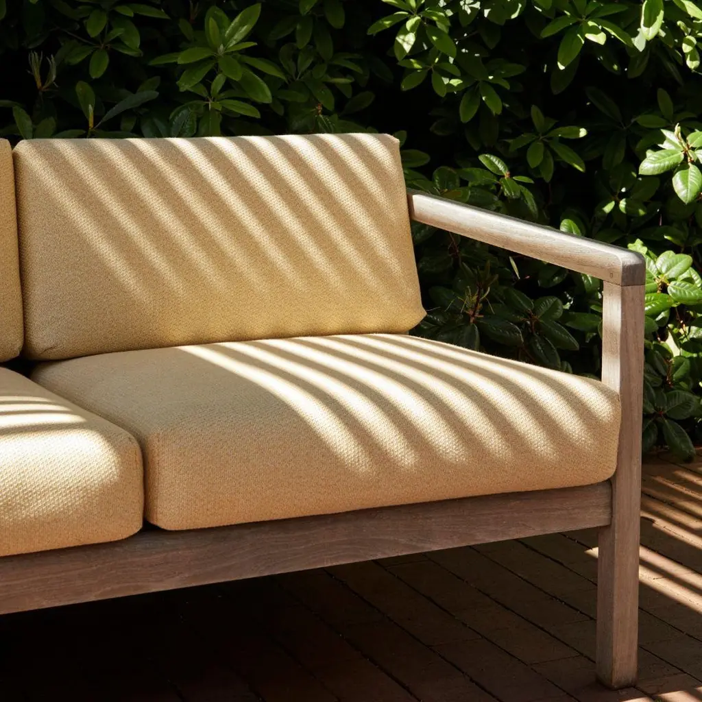 Outdoor 'Virkelyst' 3-seater sofa in teak and honey yellow fabric for SkagerakSkagerak was founded in 1976 by Jesper and Vibeke Panduro, who took inspiration from their love of Scandinavian design and its rich tradition. The brand emphasizes sustainability by using responsibly sourced materials and production methods that minimize waste and reduce environmental impact. Each piece of handcrafted furniture is designed to age with grace and last for generations.Virkelyst is a series of modern outdoor furniture with the seating comfort of indoor furniture. The simple wooden 100% FSC Certified Teak frame strikes a contrast with the thick, soft cushions. Able to withstand wind and weather, the upholstery fabrics are Oeko-Tex certified and extremely color and lightfast as well as water and dirt-repellent and even mildew-resistant. The cushion dries quickly even after heavy downpour, as the foam has an open-cell structure that allows both water and air to pass through. Fabricated to the exacting standards of Skagerak using the highest quality materials available.Price per item. Available to order in unlimited quantities in colors of honey yellow, papyrus, ash, charcoal, white, golden yellow stripe and sea blue stripe. Also available as a 2-seater sofa, chair and pouf - please see our separate listings. This listing is for the 'Virkelyst' 3-seater sofa in honey yellow fabric.