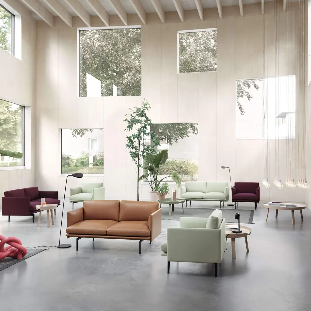 With Studio Sofa, Muuto adapts its Outline series for modern living spaces with their increasingly modest dimensions. Sliming down the proportions, designers Anderssen & Voll retain all of the deeply cushioned comfort of the signature sharply curved and plumped-up cushions, contained in a squared-off silhouette on slender powder-coated aluminum legs. It's all about Nordic nuance and superb craftsmanship, with luxurious upholstery options in fine textiles or sumptuous leather