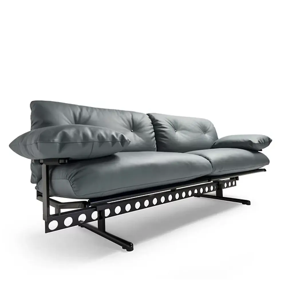 The Ouverture 2 Seater Sofa from Poltrona Frau conducts a triumphant return to inside living spaces. A revival and revisitation of Pierluigi Cerri’s 1982 classic by the legendary designer himself, it enlivens its surroundings with an elevated, industrial appeal that plays with stylistic contrasts and blends in anywhere. Well suited for commercial spaces and refined enough for the home front, it is robust and intricate, with two slender bases fashioned from aluminum holding up a “T-Beam” pierced with circular accents to keep it light. The direct and interconnected metal understructure design elevates a modern sofa designed with contemporary simplicity, while every fine aspect has been designed for comfort and function, appearing to float. It’s enriched with small, well-thought-out details that carry the 1980s design forward, playfully nodding at more traditional designs. The intricate, technical alignment of the support frame positions the seat cushion and backrest in a flawless intersection without gaps, padded with layers of plush foam and goose down, and offering uninterrupted comfort.