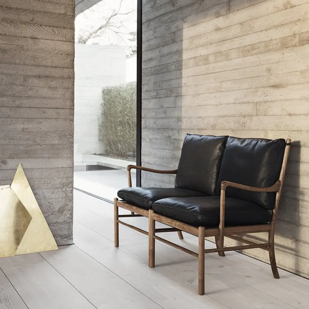 The Colonial Sofa is the two-seated younger sibling to Ole Wanscher's original masterpiece, the Colonial Chair. Introduced in 1964, 15 years after the chair, the Colonial Sofa is based on the same core design as the armchair and clearly reflects Wanscher's penchant for the delicate and refined. The Colonial Sofa also demonstrates the designer's fascination with furniture from 18th century England and bygone colonial times. A beautiful and well crafted sofa with a simple and refined expression, the Colonial Sofa is very stable and has an outstanding finish. The seat is available in a wide range of fabrics and leathers with down mix fill.