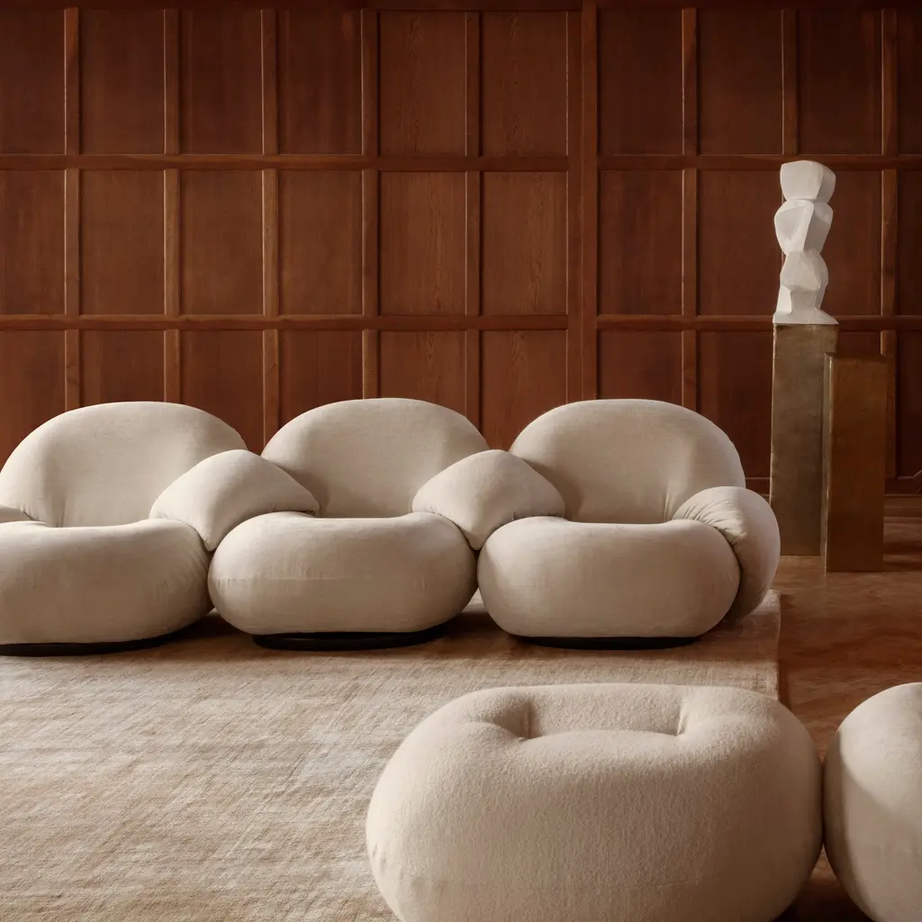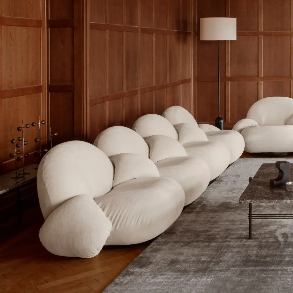 Its low-slung, cloud-like form was originally conceived to break away from the rigidity of post-war design and embrace casual, floor-level seating. This modular sofa supports relaxed lounging while adding character to any space with its organic and sculptural silhouette. Available in various fabric or leather upholstery options, the Pacha 4-Seater Sofa comes in configurations with or without armrests, offering flexibility for different environments. Whether used in a living room or a hospitality setting, the sofa delivers both style and comfort. Designed to cradle the body, its foam-padded curves ensure an inviting seating experience.
