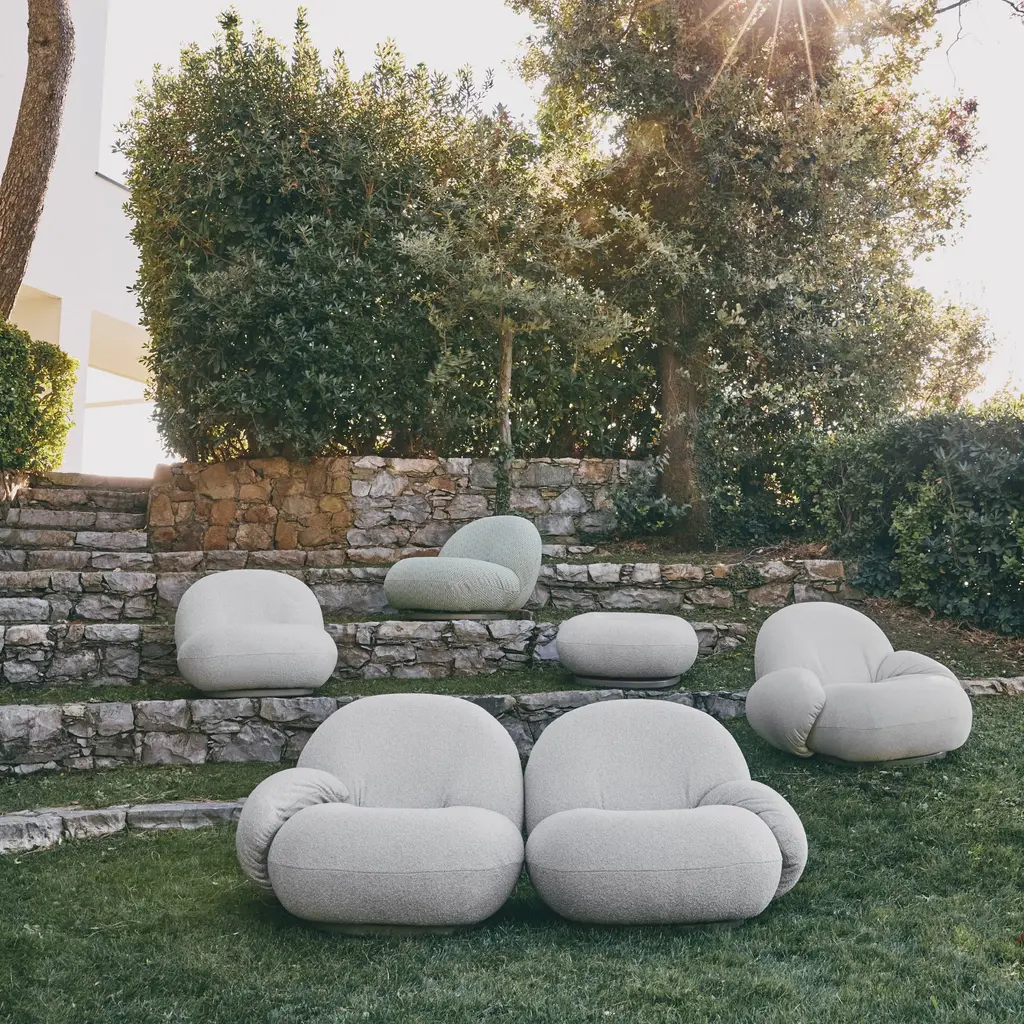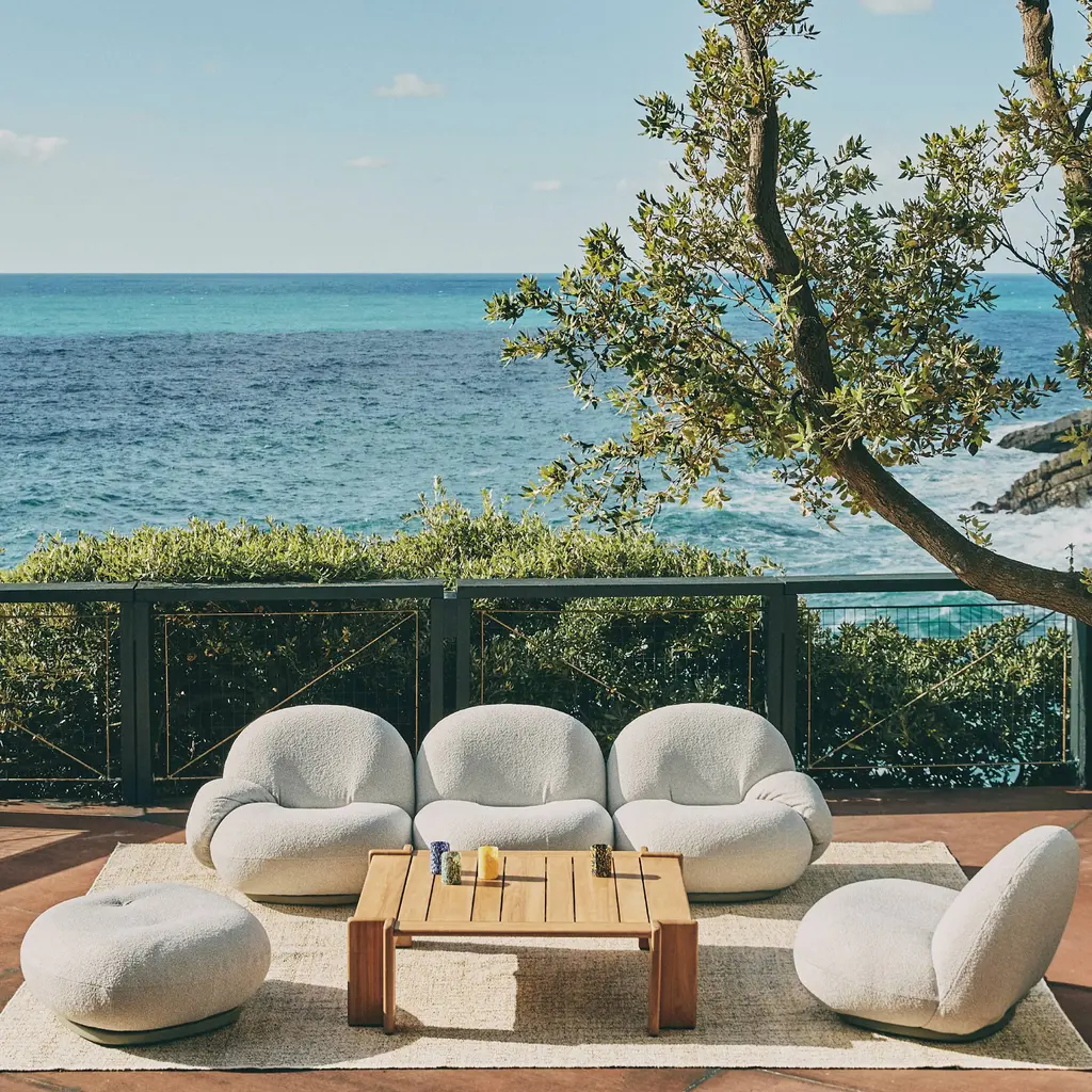 A range of sofa sizes, offered both with and without armrests, anchors the outdoor version of designer Pierre Paulin’s iconic Pacha originally launched in 1975. Gubi’s alfresco seating features a specially developed membrane interlayer that is both water-resistant and breathable for quick drying after exposure to rain, and the base is made from moisture-resistant plywood. Not to mention, the relaxing comfort of the low-slung design — a rarity among outdoor furnishings.