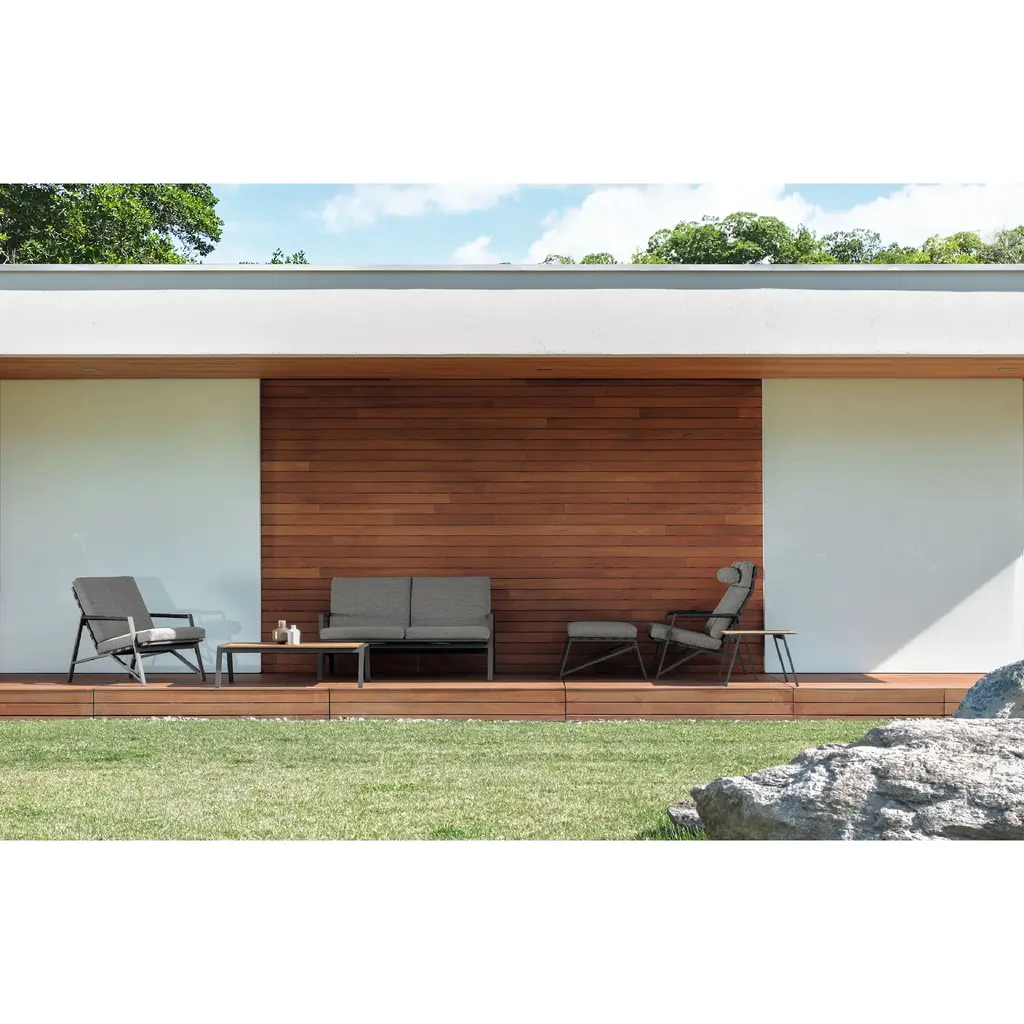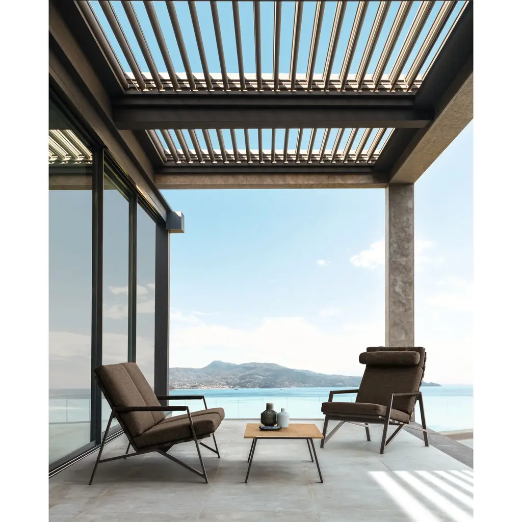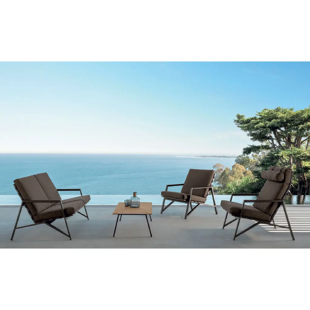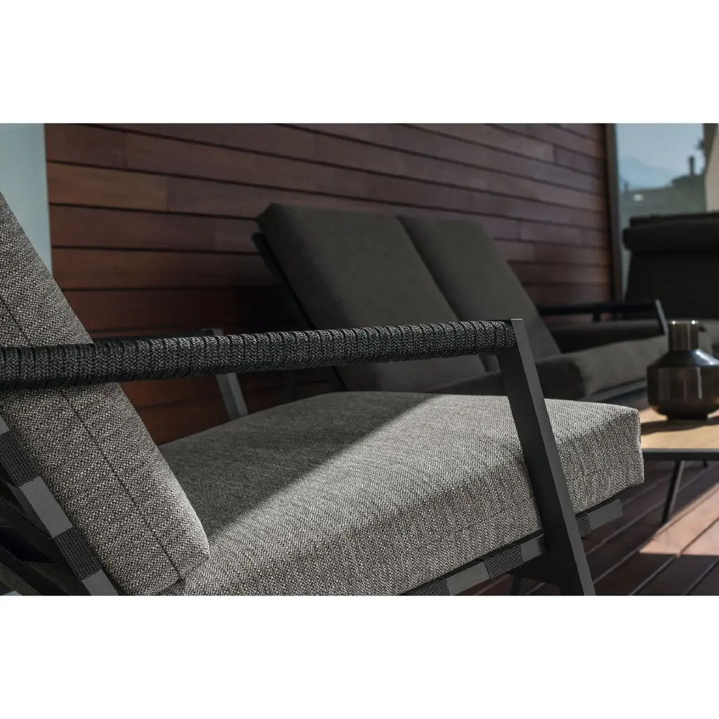 Country spirit for the sofa of the Cottage collection that remind to the Far West seats. In the Cottage sofa the aluminum of the frame and the synthetic belts of the seat and backrest coexist harmoniously with more traditional materials such as the rope placed on the armrests. The cushions are removable, easy to wash and weather resistant. The padding is in quick dry foam.