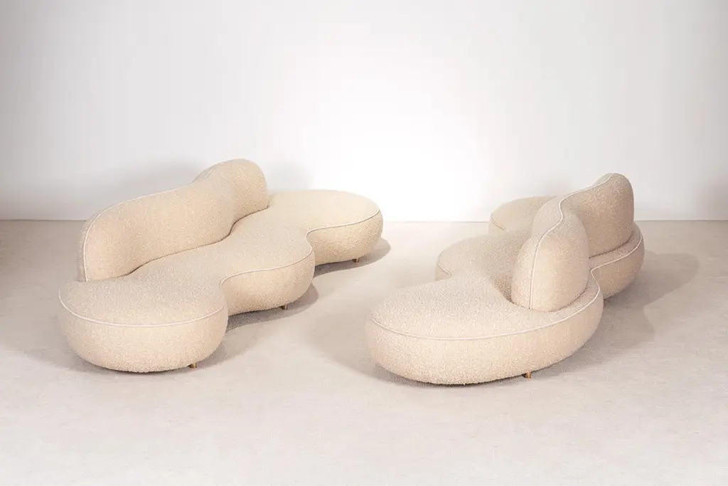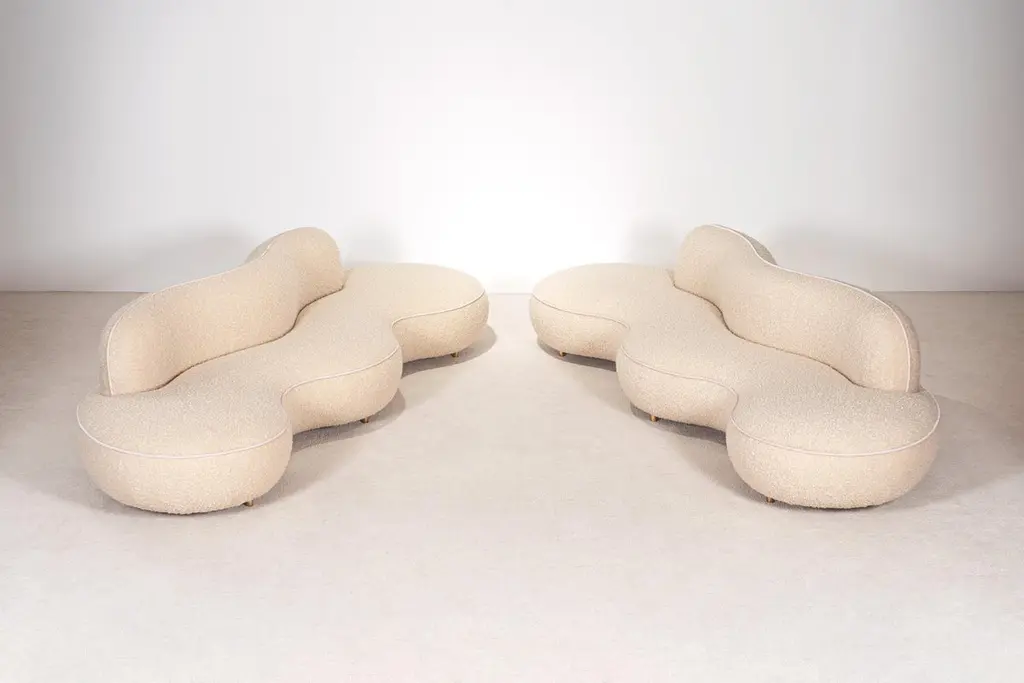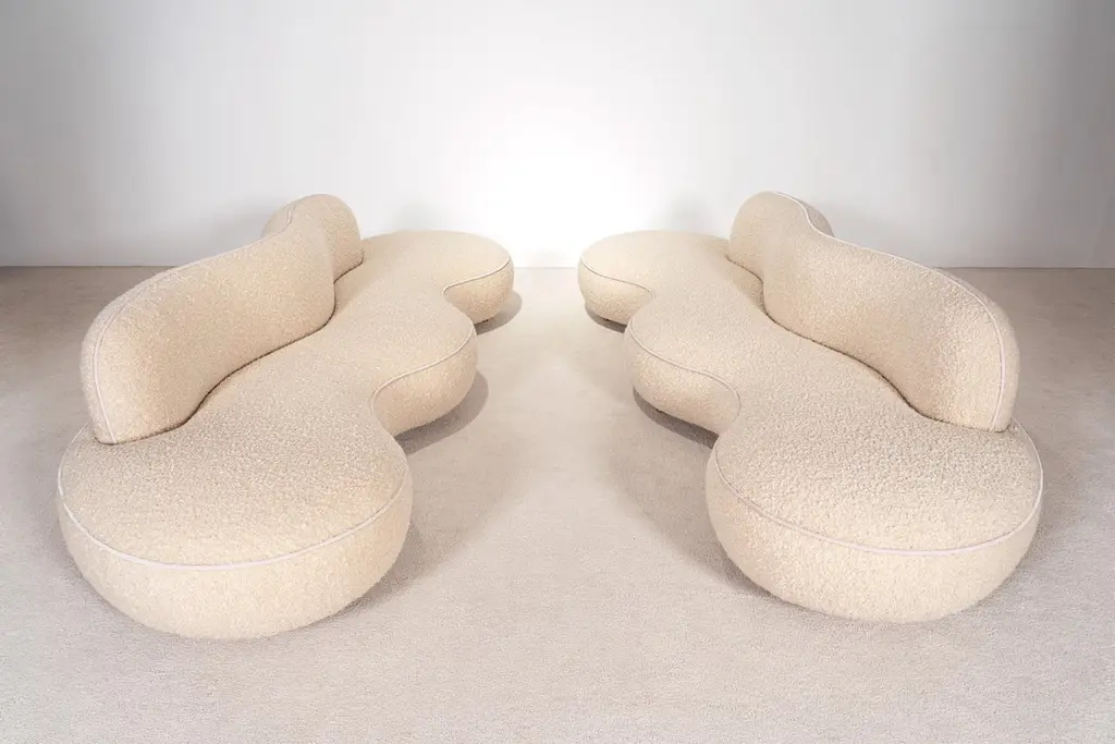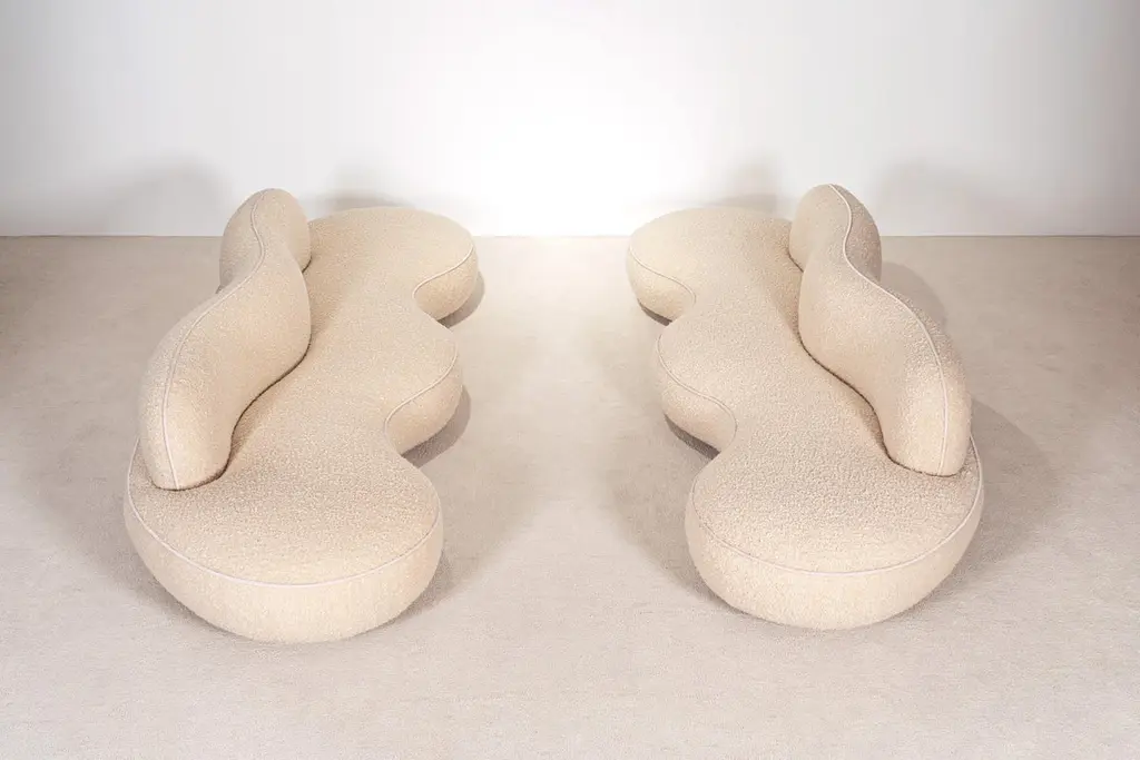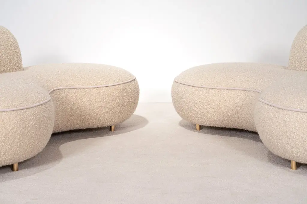 Pair of Jim Sofa XL Size By Proisy Studio.Numbered Edition.The Jim sofa stands as the centerpiece of Proisy Studio’s Modern Cowboy collection, a sculptural oversized curved sofa, 3 to 5-seater piece whose sweeping lines combine comfort, elegance, and craftsmanship. With its remarkable three meters (118 in) in length, Jim is conceived as a generous landscape of seating, designed to define rather than simply furnish a space.Its fluid silhouette, free of sharp angles, unfolds in a continuous curve that invites both conversation and repose. Jim’s sweeping line fosters a natural sense of dialogue and conviviality, a sofa designed not only for comfort, but for presence. Whether placed in a gallery-like setting or a private residence, its scale and rhythm transform the space, turning seating into a sculptural composition.Entirely handcrafted in France, Jim combines an upholstered solid beech wood frame with polished and varnished brass feet, subtly elevating its generous form. The bouclé wool fabric by the French house Nobilis enhances the tactile depth of the piece, echoing the studio’s devotion to materiality and texture.Jim is part of the Modern Cowboy collection, which revisits and pays tribute to the raw elegance of the American West, reinterpreted through a contemporary lens of refined French savoir-faire. Within this family of pieces, which includes the Jane lounge chairs, Jessie stools, and Bonnie daybed, Jim shares their aesthetic vocabulary, built on sculptural balance and material honesty, and stands as a synthesis of architecture, design, and comfort.Each Proisy Studio piece is conceived, drawn, and fully handmade in the brand’s workshops in France, by a dedicated team of artisans combining traditional upholstery and modern cabinetmaking techniques.All creations can be customized upon request, available in a wide selection of fabrics and finishes, as well as COM.The studio regularly collaborates with interior designers and collectors on bespoke adaptations, ensuring each project receives a tailored expression of Proisy Studio’s craftsmanship and architectural sensibility.MaterialsUpholstery on solid beech wood frame.Polished & varnished brass feet.Wool bouclé fabric from Maison Nobilis.DimensionsWidth: 118.11 in (300 cm)Height: 28.35 in (72 cm)Depth: 41.34 in (105 cm)Seat Height: 16.53 in (42 cm)Seat Depth: 22.83 in (58 cm)Weight: 154 lbs (70 kg)Further photos and videos available upon request.All our creations can be shipped worldwide via fully insured express air freight.