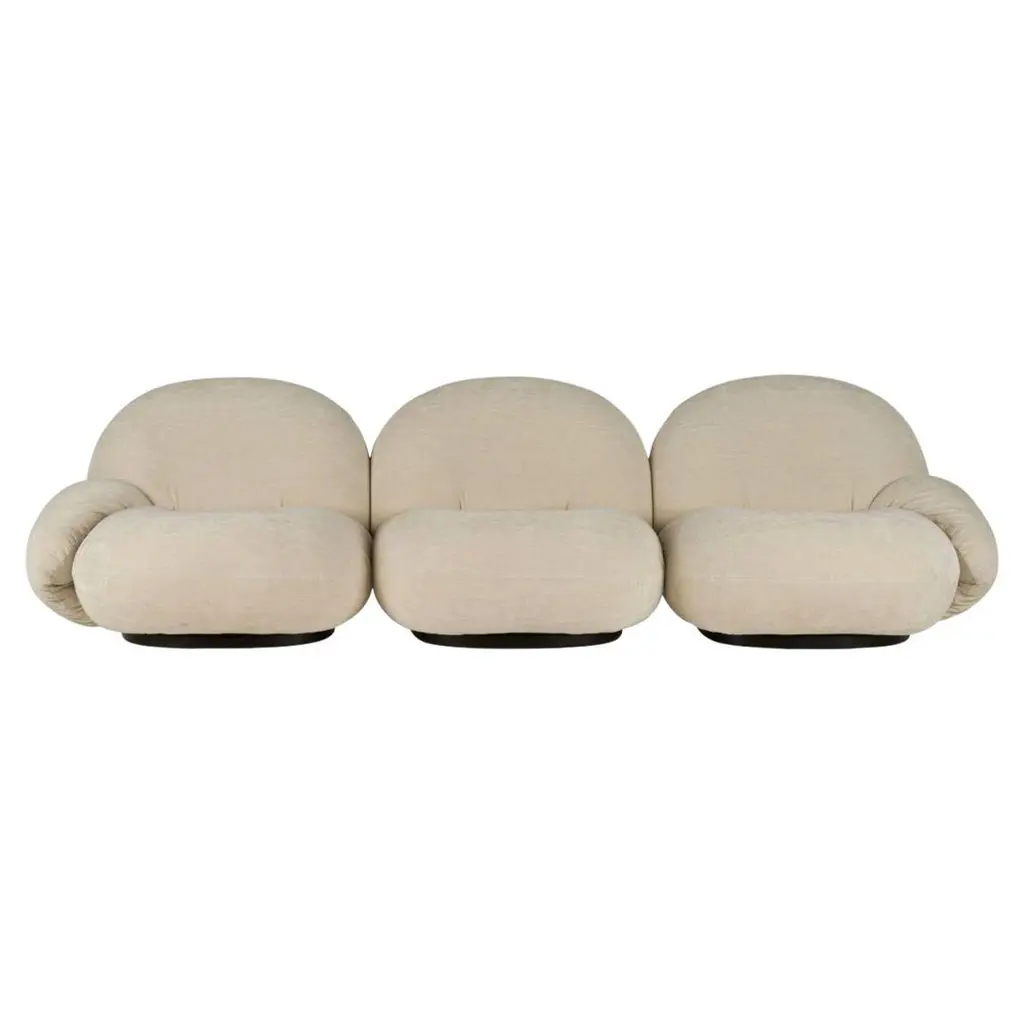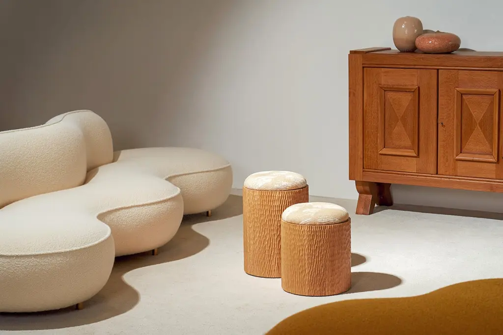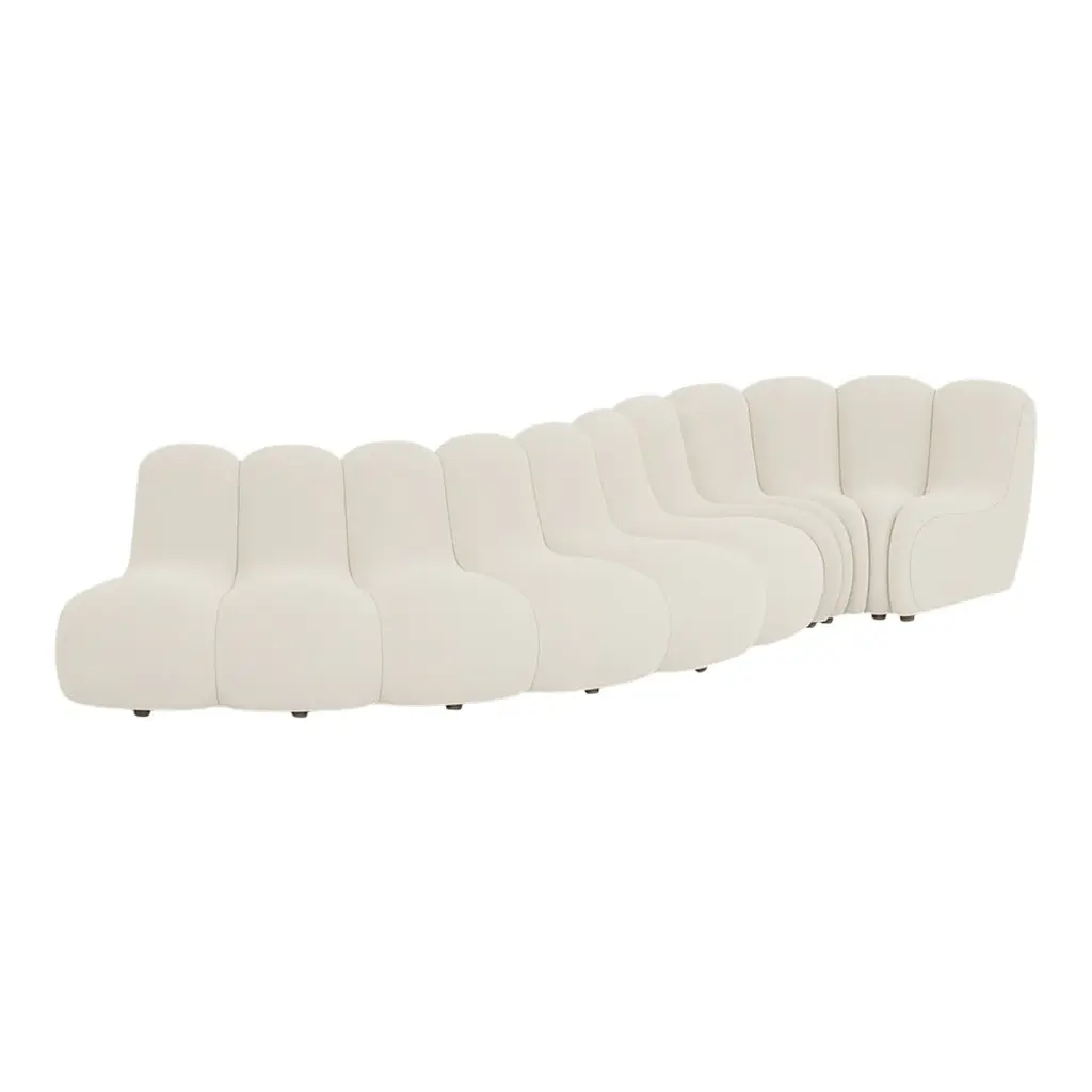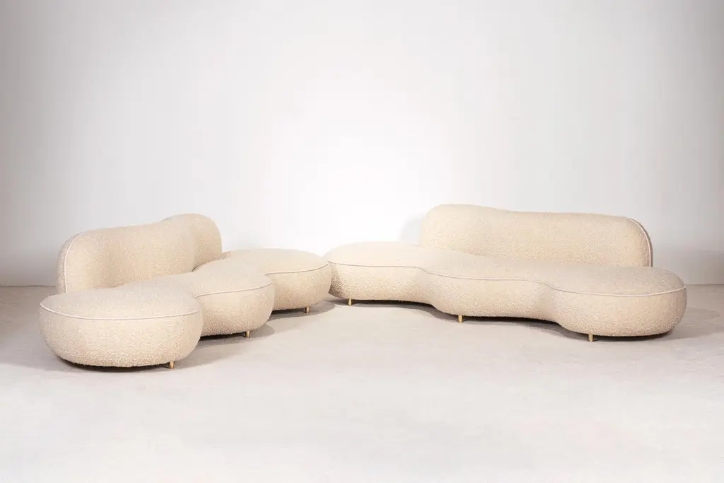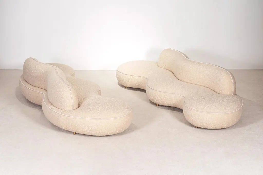 Pair of Jim Sofa XL Size By Proisy Studio.Numbered Edition.The Jim sofa stands as the centerpiece of Proisy Studio’s Modern Cowboy collection, a sculptural oversized curved sofa, 3 to 5-seater piece whose sweeping lines combine comfort, elegance, and craftsmanship. With its remarkable three meters (118 in) in length, Jim is conceived as a generous landscape of seating, designed to define rather than simply furnish a space.Its fluid silhouette, free of sharp angles, unfolds in a continuous curve that invites both conversation and repose. Jim’s sweeping line fosters a natural sense of dialogue and conviviality, a sofa designed not only for comfort, but for presence. Whether placed in a gallery-like setting or a private residence, its scale and rhythm transform the space, turning seating into a sculptural composition.Entirely handcrafted in France, Jim combines an upholstered solid beech wood frame with polished and varnished brass feet, subtly elevating its generous form. The bouclé wool fabric by the French house Nobilis enhances the tactile depth of the piece, echoing the studio’s devotion to materiality and texture.Jim is part of the Modern Cowboy collection, which revisits and pays tribute to the raw elegance of the American West, reinterpreted through a contemporary lens of refined French savoir-faire. Within this family of pieces, which includes the Jane lounge chairs, Jessie stools, and Bonnie daybed, Jim shares their aesthetic vocabulary, built on sculptural balance and material honesty, and stands as a synthesis of architecture, design, and comfort.Each Proisy Studio piece is conceived, drawn, and fully handmade in the brand’s workshops in France, by a dedicated team of artisans combining traditional upholstery and modern cabinetmaking techniques.All creations can be customized upon request, available in a wide selection of fabrics and finishes, as well as COM.The studio regularly collaborates with interior designers and collectors on bespoke adaptations, ensuring each project receives a tailored expression of Proisy Studio’s craftsmanship and architectural sensibility.MaterialsUpholstery on solid beech wood frame.Polished & varnished brass feet.Wool bouclé fabric from Maison Nobilis.DimensionsWidth: 118.11 in (300 cm)Height: 28.35 in (72 cm)Depth: 41.34 in (105 cm)Seat Height: 16.53 in (42 cm)Seat Depth: 22.83 in (58 cm)Weight: 154 lbs (70 kg)Further photos and videos available upon request.All our creations can be shipped worldwide via fully insured express air freight.