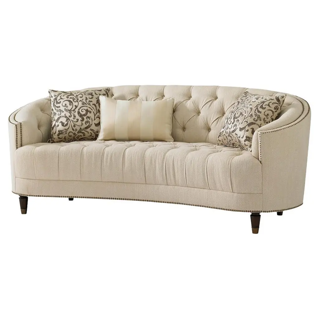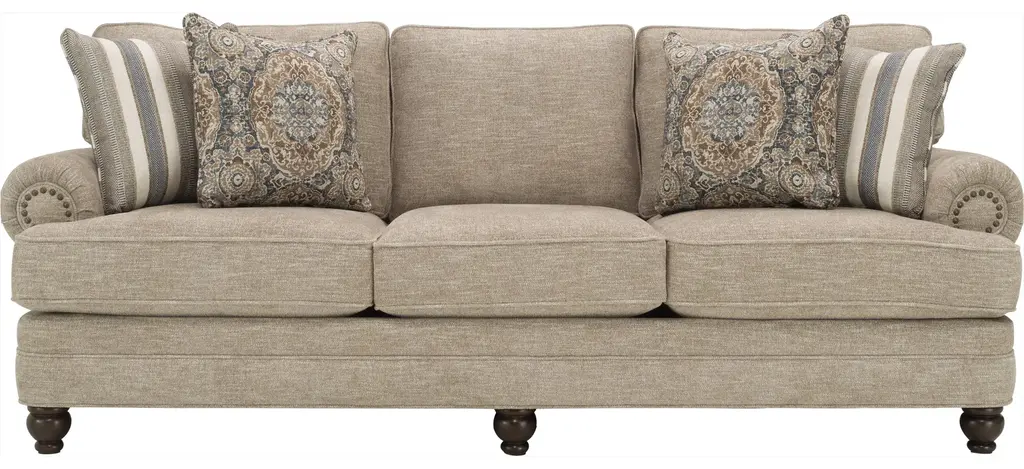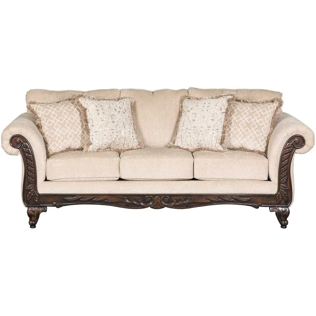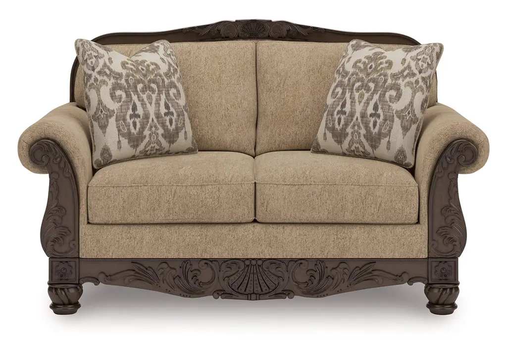 Behold the elegant grandeur of the Palazzo living room collection. This is not merely furniture, it's an heirloom in the making. Dramatic in both stature and execution, the sofa features rolled arms, turned feet, and carved trim with sumptuous chenille upholstery over down-encased cushions for a palatial seating experience at home.