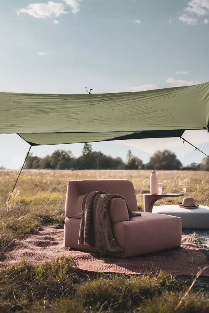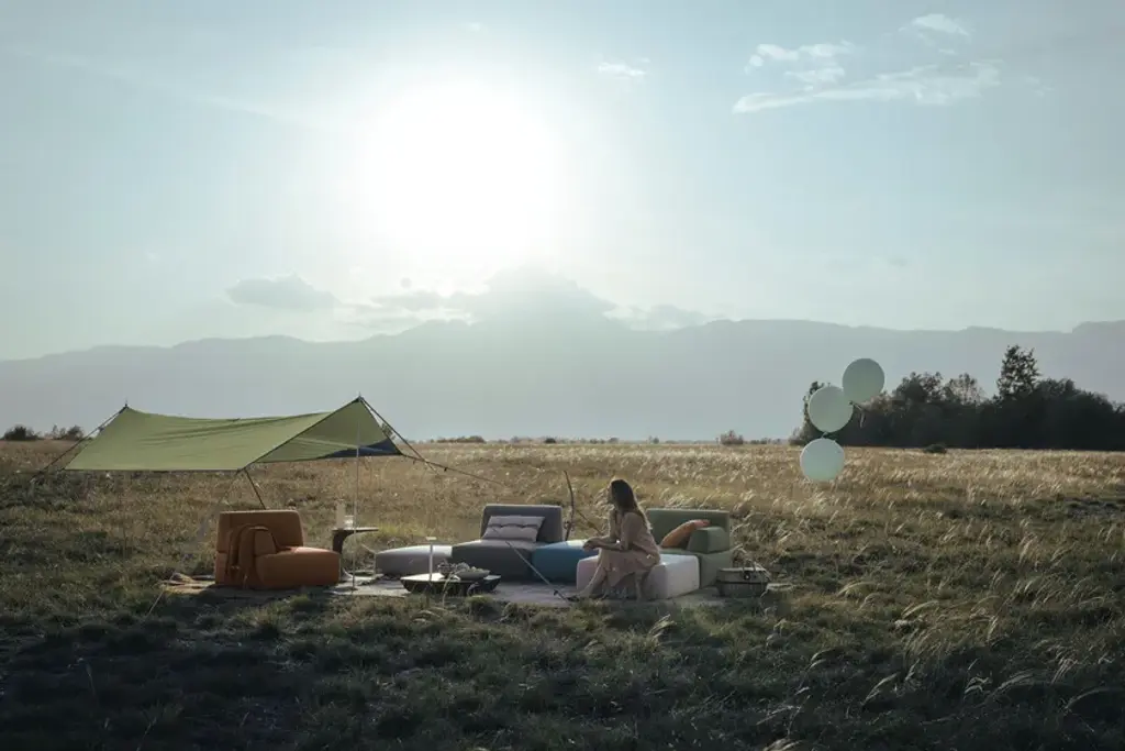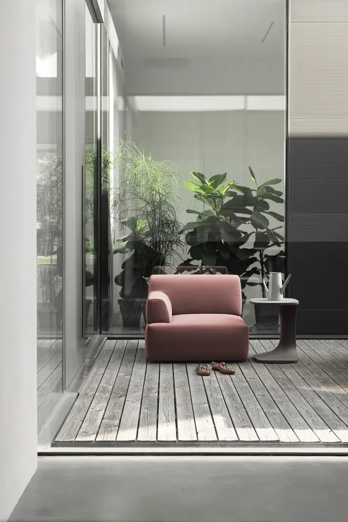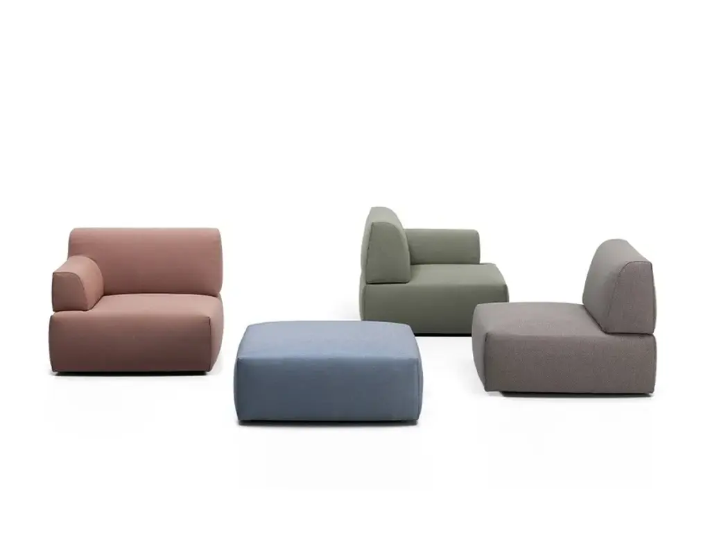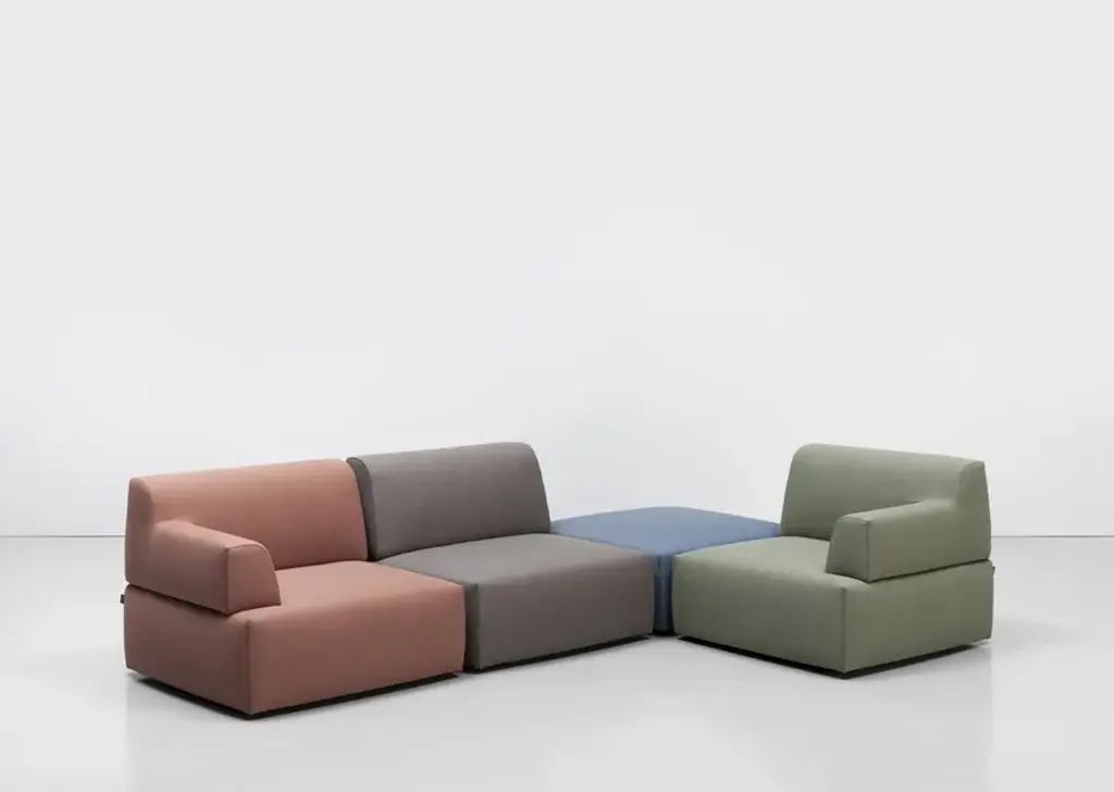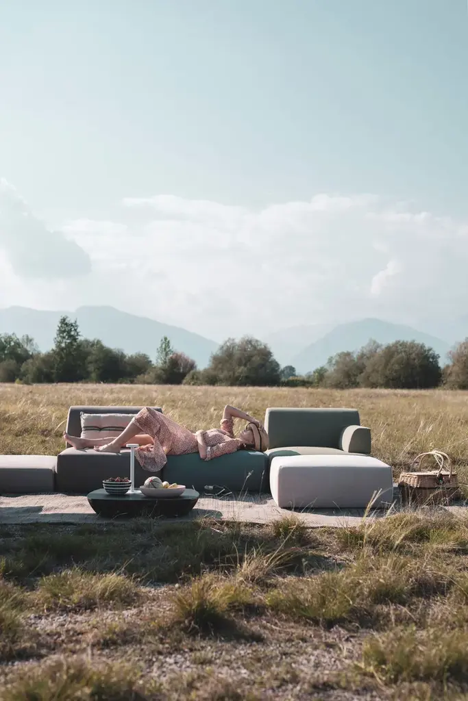 Palchetto is a corner fabric garden sofa.The Palchetto upholstered outdoor seating system is inspired by the architectural elements found in Italian—style theatres, the boxes or “palchetti” where spectators take their seats to watch performances. Consisting of one or more upholstered elements, which can be used alone or combined to create different configurations, Palchetto features a quick coupling and release system between the various modules, which can then be arranged as desired. The seating is soft and comfortable with a memory foam seat and backrest with elastic straps, which echoes the same shapes as Palco, an upholstered outdoor seating system where the seats rest on a platform, and with which Palchetto can be combined.