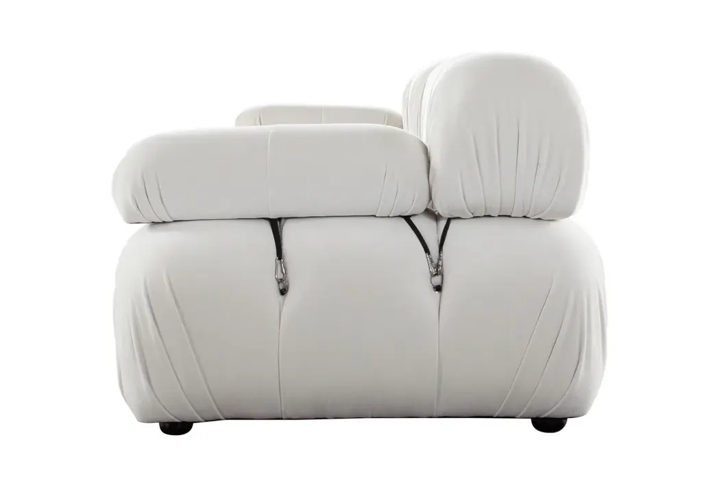 The Paloma makes a statement with its versatile cream velvet upholstery complemented by carabiner attachments for a unique, mixed material design. Its spacious size and plush cushions lend comfort, easily becoming a staple piece in living and media rooms. Pair with the matching ottoman for a complete set. Additional fabrics and configurations available. Please contact support@alicelanehome.com for more information.