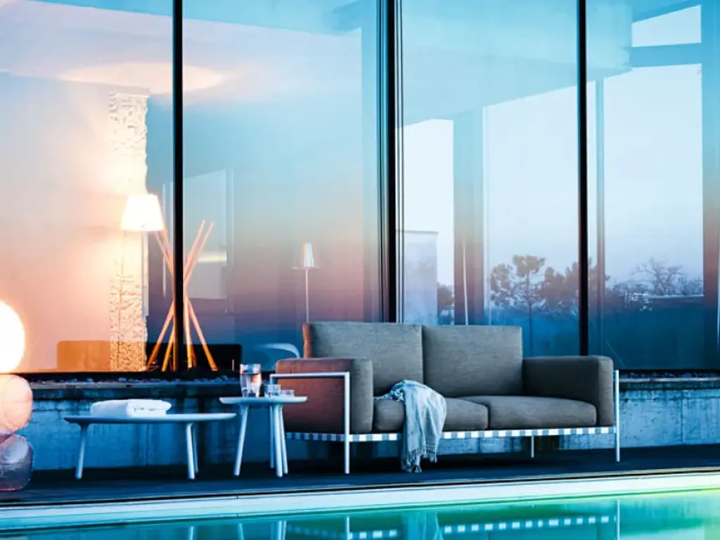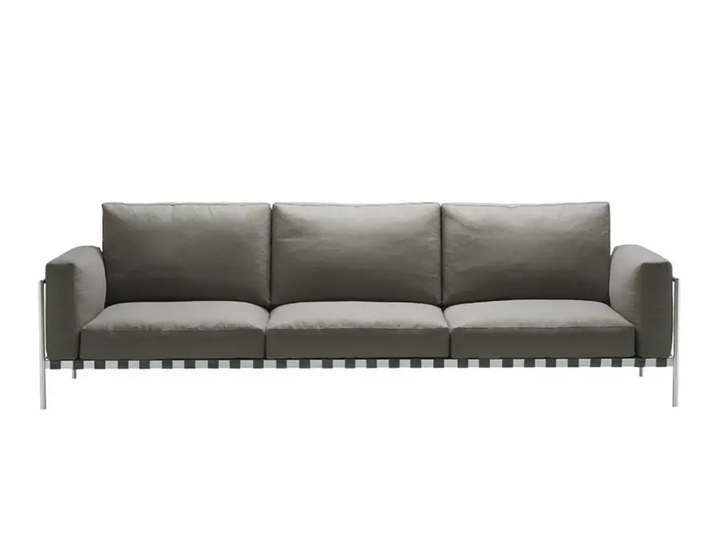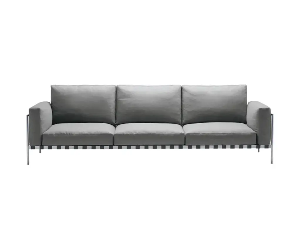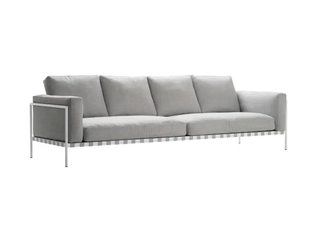 Monobloc sofas and pouf for outdoor useSupporting frame in painted steel for outdoor use in the shade of talc or black. Elastic strips suspension. Seat, back and armrest cushion in open cell reticulated polyether/Paineira, water-repellent vegetal fibre. Removable cover in fabric Talasso.