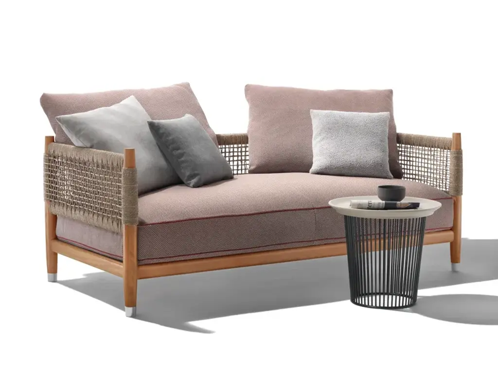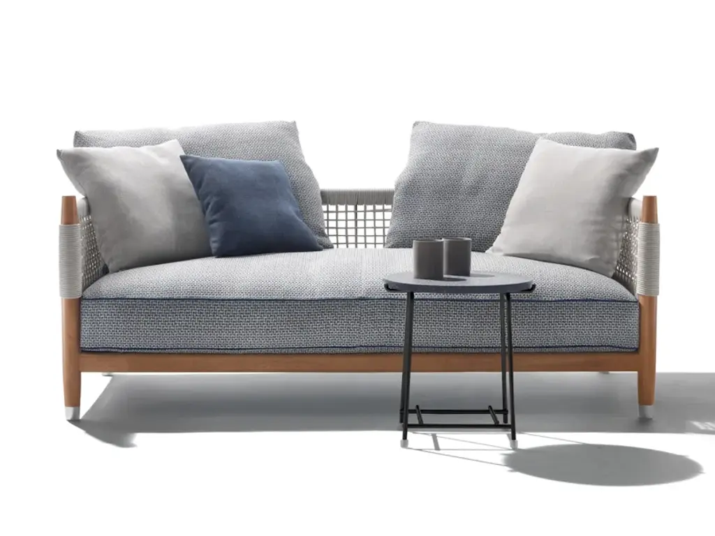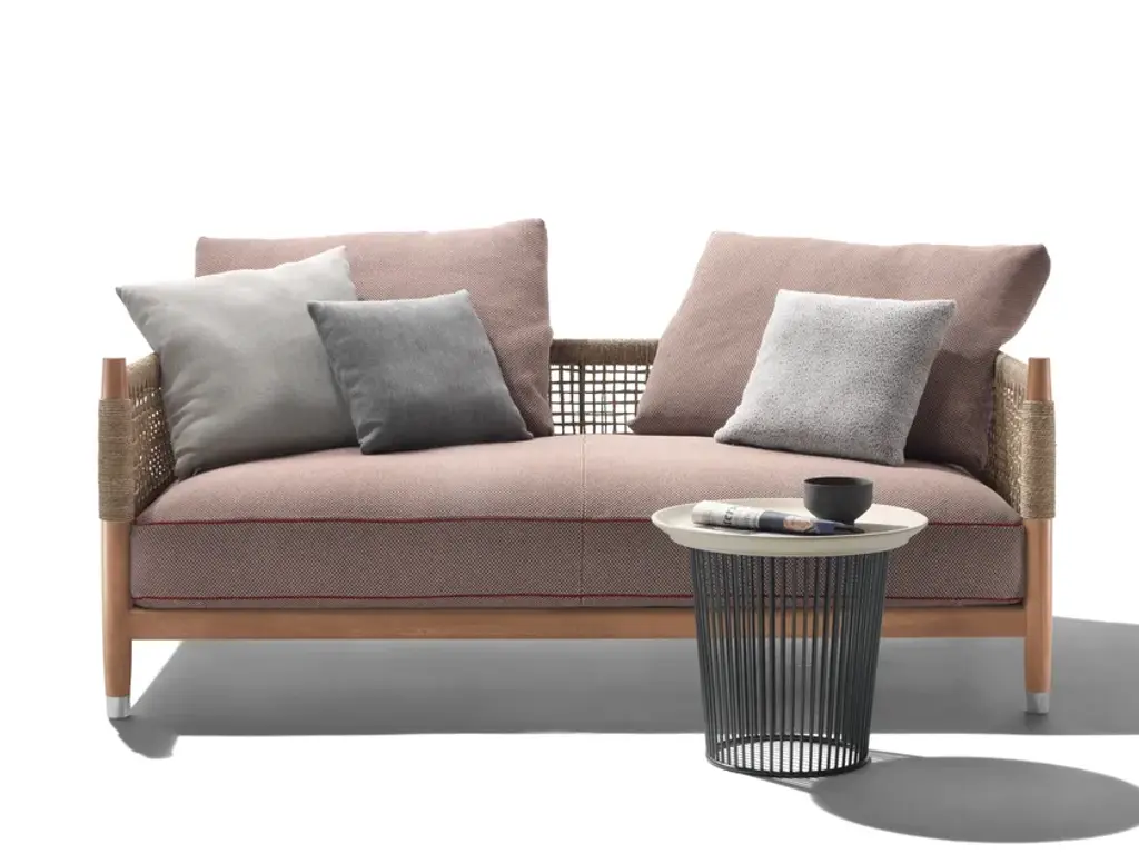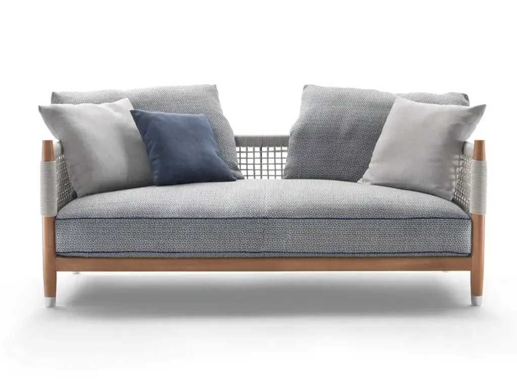 PARKER is a 2 seater fabric garden sofa. The retro influence in the Parker Outdoor sofa is clear. Its graceful lines, the natural wovens and artisan craftsmanship are proof of the savoir faire Flexform is known for. The structure of the Parker Outdoor sofa is made of steel and solid hand-turned and finished iroko wood. Also entirely hand-made is the finely woven material featured on the backrest and armrests. There is a single seat cushion, while large, generously padded loose cushions lean against the cord backrest. The final part of the legs is finished with die-cast metal alloy tips and protective nylon pads. The Parker Outdoor family includes two- and three-seat sofas, an ottoman and an element with a backrest and just one armrest that allows the creation of unique arrangements. If left unused for lengthy periods of time, it is recommended that the cushions be removed and stored in a dry place and that the structure of the Parker Outdoor sofa be protected with its own covers to keep it in top condition and maintain its original appearance as long as possible. Most of the components used in the Parker Outdoor sofa can be recycled.FeaturesStructure: in solid iroko, turned and finished by hand, with steel support frame and water-repellent elastic webbing, anthracite 9005 color. Iroko wood is available in natural finish, stained grey, stained brown or lacquered whiteHand-woven: extruded PVC with nylon core in colors: white 7007, cream 7001, bordeaux 7002, green 7006, brown 7004, anthracite 7005; or in polypropylene cord in colors: white 8007, sand 8001, bordeaux 8002, green 8006, brown 8004, anthracite 8005; or in matt polypropylene cord in colors: straw 8101, natural 8102, ice 8103, anthracite 8105; or in twisted polypropylene cord in colors: straw 8201, vanilla 8202, coffee 8204, liquorice 8205Seat cushion: in polyester fiber with insert in crushproof variable-density material upholstered in water-repellent fabric.Backrest cushions: in polyester fiber with water-repellent upholsteryOptional cushions: in polyester fiber with water-repellent upholstery. Upon request, with upchargeFeet: in die-cast zama, with matt brushed or burnished finish. Rests on tips made of thermoplastic materialUpholstery seat / backrest cushion: in removable fabricUpholstery piping: upholstery detailing includes grosgrain piping that can be crafted in all the colors on the sample boardCover: in waterproof material (cover is upon request)