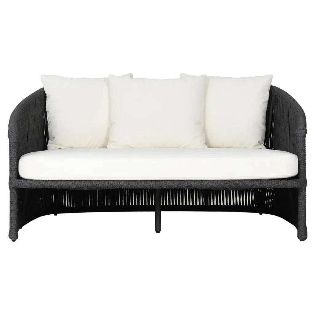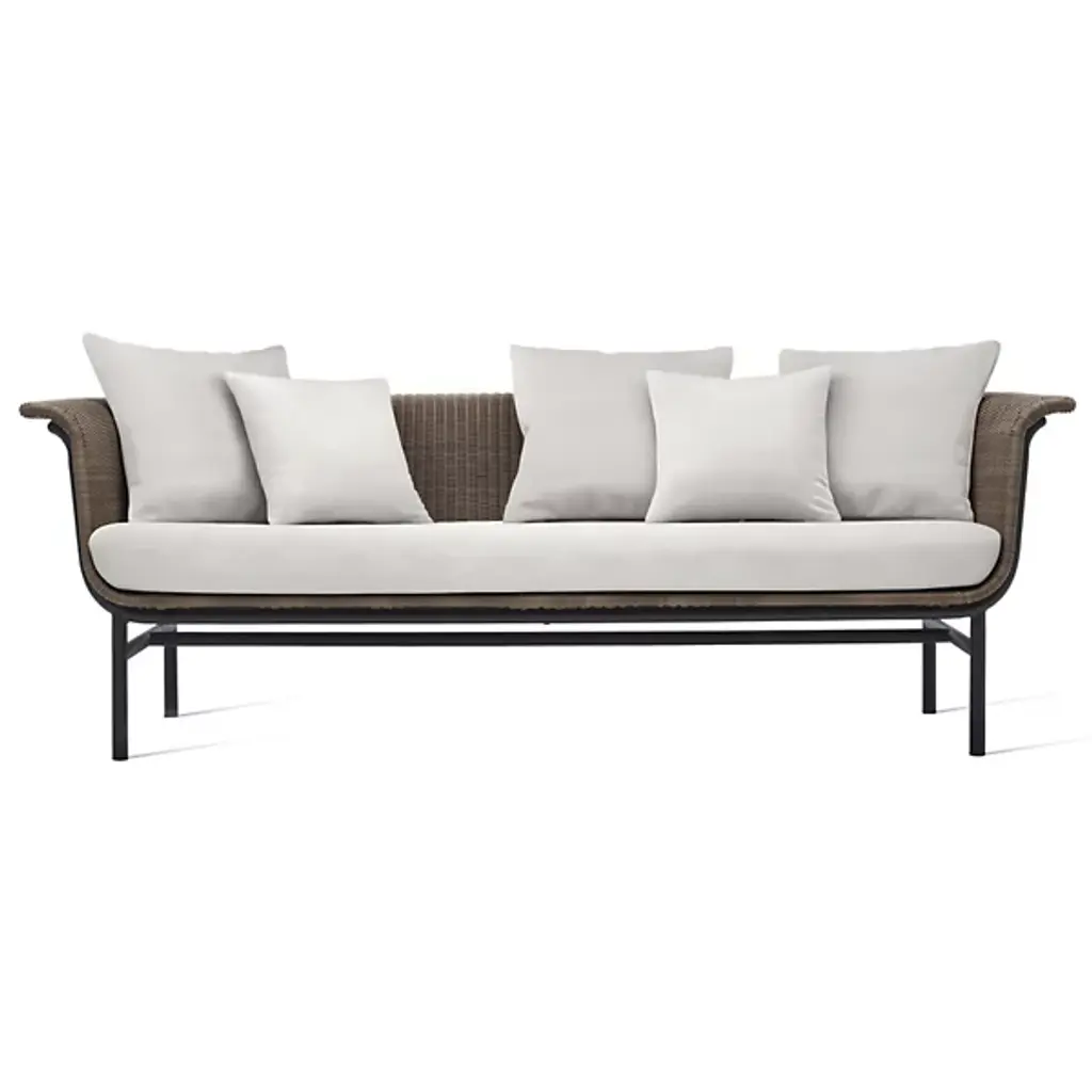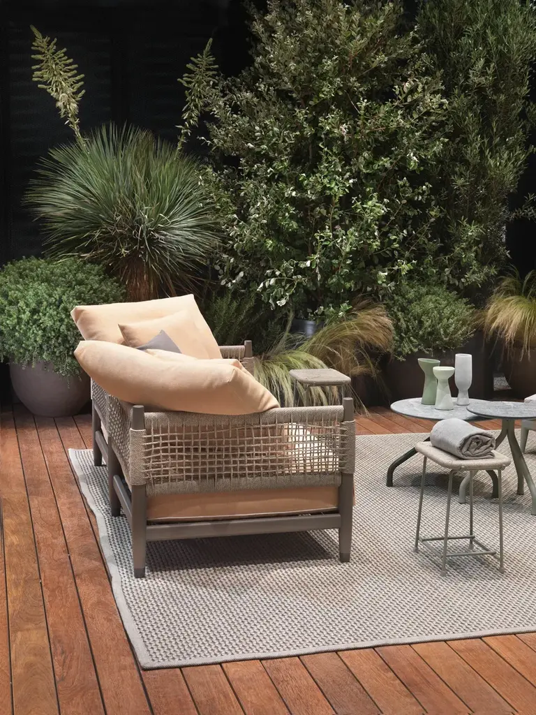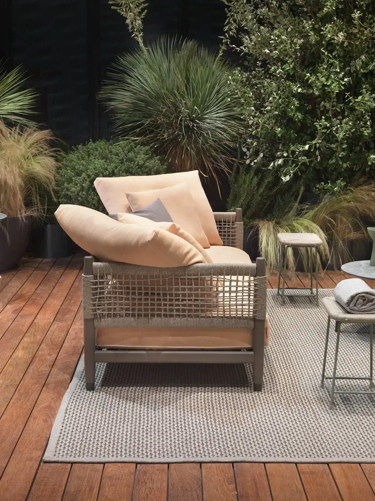 PARKER is a 2 seater fabric garden sofa. The retro influence in the Parker Outdoor sofa is clear. Its graceful lines, the natural wovens and artisan craftsmanship are proof of the savoir faire Flexform is known for. The structure of the Parker Outdoor sofa is made of steel and solid hand-turned and finished iroko wood. Also entirely hand-made is the finely woven material featured on the backrest and armrests. There is a single seat cushion, while large, generously padded loose cushions lean against the cord backrest. The final part of the legs is finished with die-cast metal alloy tips and protective nylon pads. The Parker Outdoor family includes two- and three-seat sofas, an ottoman and an element with a backrest and just one armrest that allows the creation of unique arrangements. If left unused for lengthy periods of time, it is recommended that the cushions be removed and stored in a dry place and that the structure of the Parker Outdoor sofa be protected with its own covers to keep it in top condition and maintain its original appearance as long as possible. Most of the components used in the Parker Outdoor sofa can be recycled.FeaturesStructure: in solid iroko, turned and finished by hand, with steel support frame and water-repellent elastic webbing, anthracite 9005 color. Iroko wood is available in natural finish, stained grey, stained brown or lacquered whiteHand-woven: extruded PVC with nylon core in colors: white 7007, cream 7001, bordeaux 7002, green 7006, brown 7004, anthracite 7005; or in polypropylene cord in colors: white 8007, sand 8001, bordeaux 8002, green 8006, brown 8004, anthracite 8005; or in matt polypropylene cord in colors: straw 8101, natural 8102, ice 8103, anthracite 8105; or in twisted polypropylene cord in colors: straw 8201, vanilla 8202, coffee 8204, liquorice 8205Seat cushion: in polyester fiber with insert in crushproof variable-density material upholstered in water-repellent fabric.Backrest cushions: in polyester fiber with water-repellent upholsteryOptional cushions: in polyester fiber with water-repellent upholstery. Upon request, with upchargeFeet: in die-cast zama, with matt brushed or burnished finish. Rests on tips made of thermoplastic materialUpholstery seat / backrest cushion: in removable fabricUpholstery piping: upholstery detailing includes grosgrain piping that can be crafted in all the colors on the sample boardCover: in waterproof material (cover is upon request)