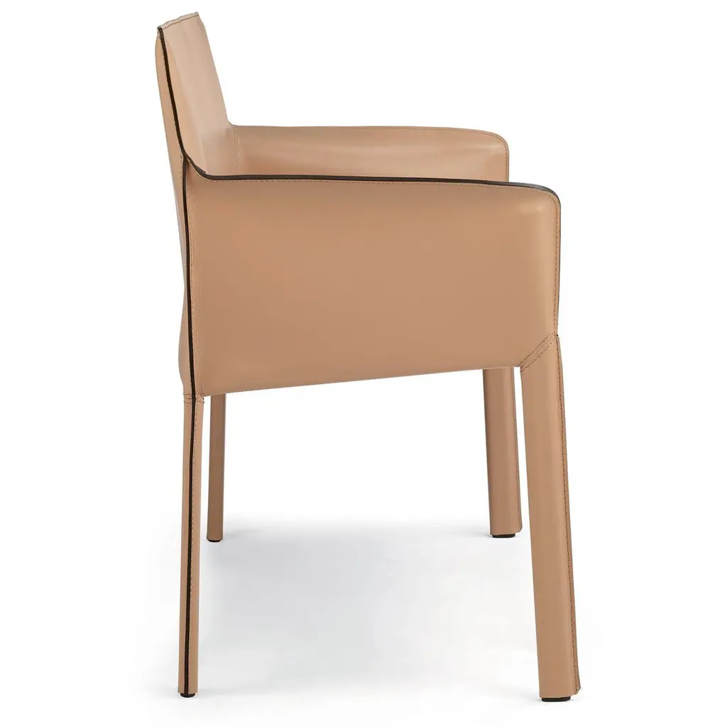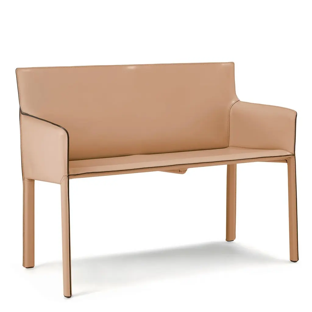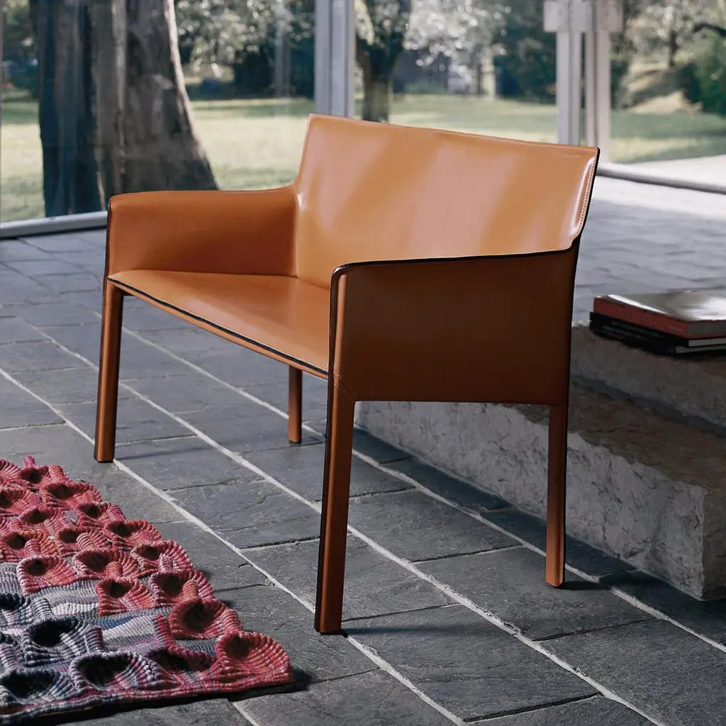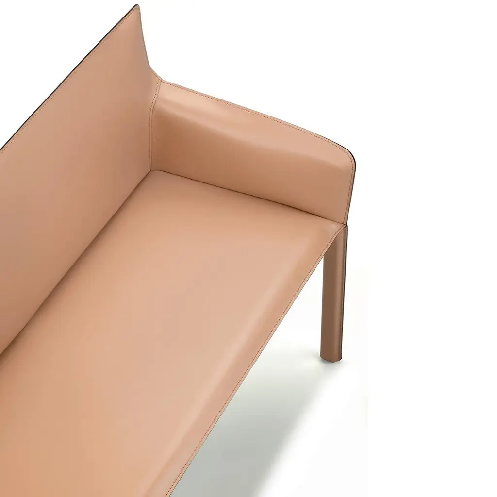 This sofa is completely covered in natural-colored leather. Its thin, minimal structure creates a distinct, striking visual silhouette. Formed from a tubular steel frame, it can be completely customized in terms of color and finishings, making it blend in perfectly with any environment. Price will be quoted upon order.