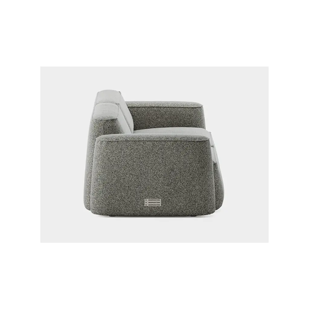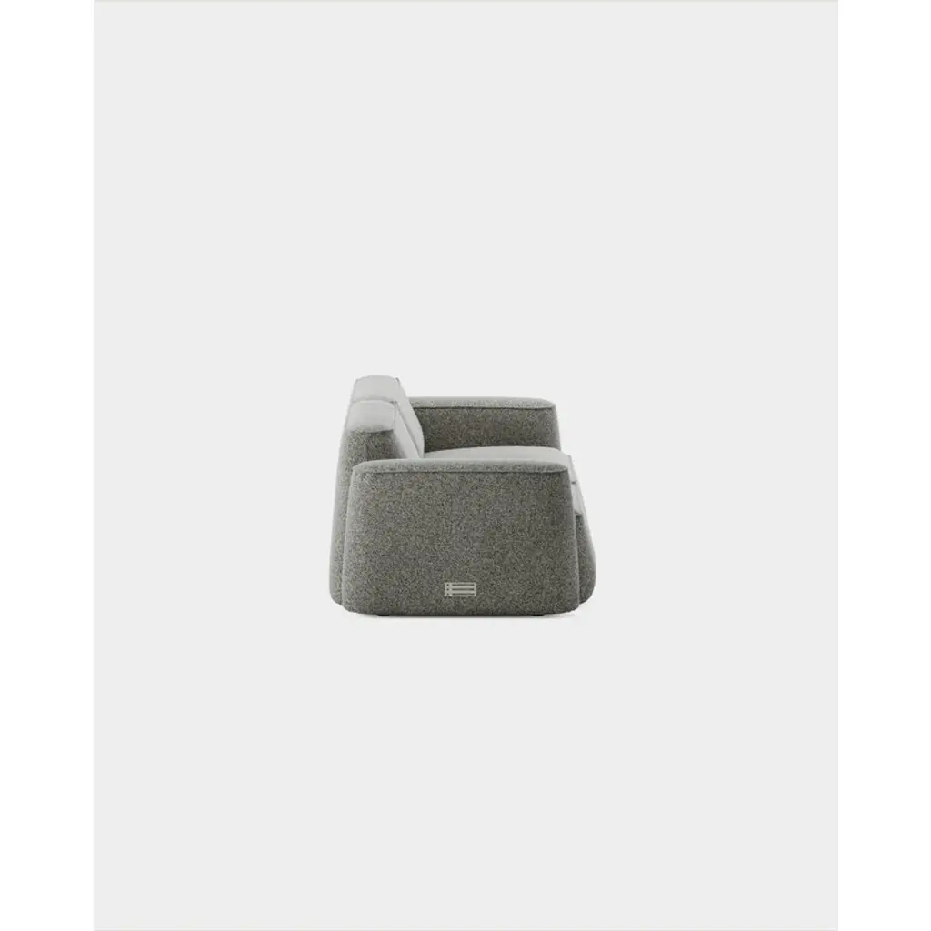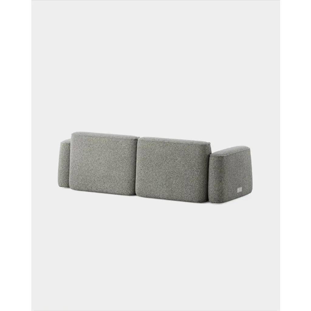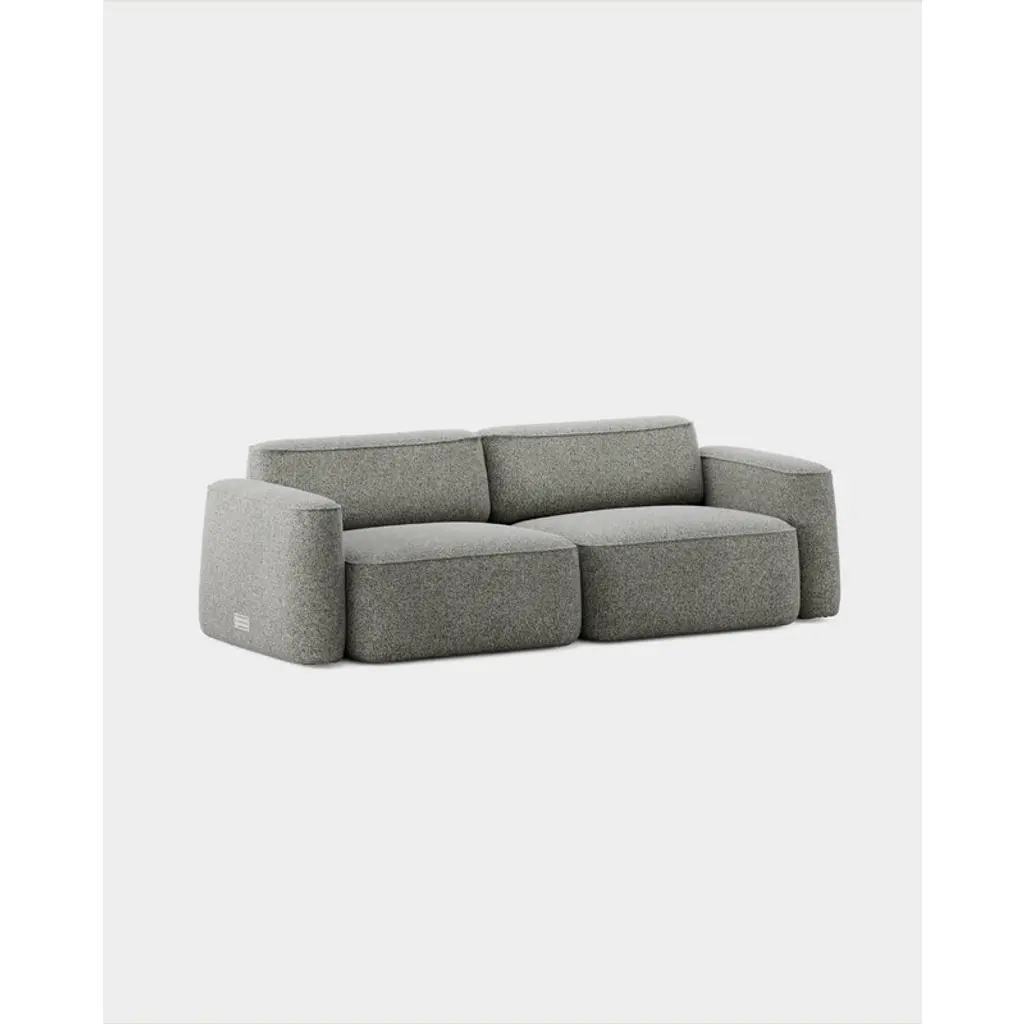 Massproductions' two-seater Patch sofa charms with its invitingly soft feel and the seamless fusion of angular and rounded forms. The secret behind the Patch sofa's comfort lies in its structure: instead of traditional springs and foam, the sofa features pocket springs commonly found in mattresses, ensuring long-lasting buoyancy and comfort across the entire seat. Designed by Chris Martin, the Patch collection embraces a playful esthetic – the sofa's generous shapes draw inspiration from duffel bags, moc toe boots and even sausage strings. The modular Patch system is built from plump components with low, lozenge-shaped backrests that lend the collection a visually lighter look. You can expand the configuration at any time by adding individual modules. This sofa is upholstered in Spiral, a fabric made from recycled materials and characterized by its bold, lively texture created by multicolored, twisted yarns.