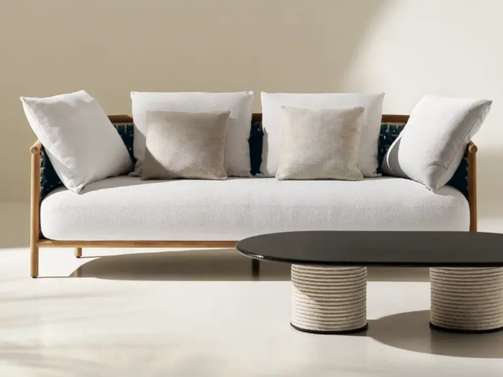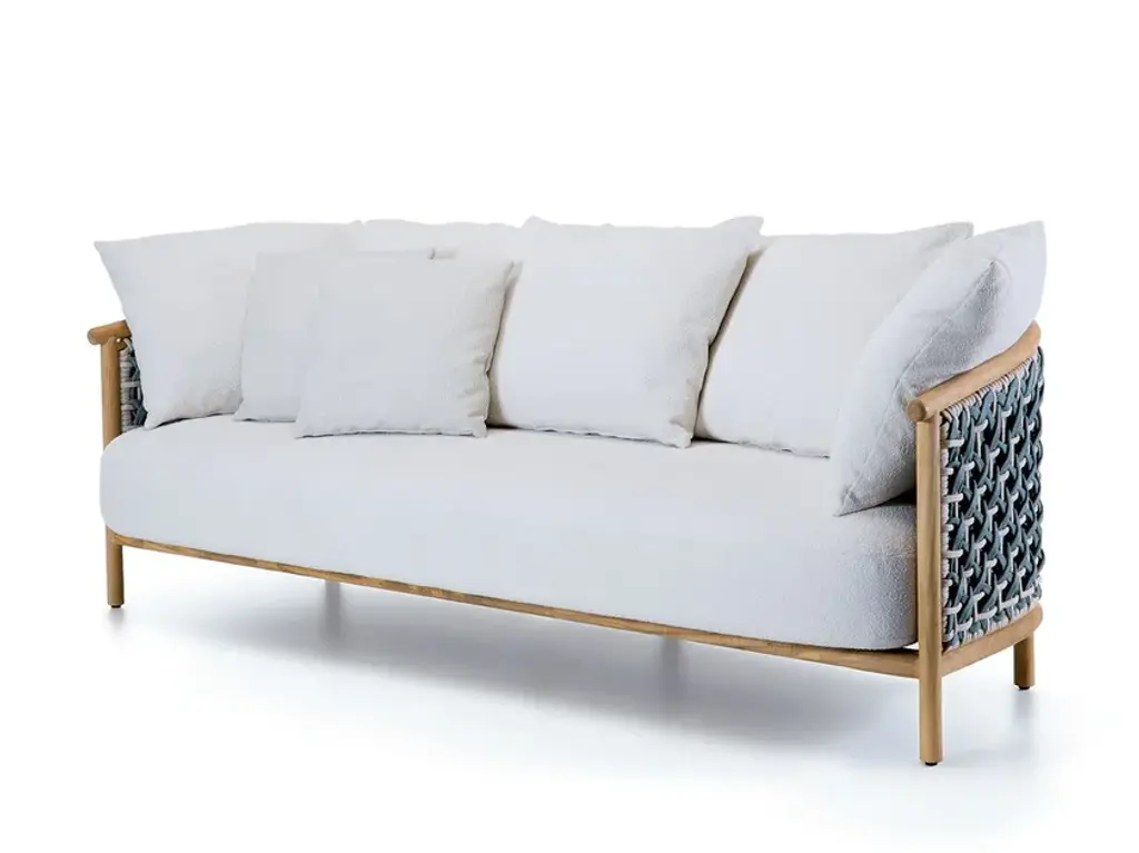 Patio is a three-seater garden sofa with a natural teak frame and backrest in Laguna and Light Grey flat cord. Mother Pearl polypropylene cushions.Patio is a new line of outdoor furnishings that stand out for their creative use of weaving teamed with the natural beauty of teak.Patio is a lounge collection with welcoming shapes and a cocoon function, conceived to hug the body in a comfortable embrace. Its name and special arched weave recalls the traditional inner patios so typical of Spanish architecture, where porticoes and loggias housed the various rooms in the house, opening out onto the uncovered courtyard with pools and fountains decorating the garden.“The Patio collection,” explains Studio Zanellato/Bortotto, “stems from our passion for the variety of weaves and patterns discovered on our travels. We designed a series of motifs as 3D surfaces that could be become the decoration and structure of a series of outdoor seating elements. The latter become true frames in wood and teak into which skilled craftsmen weave close patterns based on our suggestions, tests and inspirations, gathered with this new project in mind for Ethimo.”