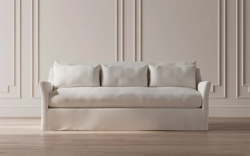 Relaxed yet sophisticated, the 85” Pauline slipcovered sofa features gently sloped, flared arms and an inviting bench seat. A crisp slipcover grazes the floor, lending casual appeal to the charming silhouette. Soft yet supportive, the seat cushion is designed for plush comfort, with a foam core surrounded by a blend of fiber, down, and feather fill. Lumbar pillows are layered in front of the back pillow for a cozy, tiered effect. Choose from washable slipcover fabrics in a variety of serene hues.