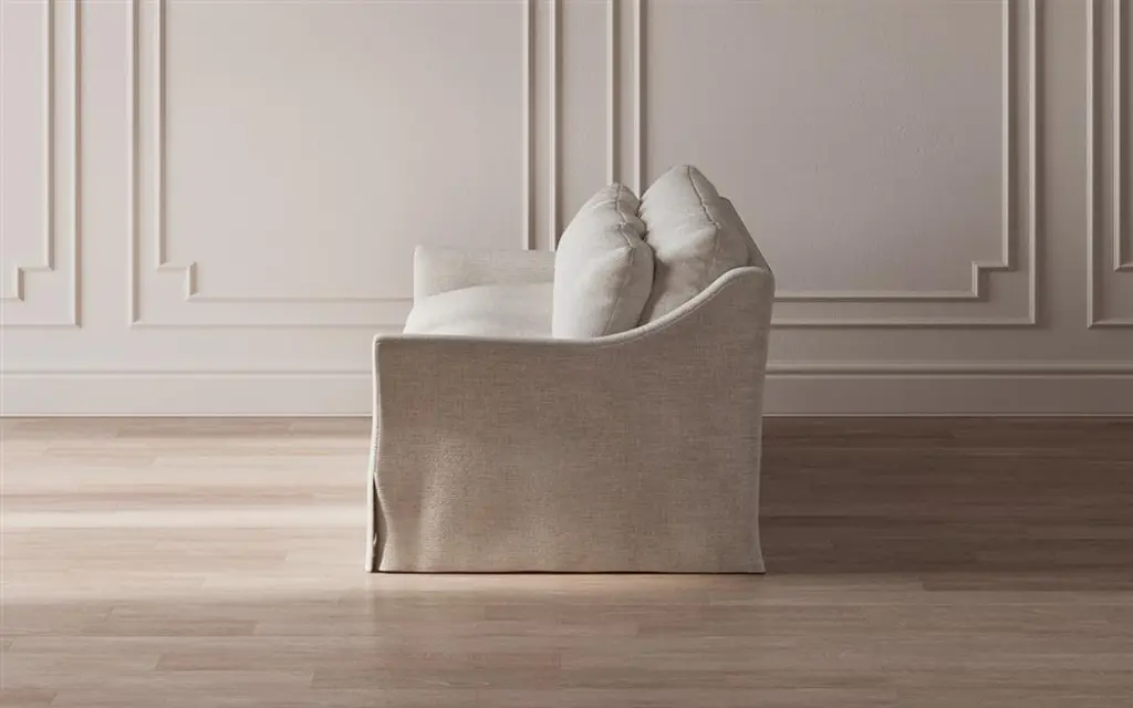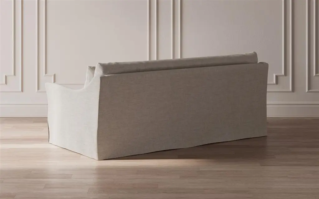Relaxed yet sophisticated, the 85” Pauline slipcovered sofa features gently sloped, flared arms and an inviting bench seat. A crisp slipcover grazes the floor, lending casual appeal to the charming silhouette. Soft yet supportive, the seat cushion is designed for plush comfort, with a foam core surrounded by a blend of fiber, down, and feather fill. Lumbar pillows are layered in front of the back pillow for a cozy, tiered effect. Choose from washable slipcover fabrics in a variety of serene hues.