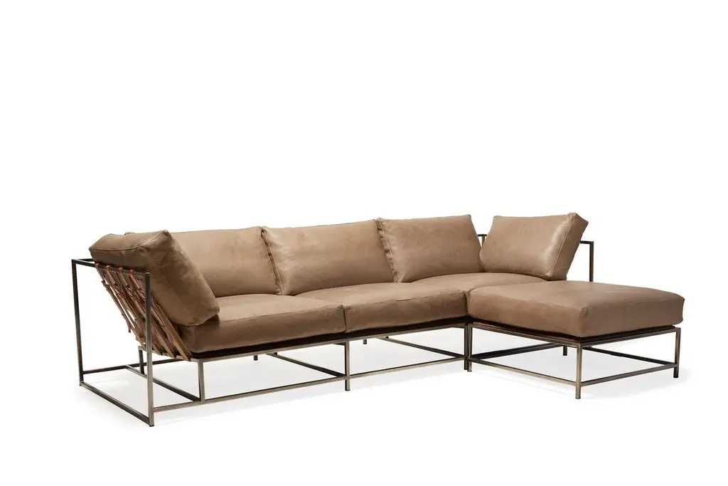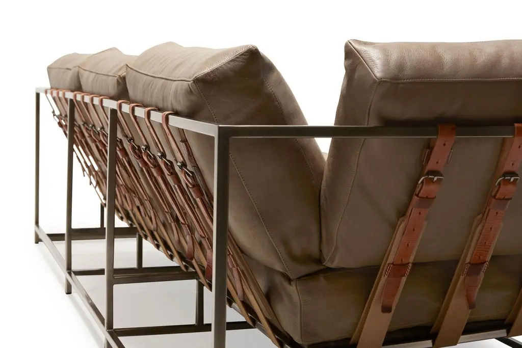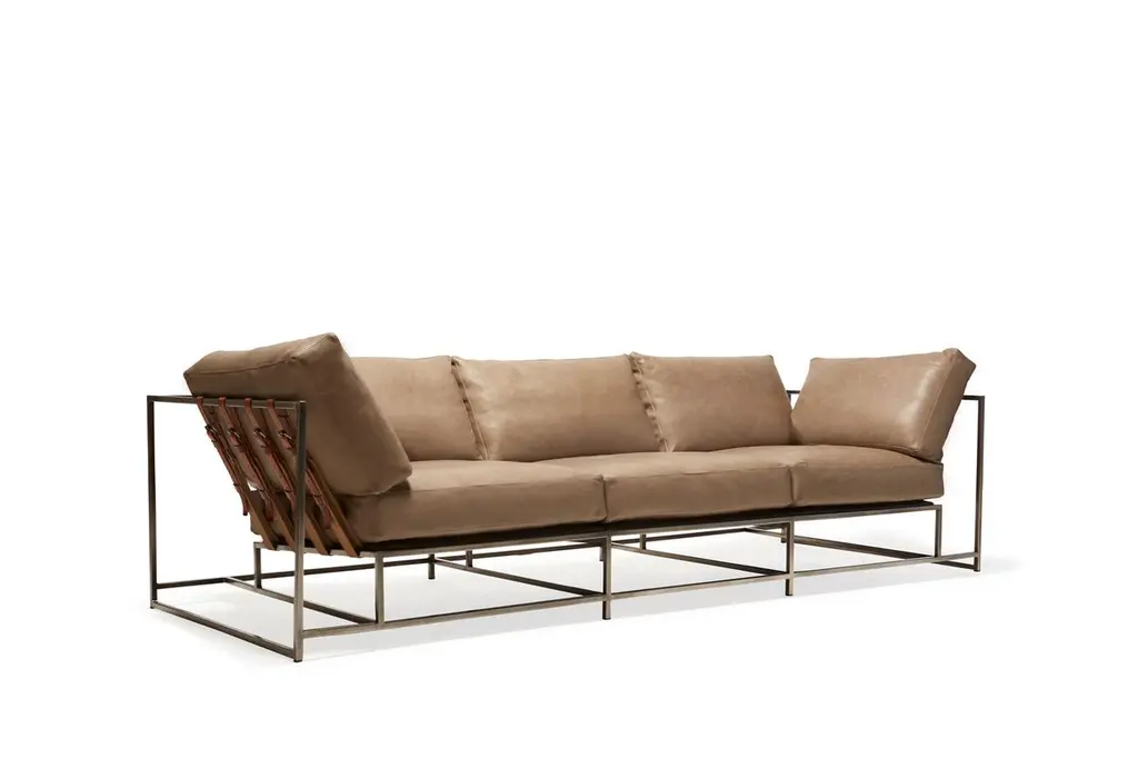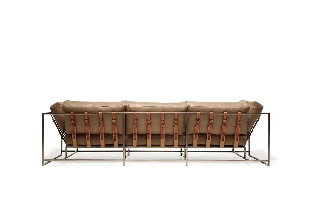 The Inheritance Sofa by Stephen Kenn is as comfortable as it is unique. The design features an exposed construction composed of three elements - a steel frame, plush upholstery, and supportive belts. The deep seating area is perfect for a relaxing lounge experience. Every Stephen Kenn piece is made to order through our Los Angeles studio in partnership with a number of small businesses and fabricators in the LA area. With this highly customizable sofa you can select from a wide range of finishes and materials to complement your home and lifestyle - please message us to see our Customization Guide with all available options.This version of our Inheritance Sofa is upholstered in putty leather from the Harness Collection by Moore & Giles. The foam seat cushions have been wrapped in down for added softness and comfort. Sitting atop an antique nickel plated frame, the sofa is strapped with support belts featuring taupe cotton webbing, aged veg tan leather, and antique brass buckles.