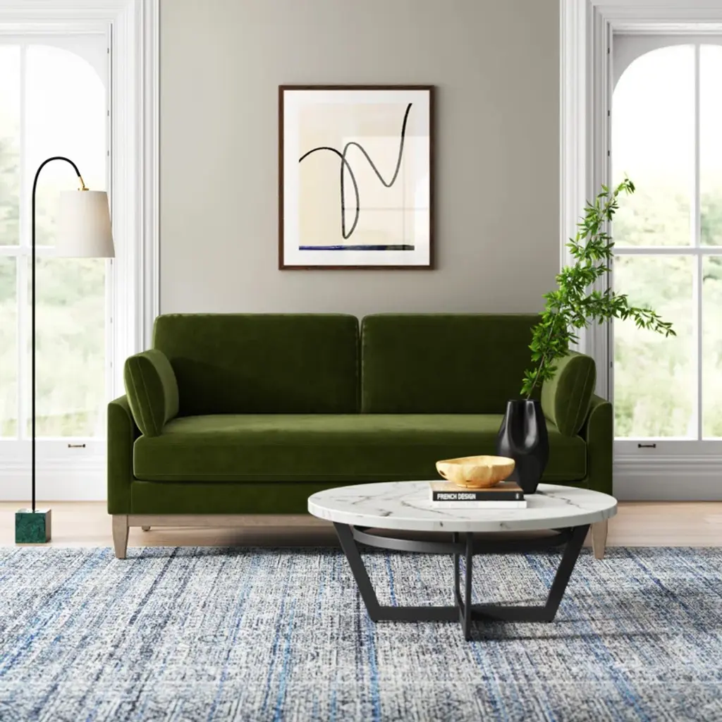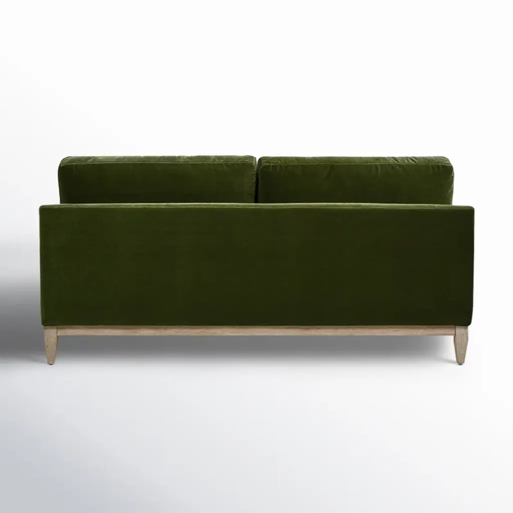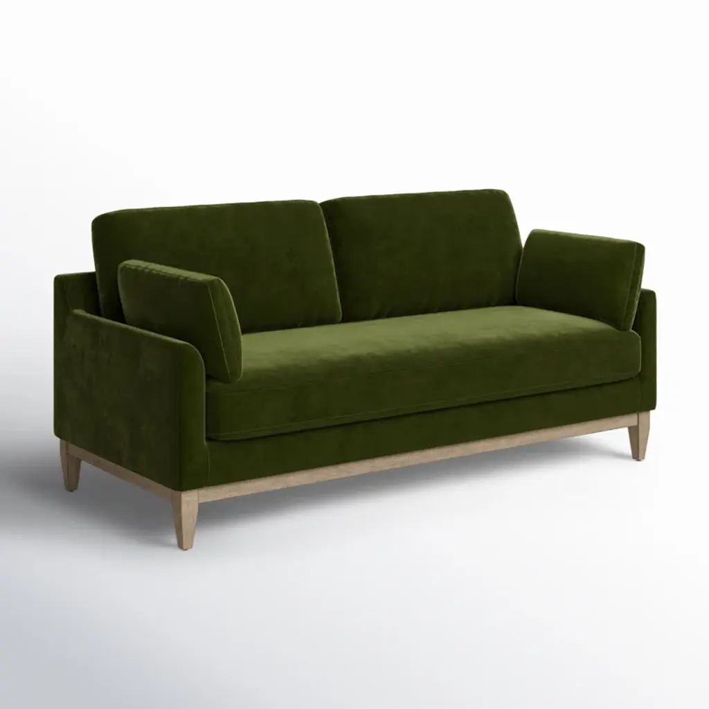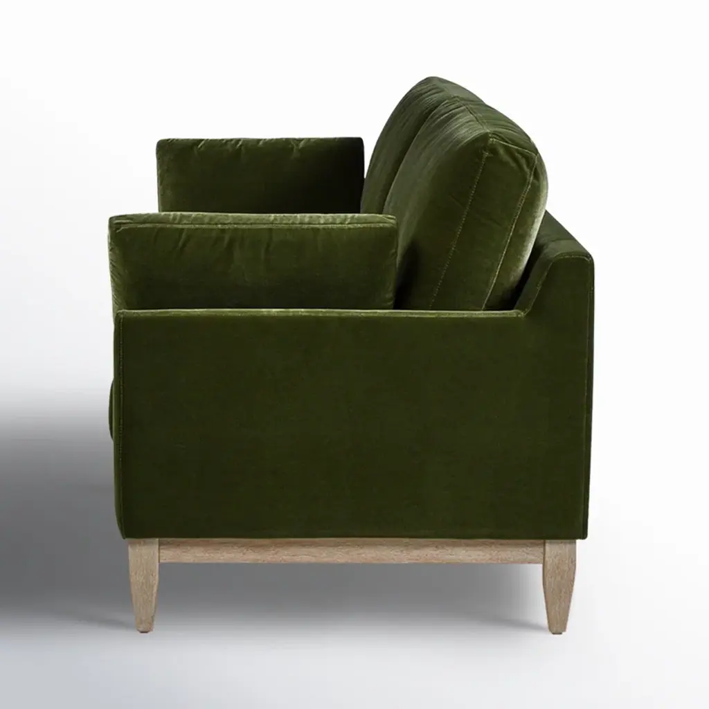 This sofa combines minimalist design with luxe velvet upholstery, making it a standout piece for your home. It features a compact wood frame, flared arms, and brown wood legs, highlighting an organic mix of materials. The foam-filled seat and loose back cushions offer sink-in comfort, while feather-blend arm pillows add extra texture and coziness.