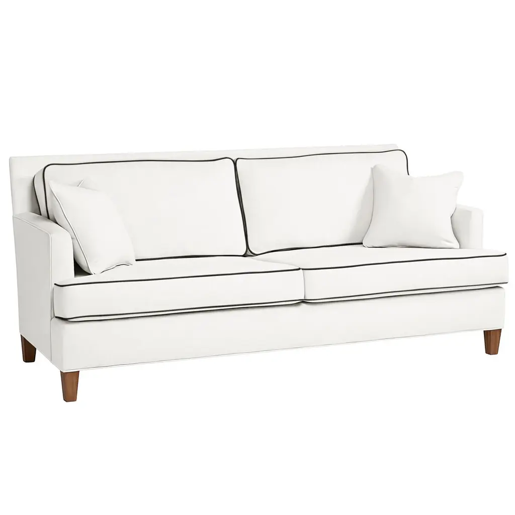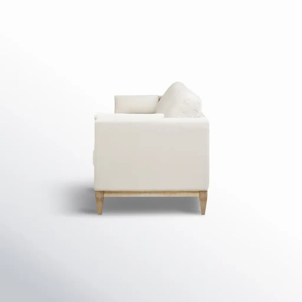 This sofa's velvet upholstery looks smooth, feels soft, and invites you to relax. The solid wood frame ensures durability, while clean lines and square arms add a modern touch. Feather-wrapped foam cushions and sinuous springs offer cozy support for three, perfect for gathering with friends or family. It comes with two matching accent pillows for added comfort and style. Plus, removable cushion covers make cleaning easy.
