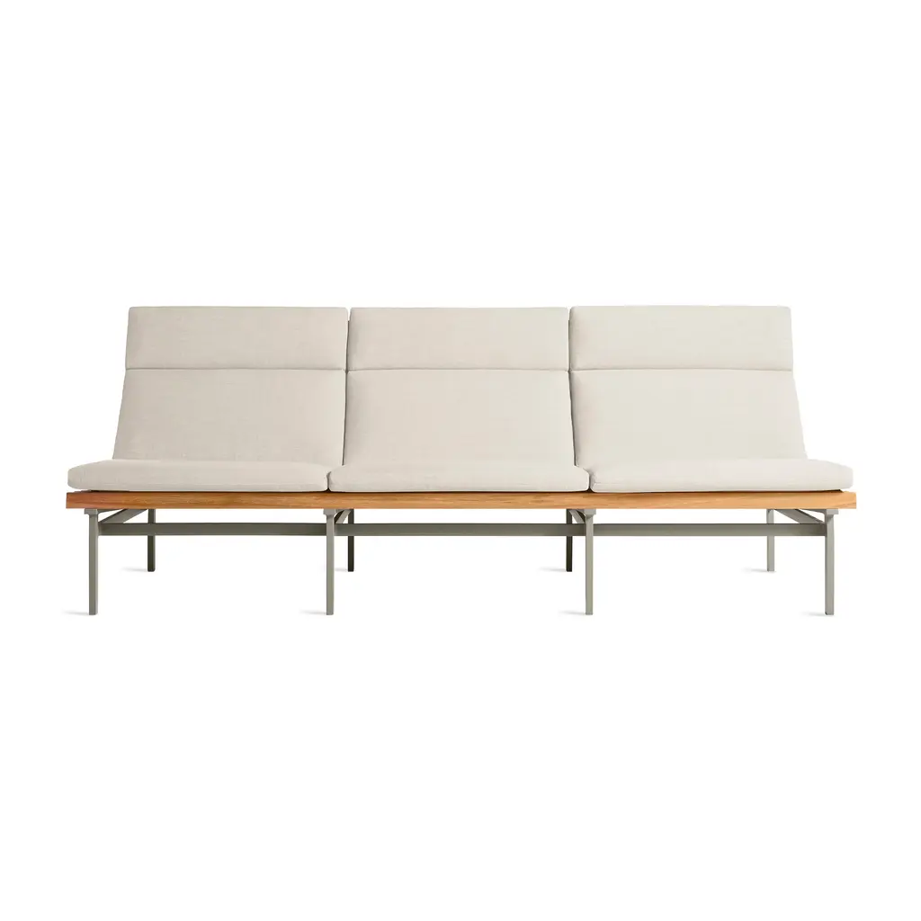 Elevate your outdoor space with the Perch Outdoor 3 Seat Sofa. Its rectangular teak slats and matte white aluminum frame exude a tasteful and airy vibe, evoking images of the Riviera or coastal resorts. Lounge in style with cushions featuring mildew and fade resistant Sunbrella fabric, ensuring total relaxation with peace of mind. Highlights