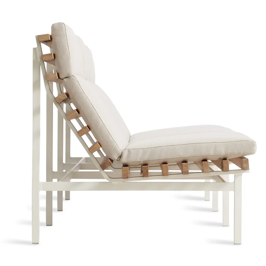 Rectangular teak slats and a matte white or grey aluminum frame cut a stylish and airy swath, whether it be the Riviera or the suburbs of Reno. Perch makes every day look like vacation. Beautiful to behold from the back side, the side side or the front side, the collection is made lounge-worthy with cushions covered in mildew and fade resistant Sunbrella™ fabric.