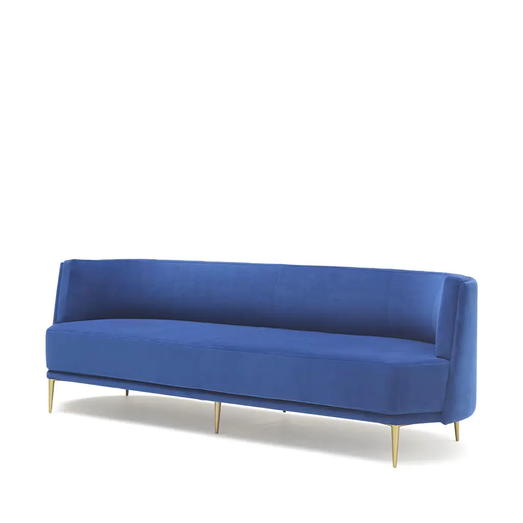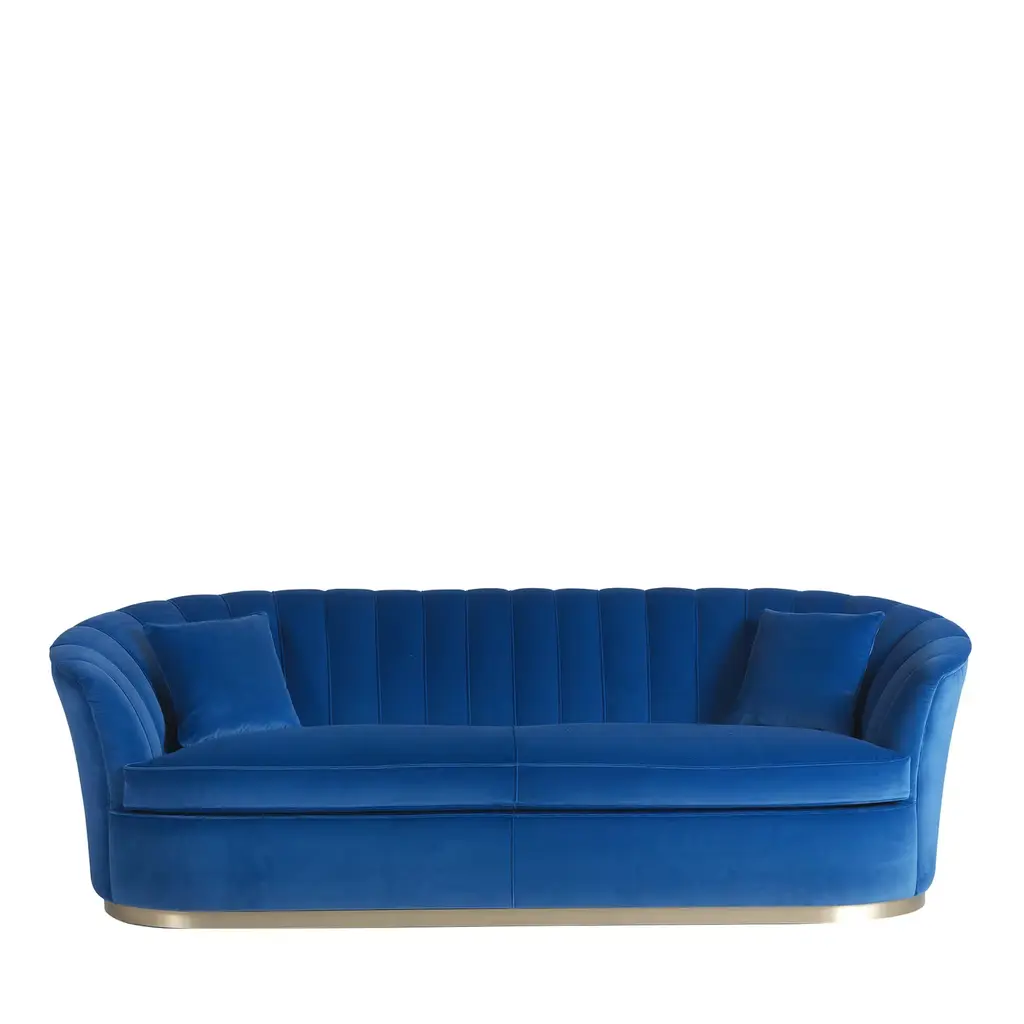 The Pergy three-seater sofa with metal gold feet and upholstery in blue velvet offers a luxurious seating experience. Its contemporary design and plush blue velvet upholstery exude elegance and comfort. The sleek gold metal feet add a touch of sophistication, perfect for modern interiors. Enjoy a stylish and inviting seating solution in any room with this exquisite and versatile sofa.