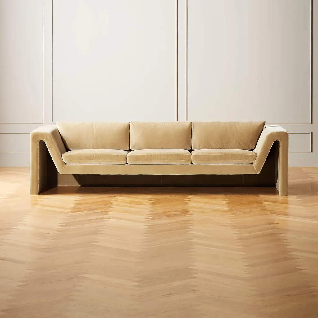 Plush camel faux mohair fabric and severe angular design meet in this vintage '70s Italian-inspired sofa by Ceci Thompson. Sleek and sculptural, solid frame wraps around the back and sides, angling at the front for major suspense. Learn more about Ceci Thompson on our blog. CB2 exclusive.