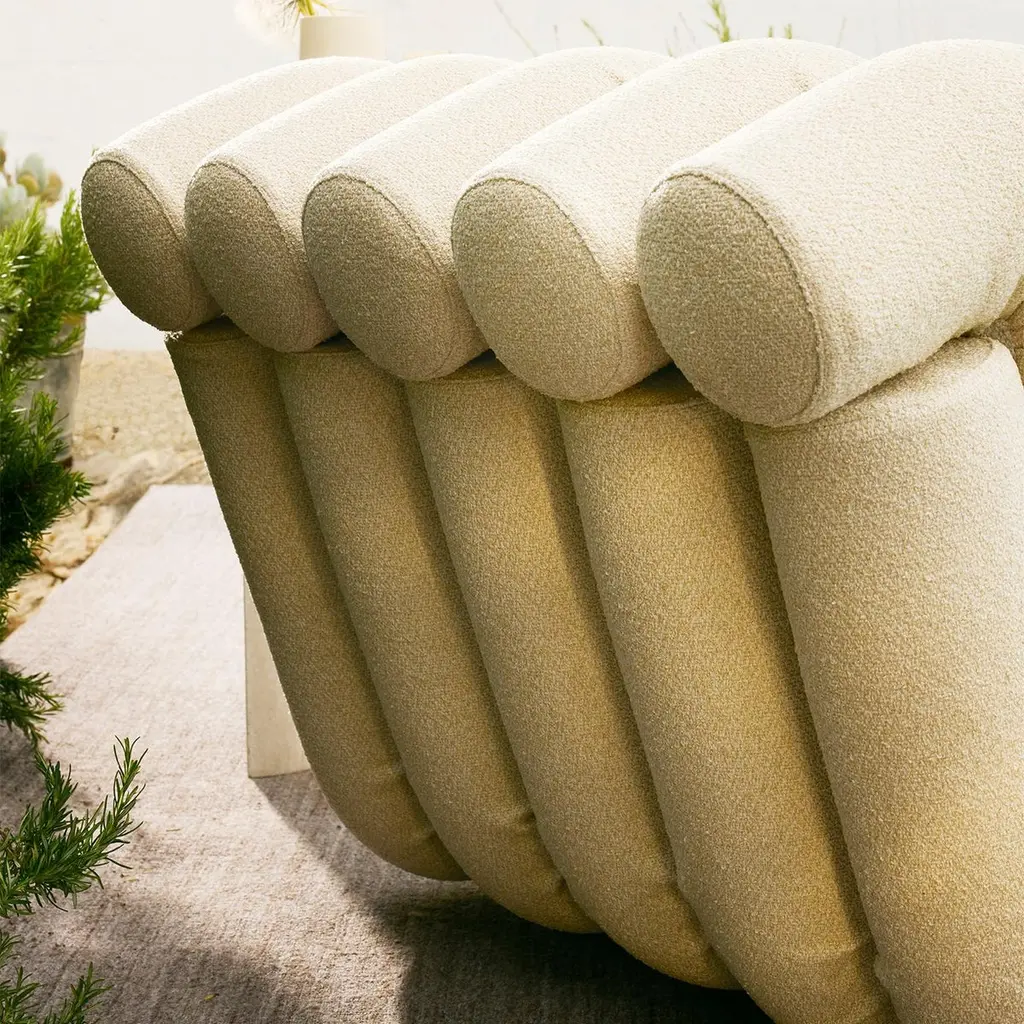Eccentric yet sober in its bold volumes tempered by neutral coloring, this '70s-inspired sofa will be ideally combined with its chaise longue and lounge chair counterparts for setting a glamorous and cozy living in contemporary patios or terraces. Dramatically bent and generously padded, ten tubes compose its plump silhouette that, sealed by a refined superior-category beige-toned fabric upholstery, also boasts exceptional weatherability. If the products are placed completely outside, nightcovers that can be purchased at an extra price are recommended. Please contact the Concierge for further information.