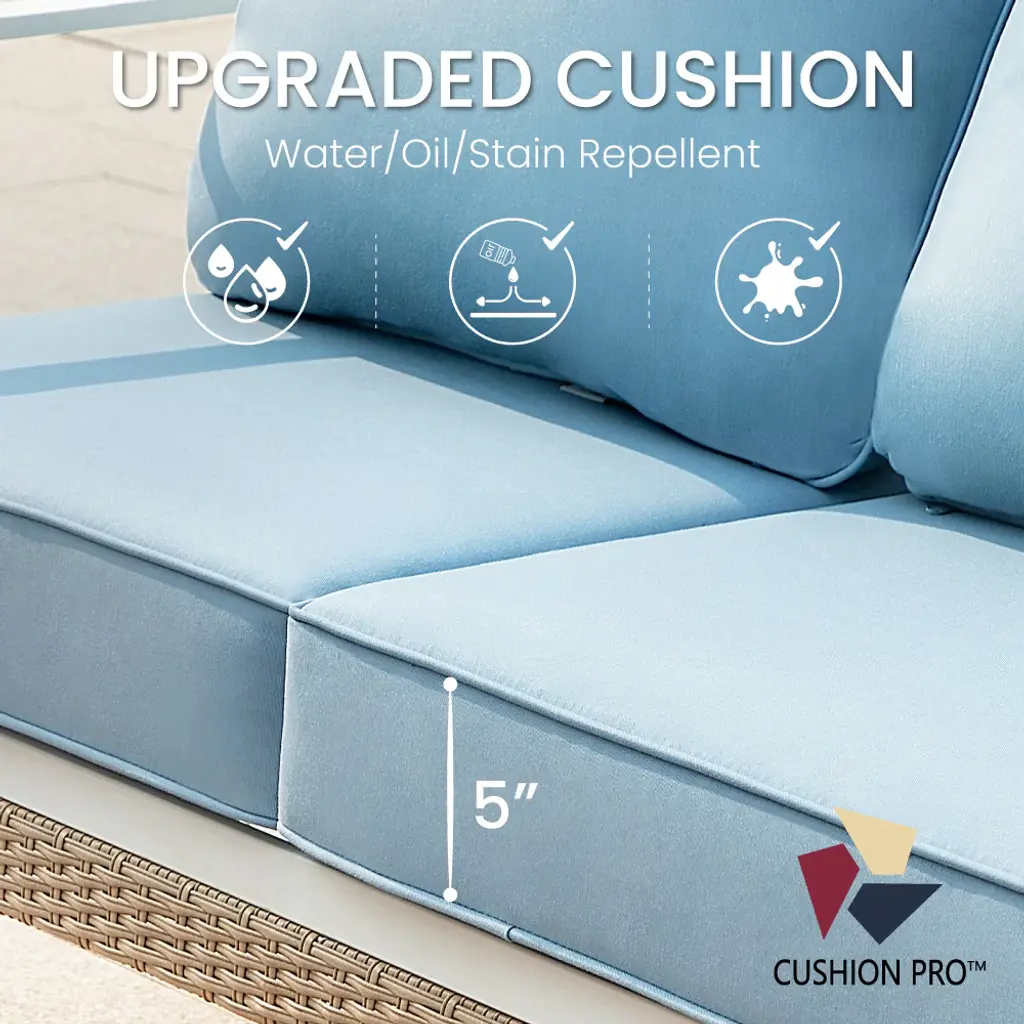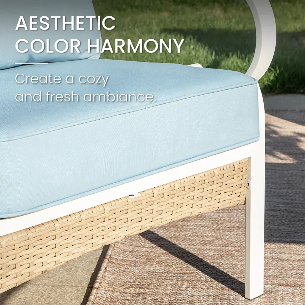 Revamp your outdoor gatherings with this luxurious and stylish sofa set, perfect for creating lasting memories with friends and family. The fresh color combination of porcelain white, tealish blue, and light brown makes this set truly stand out. Thick cushions ensure optimal comfort, while the meticulous attention to detail in crafting guarantees elegance, comfort, and functionality all in one.