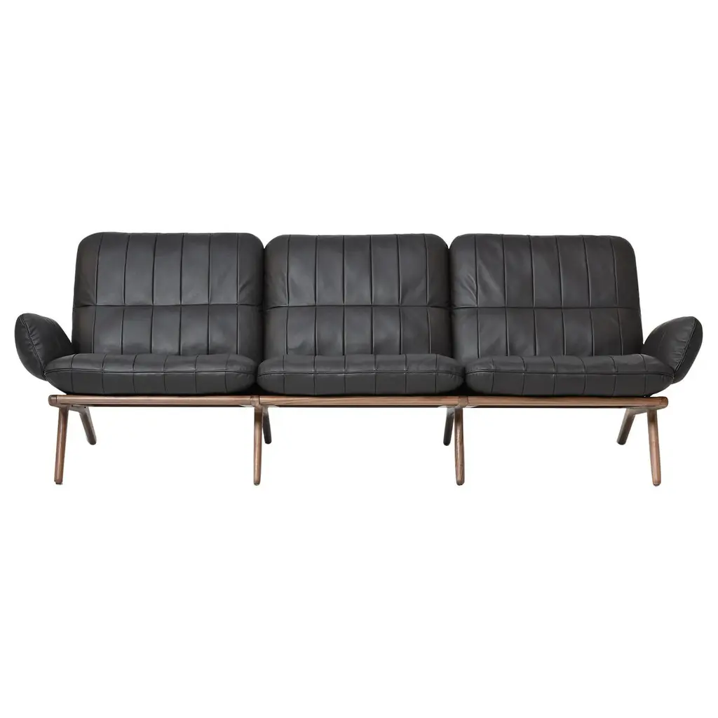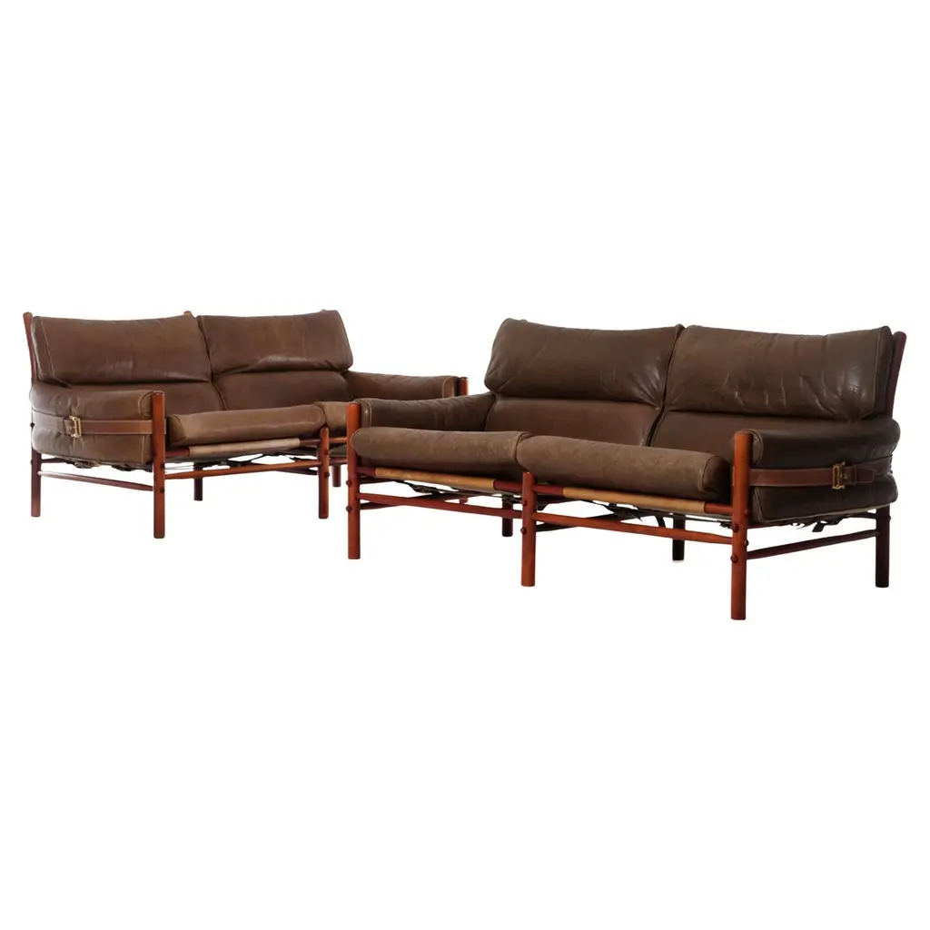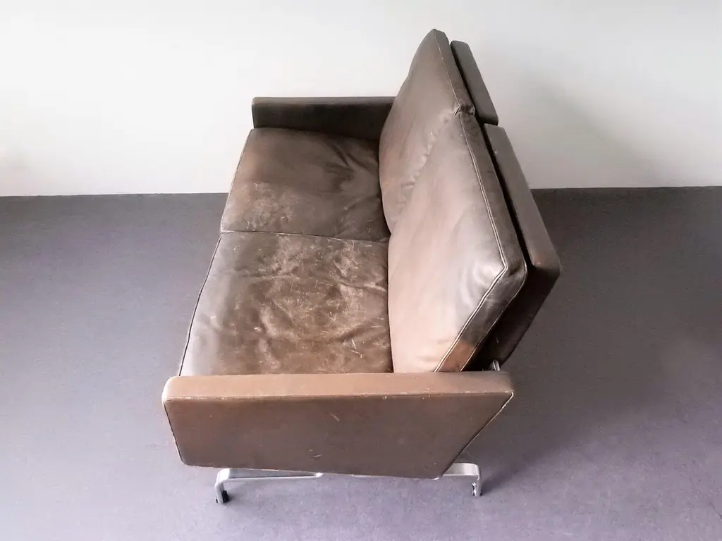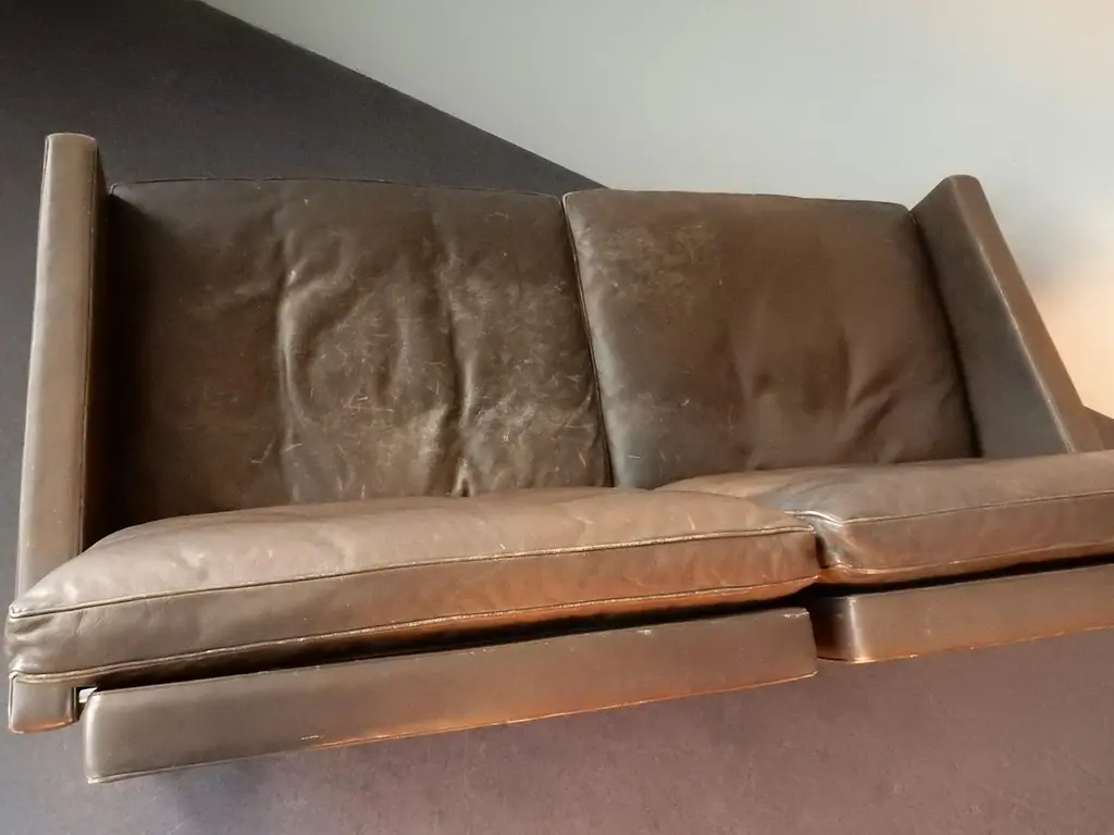 This sofa comes from a bank building in Denmark. It is completely original and marked with the original marking of E. Kold Christensen on the bottom bar.The dark brown leather has a great patina that shows age and use and tells the story of an original production from E.K. Christensen. The leather on the frame and the cushions do show some difference in color from being exposed to sunlight in the past, but the leather is still soft and smooth.This sofa is in a very good constructional condition and will give you comfort for many more years to come.