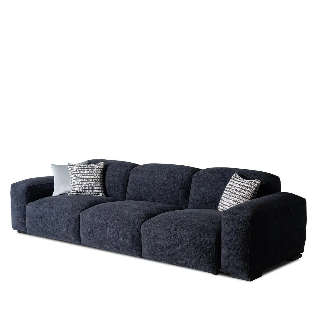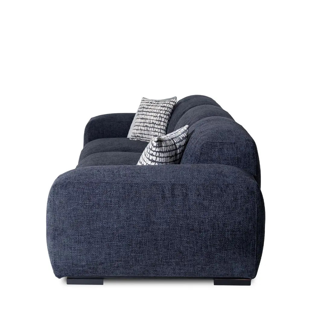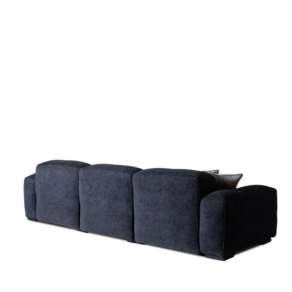 Refined and versatile, this three-seater sofa blends deep blue fabric upholstery with raw-cut seams for a tailored, architectural look. Sliding seats extend for personalized comfort, while high-density foam padding and a goose-down duvet offer a luxurious feel. Solid beechwood legs with a black lacquered finish provide durability and contrast. Designed for modern living, it balances elegance with functionality. Cushions are not included. Contact the Concierge for details on available sizes.