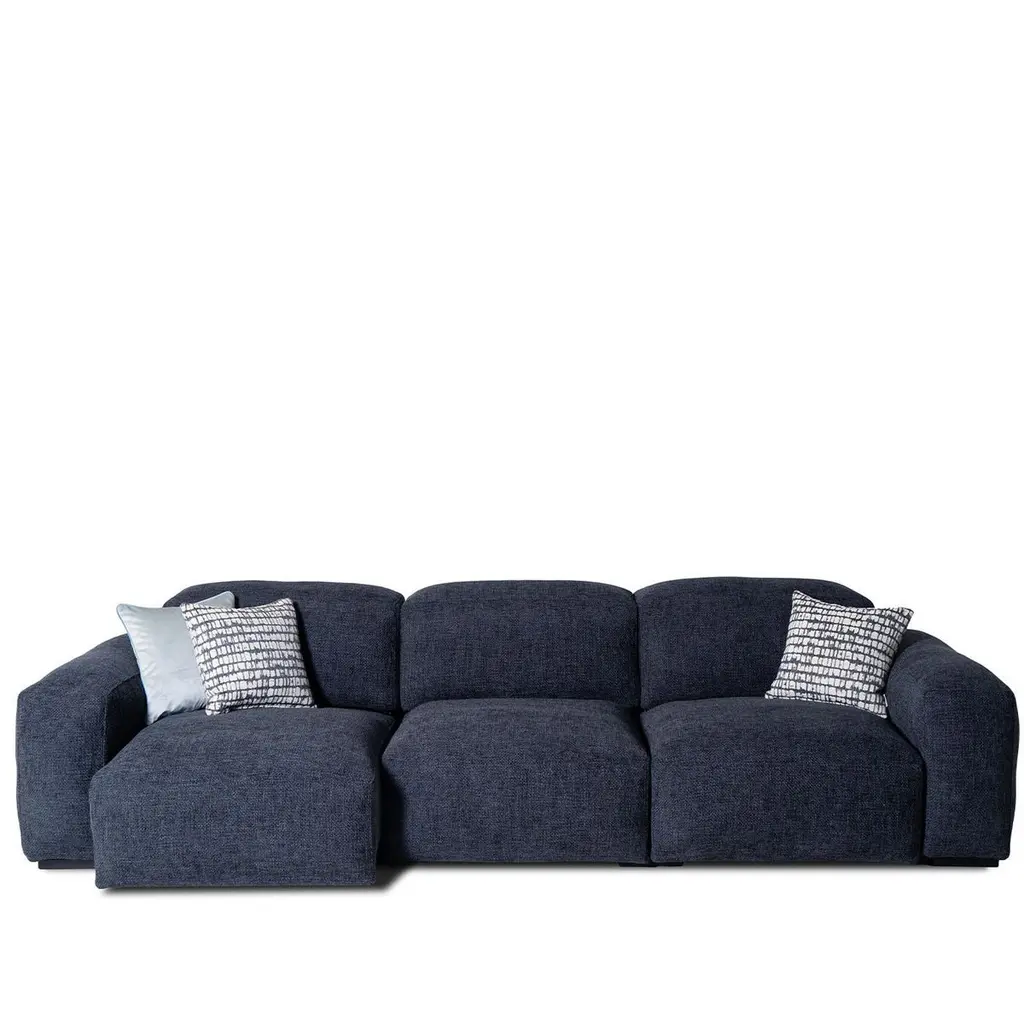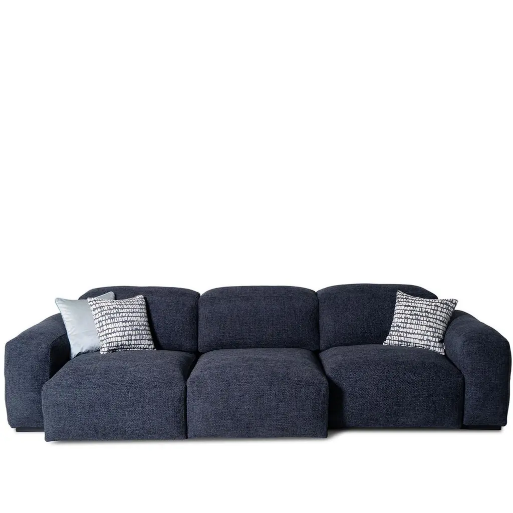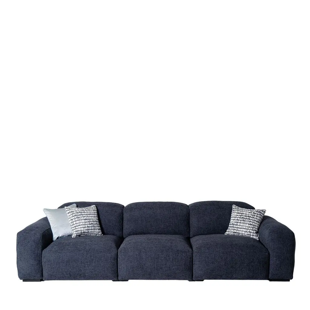 Refined and versatile, this three-seater sofa blends deep blue fabric upholstery with raw-cut seams for a tailored, architectural look. Sliding seats extend for personalized comfort, while high-density foam padding and a goose-down duvet offer a luxurious feel. Solid beechwood legs with a black lacquered finish provide durability and contrast. Designed for modern living, it balances elegance with functionality. Cushions are not included. Contact the Concierge for details on available sizes.
