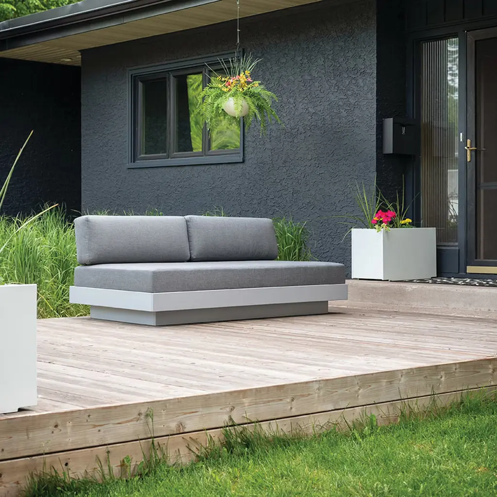 Sink in and relax with Platform One's intentionally deep seating and durable Sunbrella fabric cushions, with moisture repellant cushion cores. Neutral grey powder coated steel uprights support a poly backrest matching the sofa's base. The sofa base incorporates vertical seat supports for extra durability and flow through of water in inclement weather. The Platform One Sectional Sofa is the perfect starter piece to build your sectional arrangement around. Add any of Platform One's well-appointed options like a Sectional Corner, Armless Lounge, and Ottoman or keep it simple as a stand-alone sofa. Modern meets lazy.