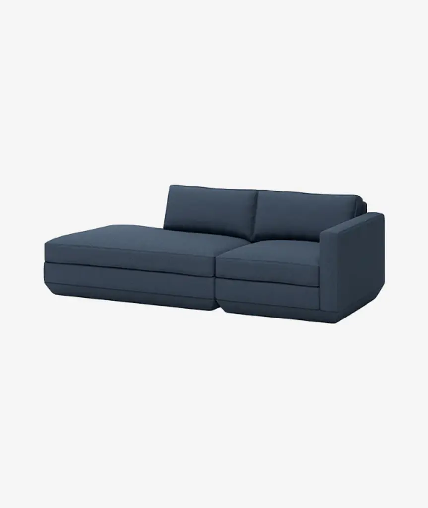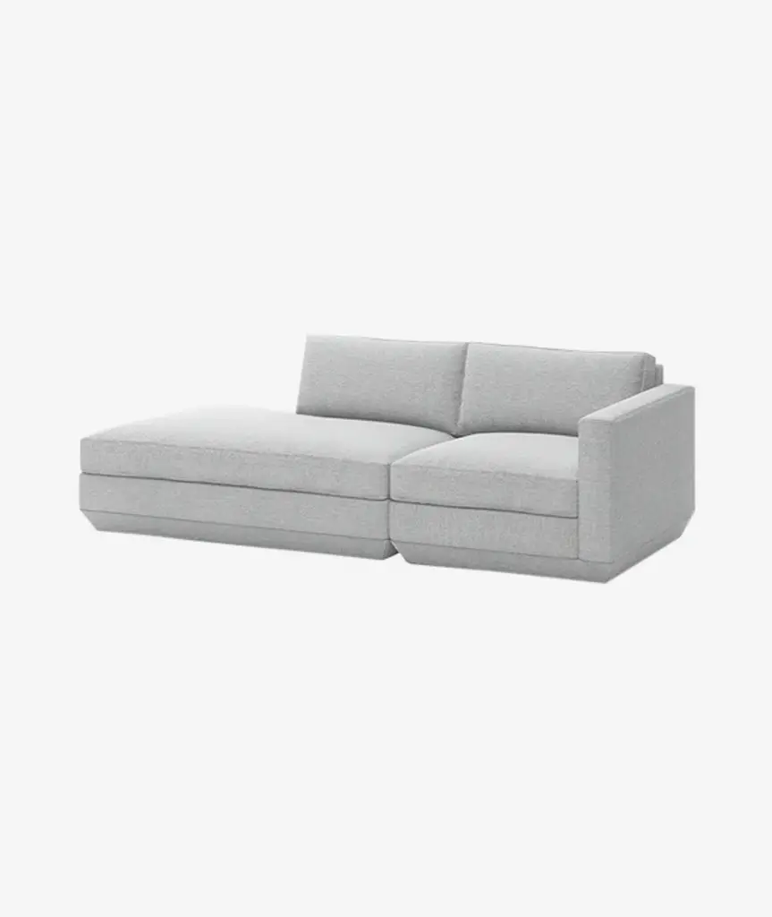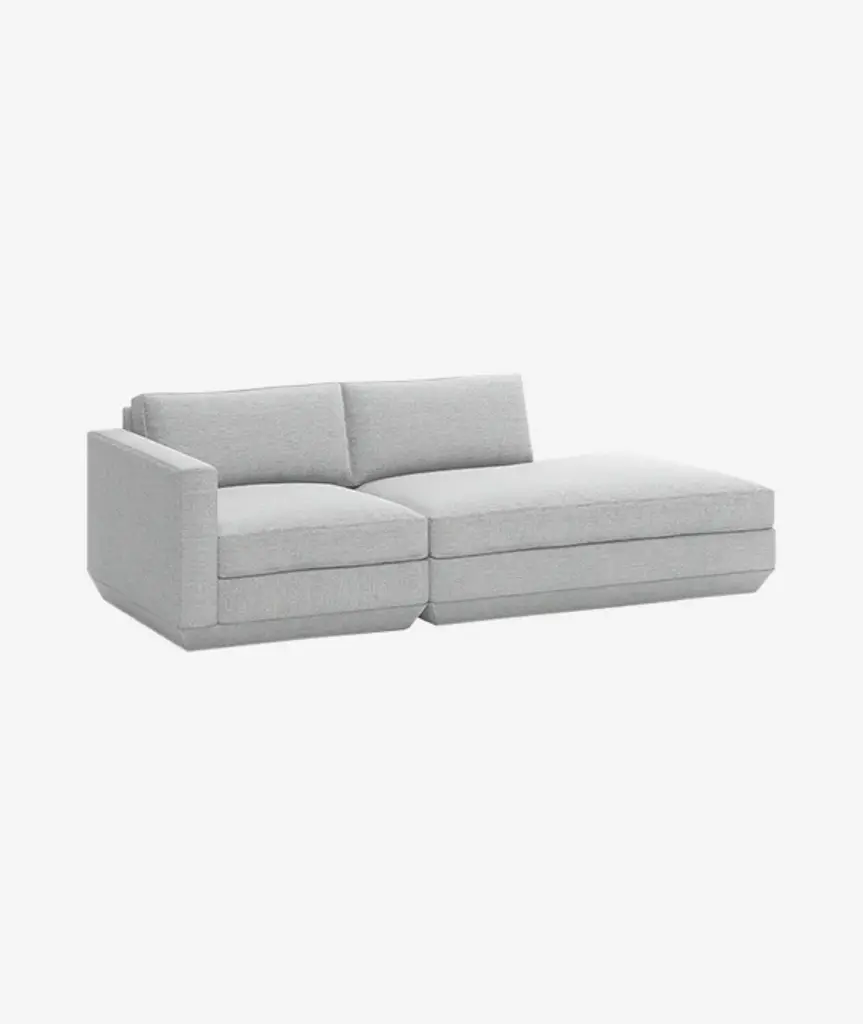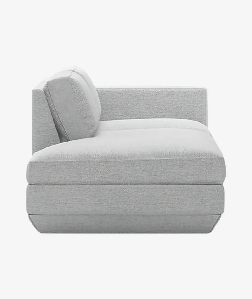 The Podium Modular Collection is an adaptable seating system that brings modern elegance and luxurious comfort to any space. The Podium features seven core components (Right Arm, Left Arm, Armless, Corner, Ottoman, Left Lounge and Right Lounge) that can be arranged in unlimited configurations to suit any vision or layout. Components can then be easily reconfigured or added later to adapt to your evolving lifestyle. Each component showcases a relaxed silhouette inspired by 1970’s Modernism: a low and deep sit created by plush seat and back cushions (filled with eco-friendly synthetic down derived from recycled water bottles), and an attractive, subtly angled, chamfered base.