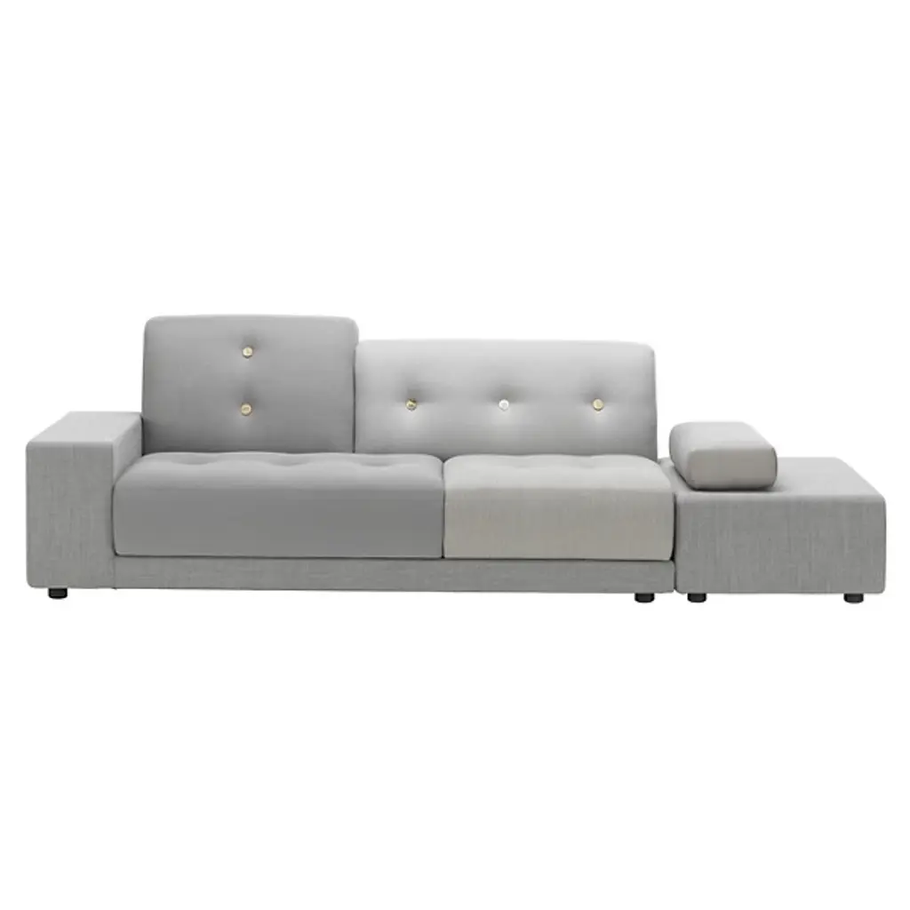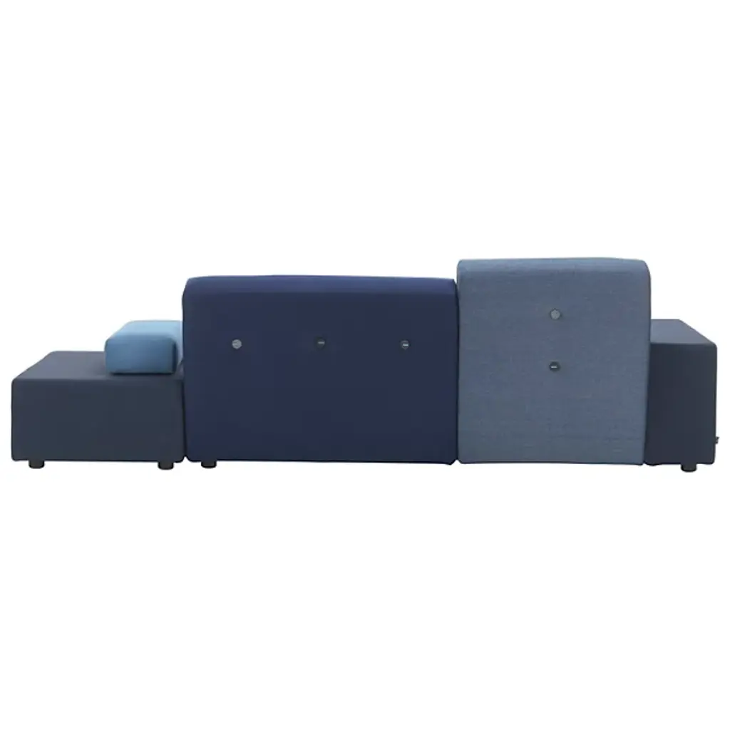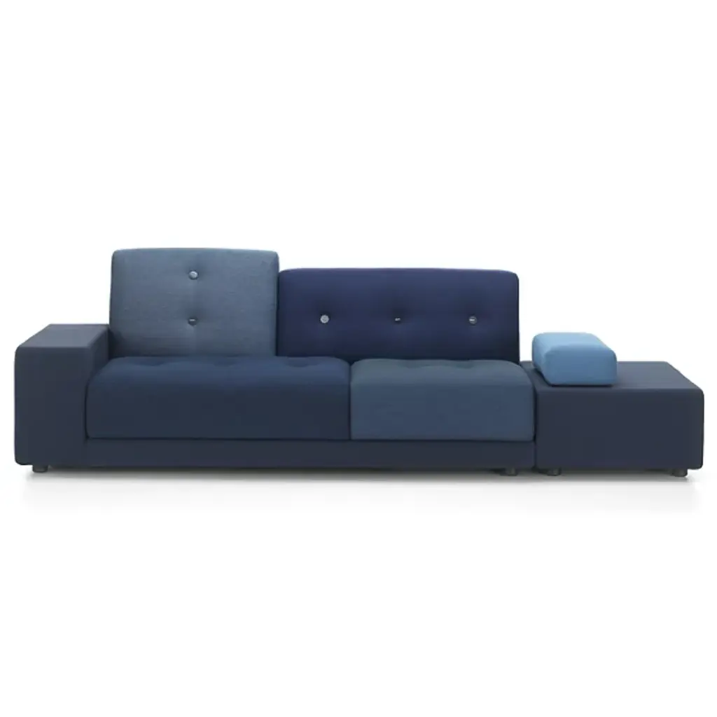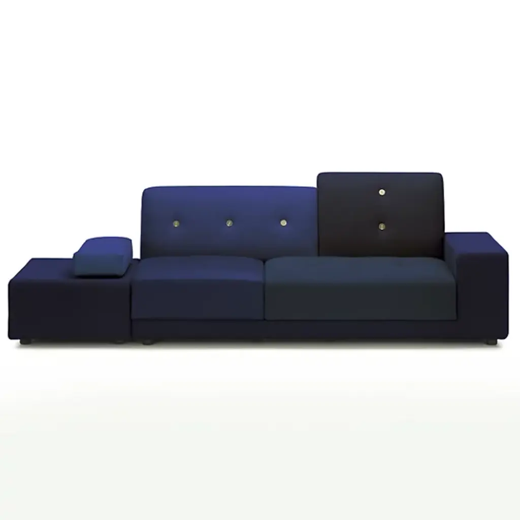 In designer Hella Jongerius' home country of Holland, "polder" refers to low-lying flatlands divided into sections for different agricultural purposes. The Vitra Polder Sofa recalls this landscape with its differing horizontally-shaped cushions and mix of fabric colors and types. A movable ottoman and bolster/armrest cushion can be moved as needed to adjust the sofa length. Choose from an array of color palettes and the fixed armrest on the right or left.