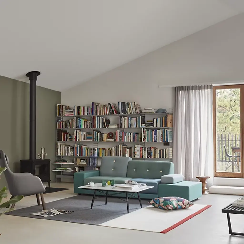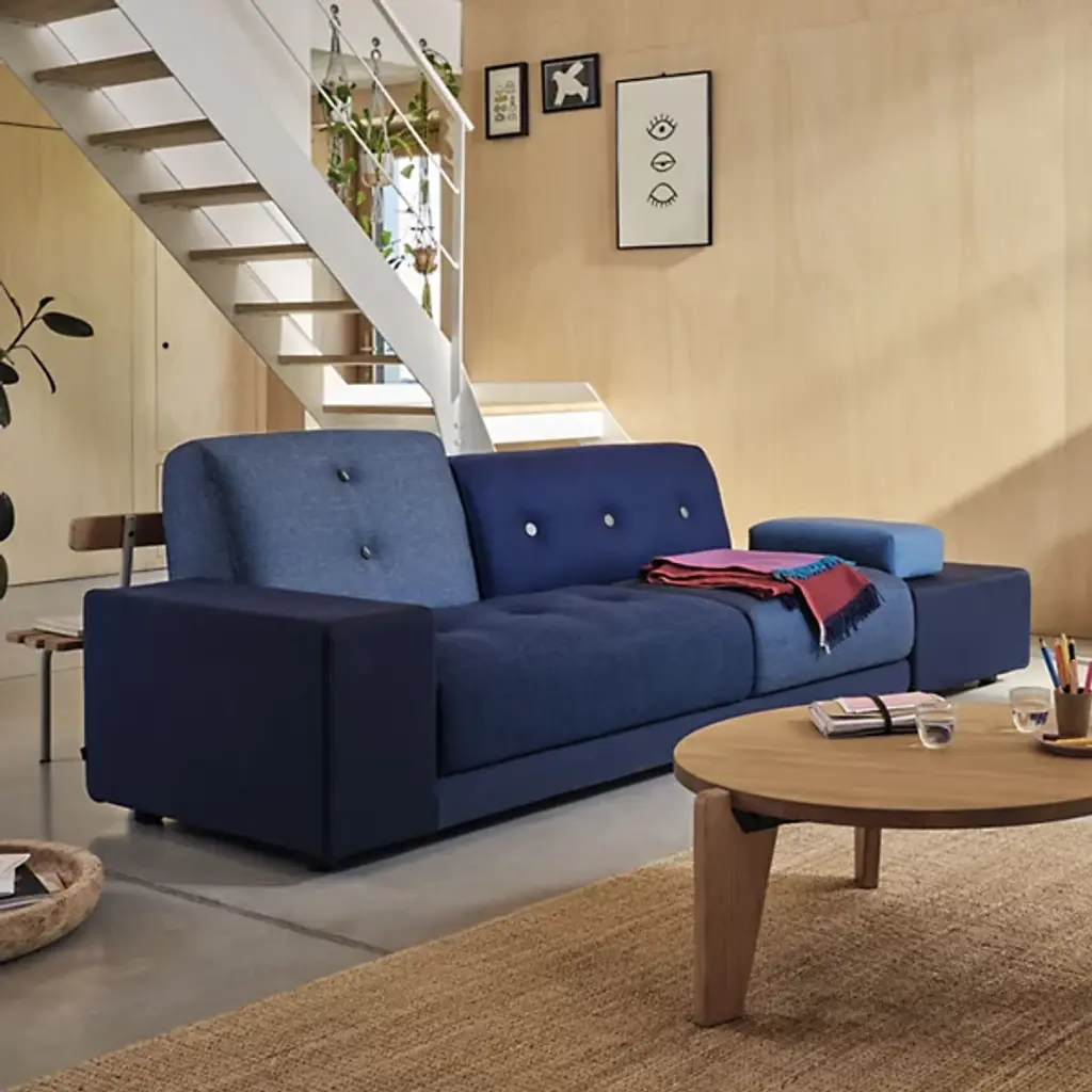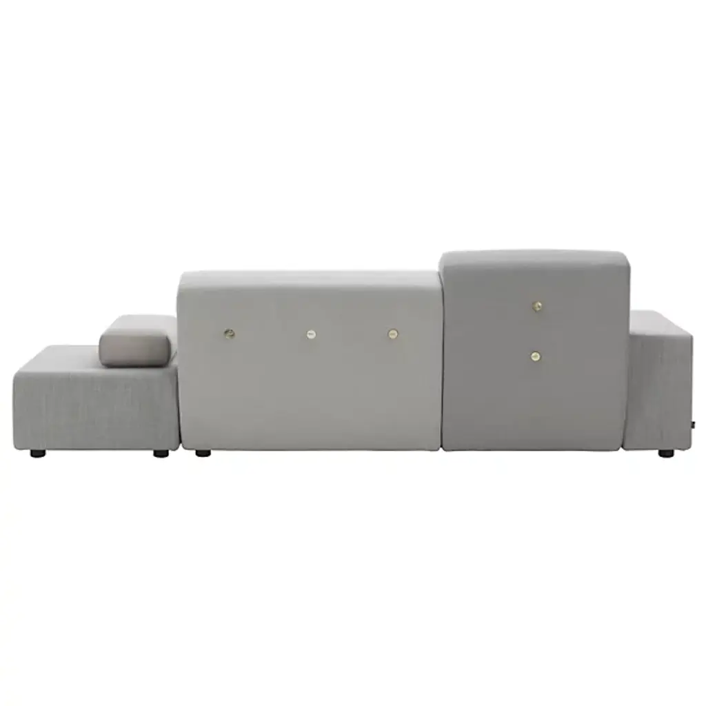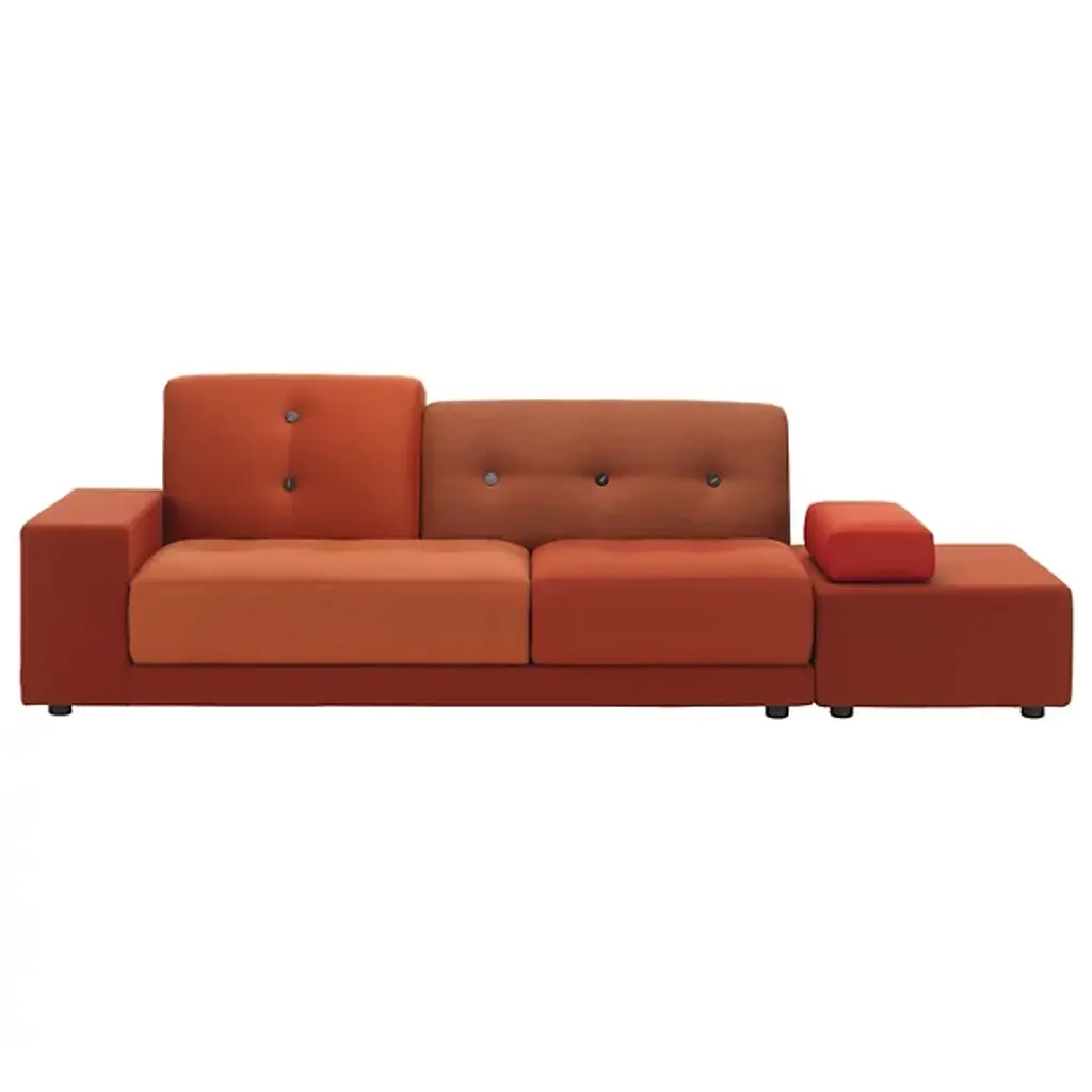 In designer Hella Jongerius' home country of Holland, "polder" refers to low-lying flatlands divided into sections for different agricultural purposes. The Vitra Polder Sofa recalls this landscape with its differing horizontally-shaped cushions and mix of fabric colors and types. A movable ottoman and bolster/armrest cushion can be moved as needed to adjust the sofa length. Choose from an array of color palettes and the fixed armrest on the right or left.