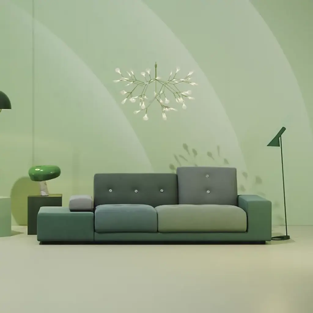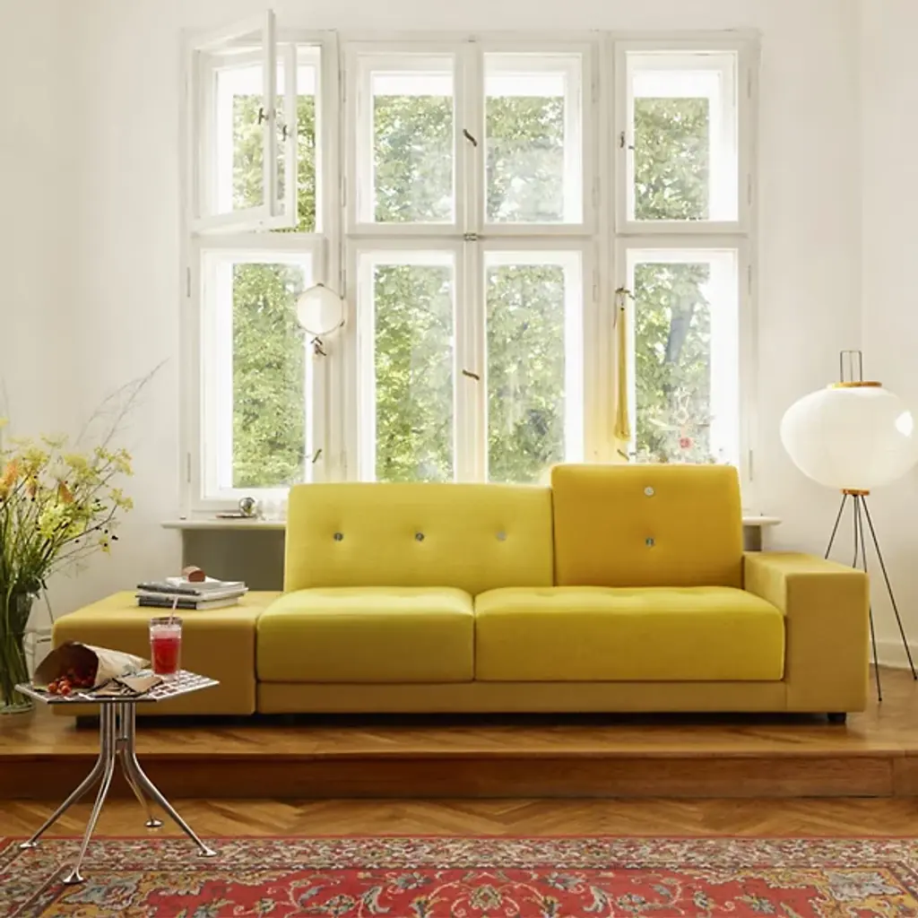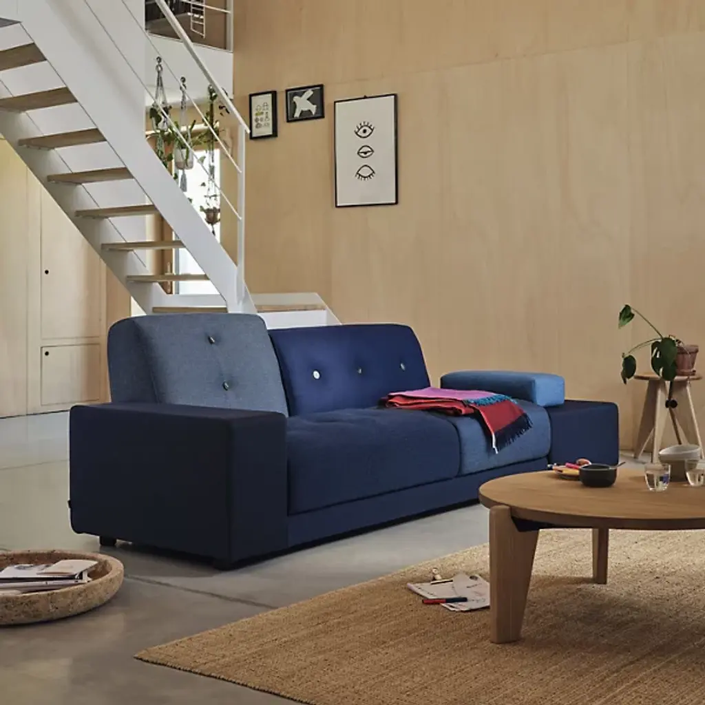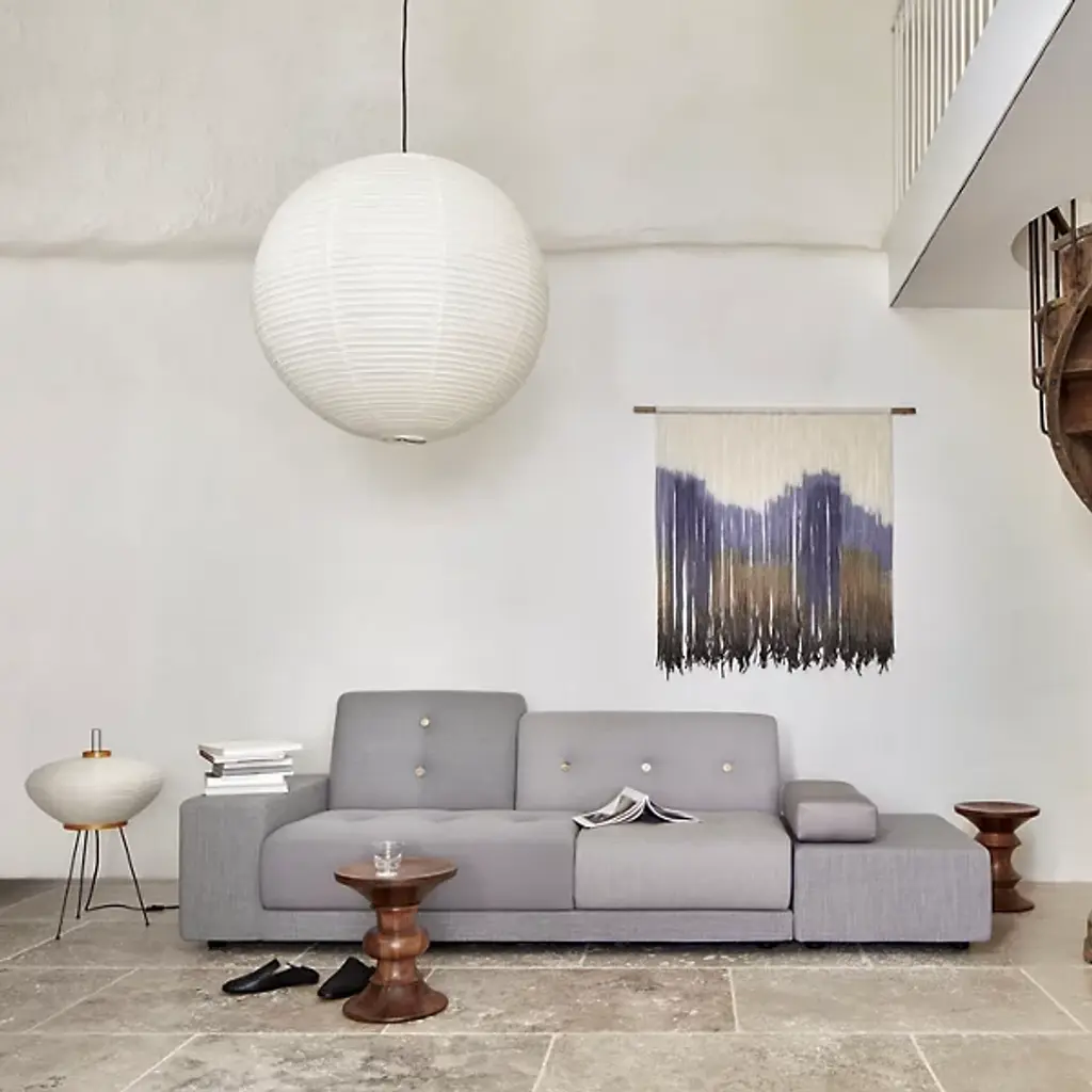 In designer Hella Jongerius' home country of Holland, "polder" refers to low-lying flatlands divided into sections for different agricultural purposes. The Vitra Polder Sofa recalls this landscape with its differing horizontally-shaped cushions and mix of fabric colors and types. A movable ottoman and bolster/armrest cushion can be moved as needed to adjust the sofa length. Choose from an array of color palettes and the fixed armrest on the right or left.