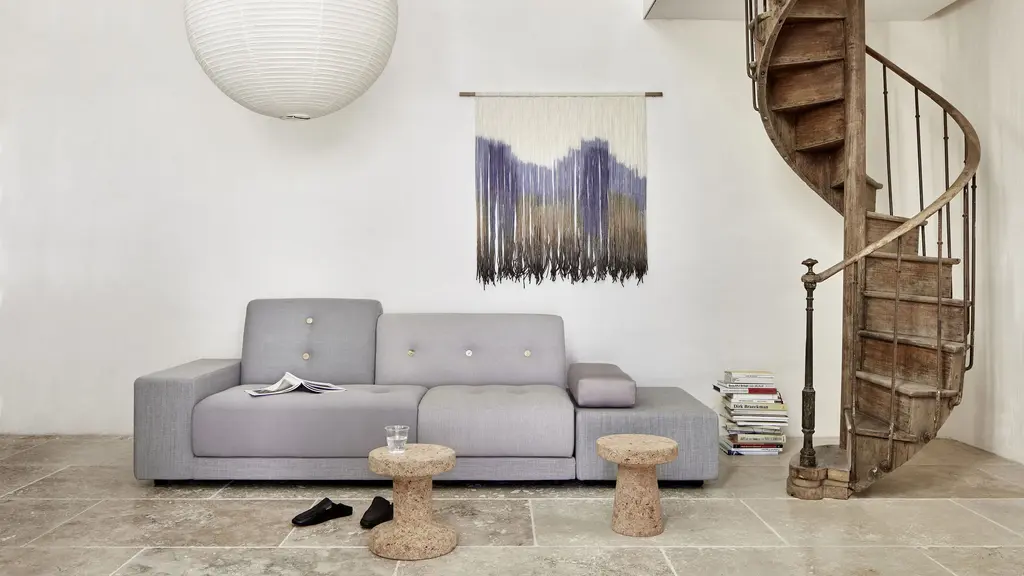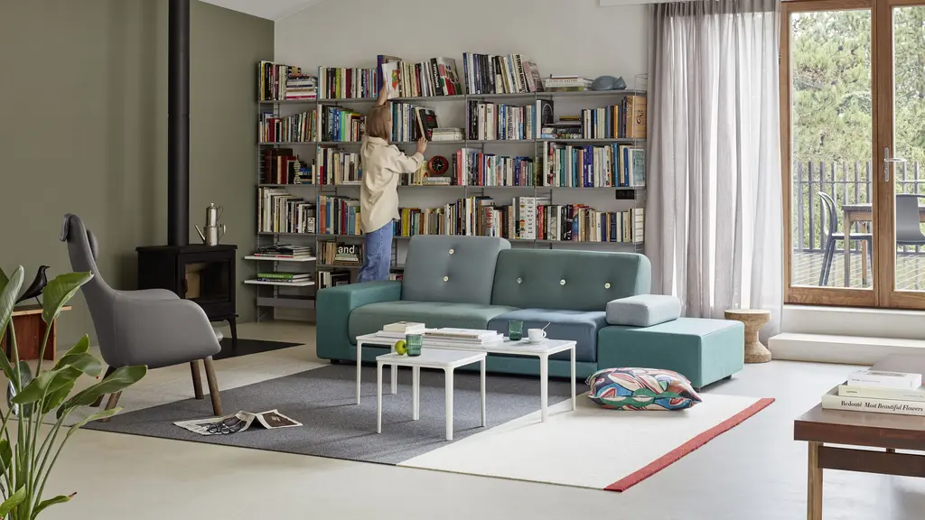 The distinctive character of Hella Jongerius's comfortable Polder Sofa derives from the combination of diverse fabrics and colours, an asymmetrical shape and charming details.