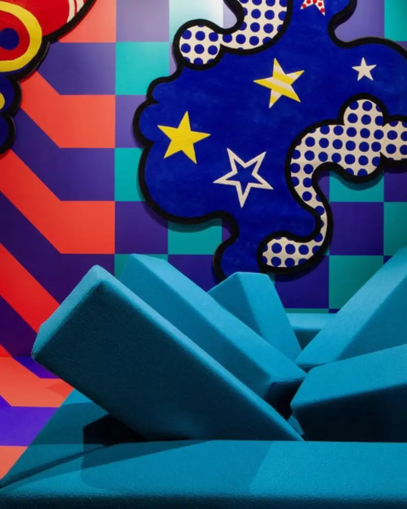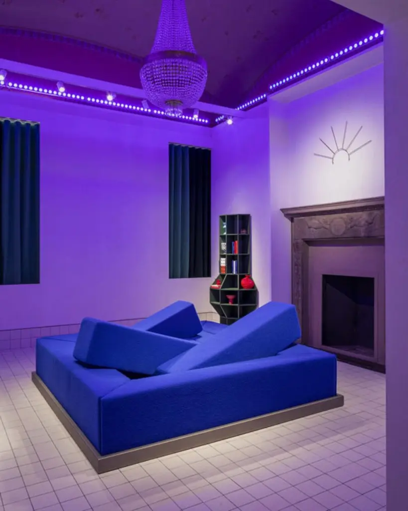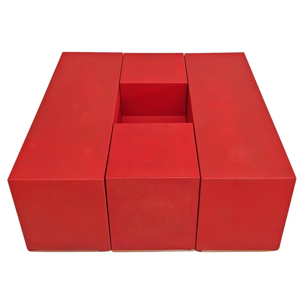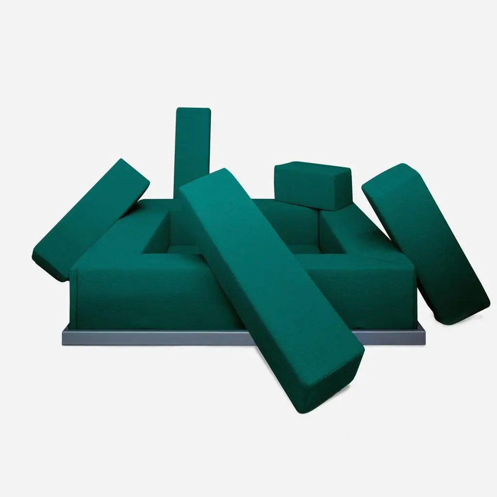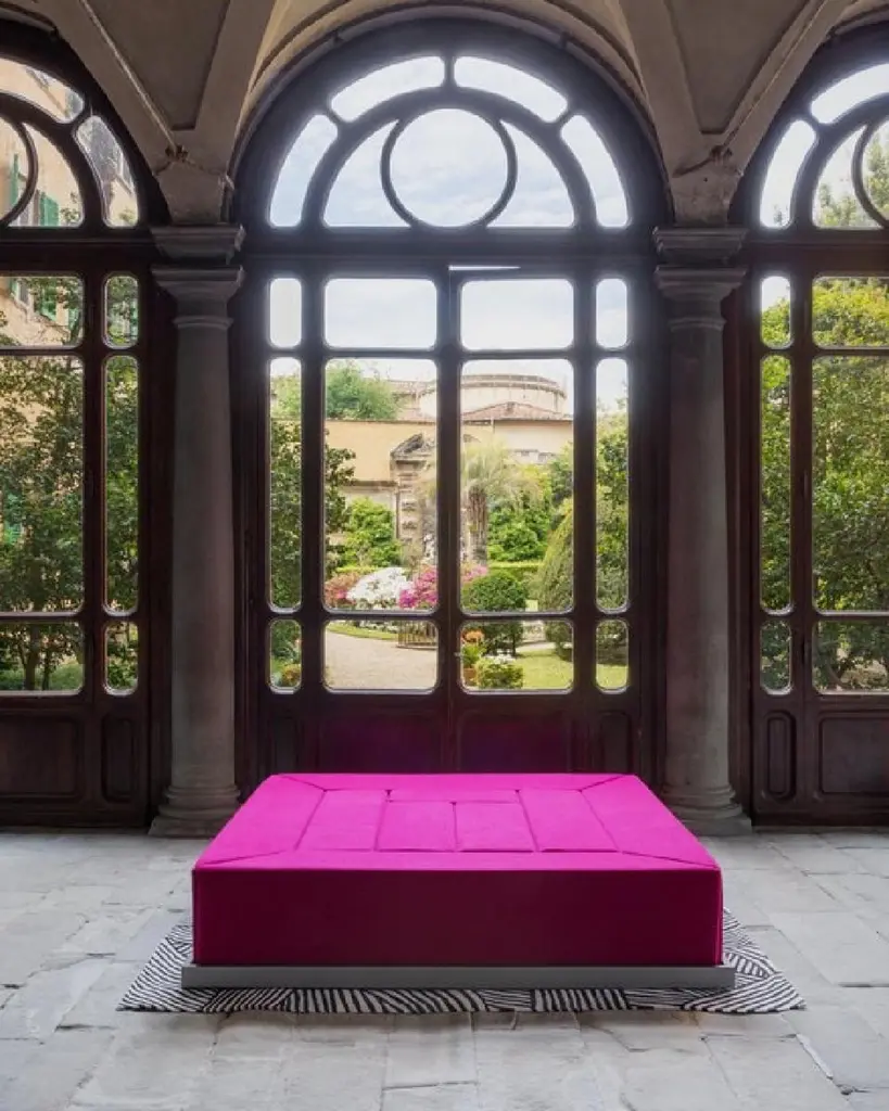 The design of this sofa derives from the experience of living in a large place, originally a 19th—century atelier for artists, where the furniture had to be conceived on the scale of the place and not on a human scale. It is an object that dialogues with the volume of the overall space and takes into account the fact that that is where it is used. The sofa is a simple, original form, a womb where everything happens or has already happened, but which still suggests possibilities, other things that can happen there. It is an object that breaks up form as it breaks up function; it acquires meaning when the clean geometry of the initial status quo is upset by equally ungrammatical functions.materials:[frame] solid wood painted silver[cushions] polyurethane foam[cover] Casentino woolFinish:• Pink• Green • BlueDIMENSIONS:248[W] x 248[D] x 51[H] cm
