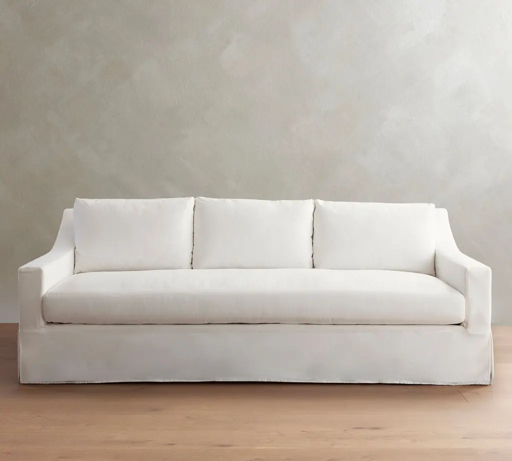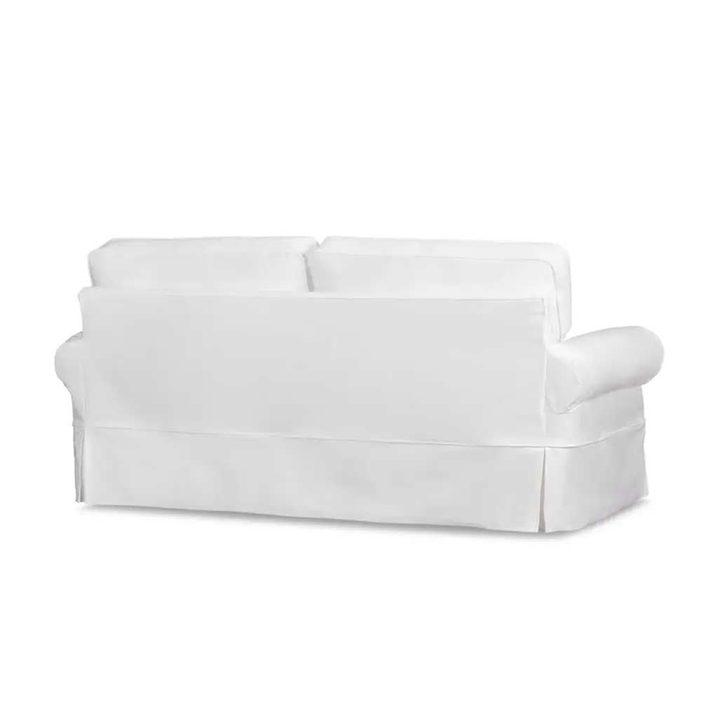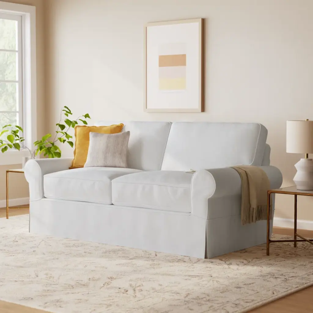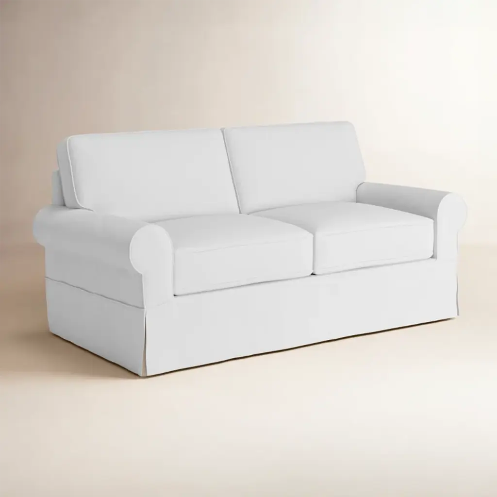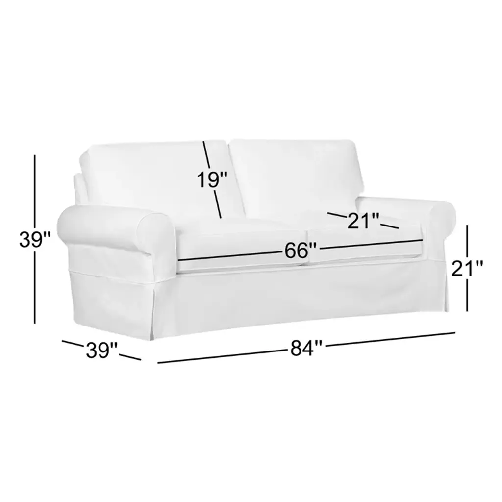 Elevate your living space with this cozy, standard sofa that seats three comfortably. With its rolled arms and solid color cotton upholstery, it adds a touch of elegance to any room. The plywood frame is expertly joined with mortise and tenon techniques, while the sinuous springs and feather blend cushions provide a plush seating experience. The removable cushion covers make maintenance a breeze, and the stain-resistant fabric ensures you can enjoy this sofa worry-free. Plus, it's crafted with care for residential use, so you know it's a great addition to your home.