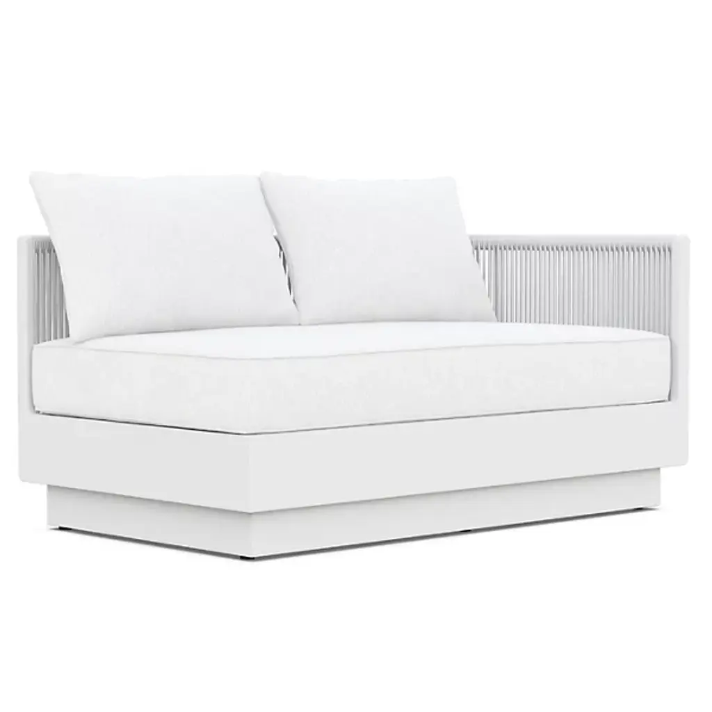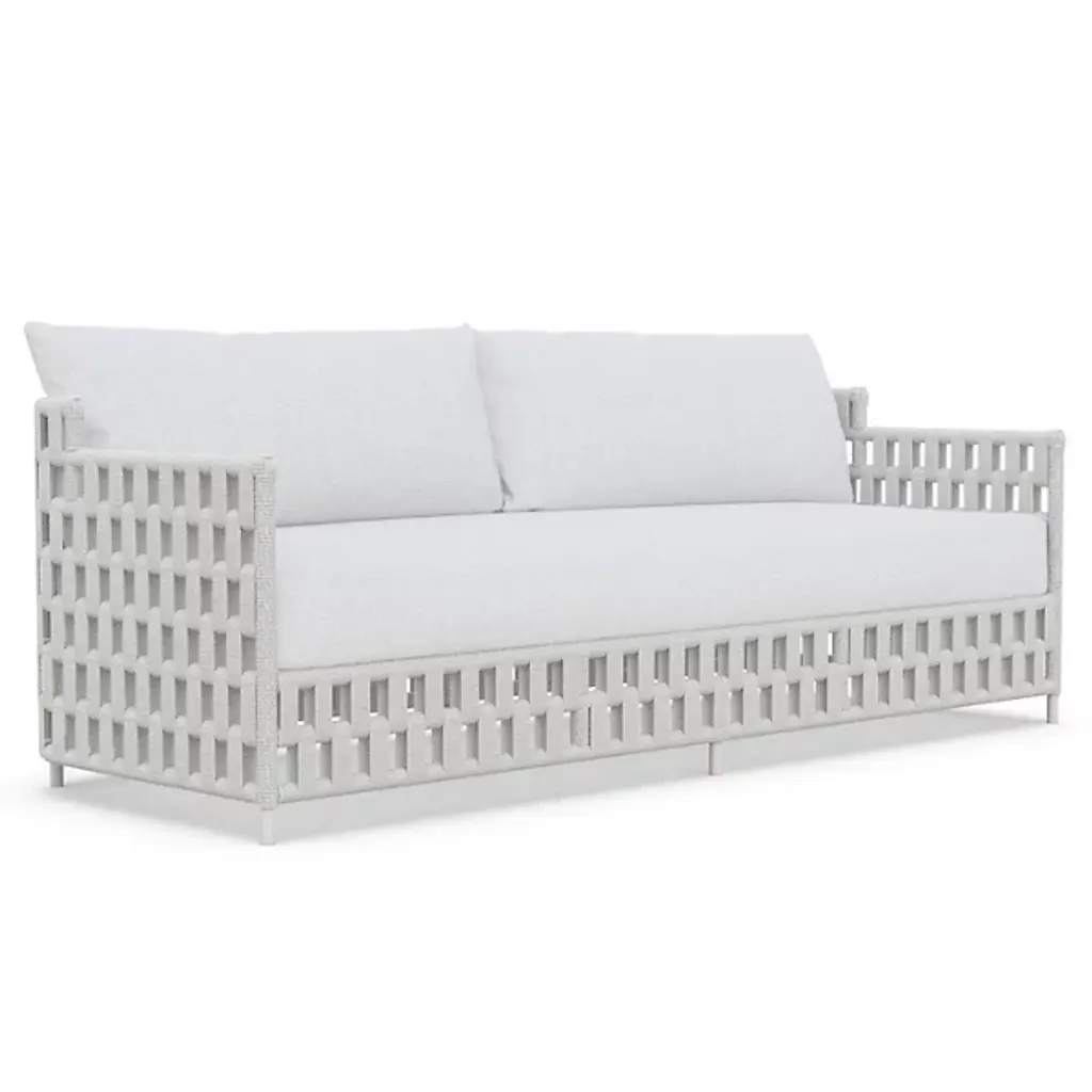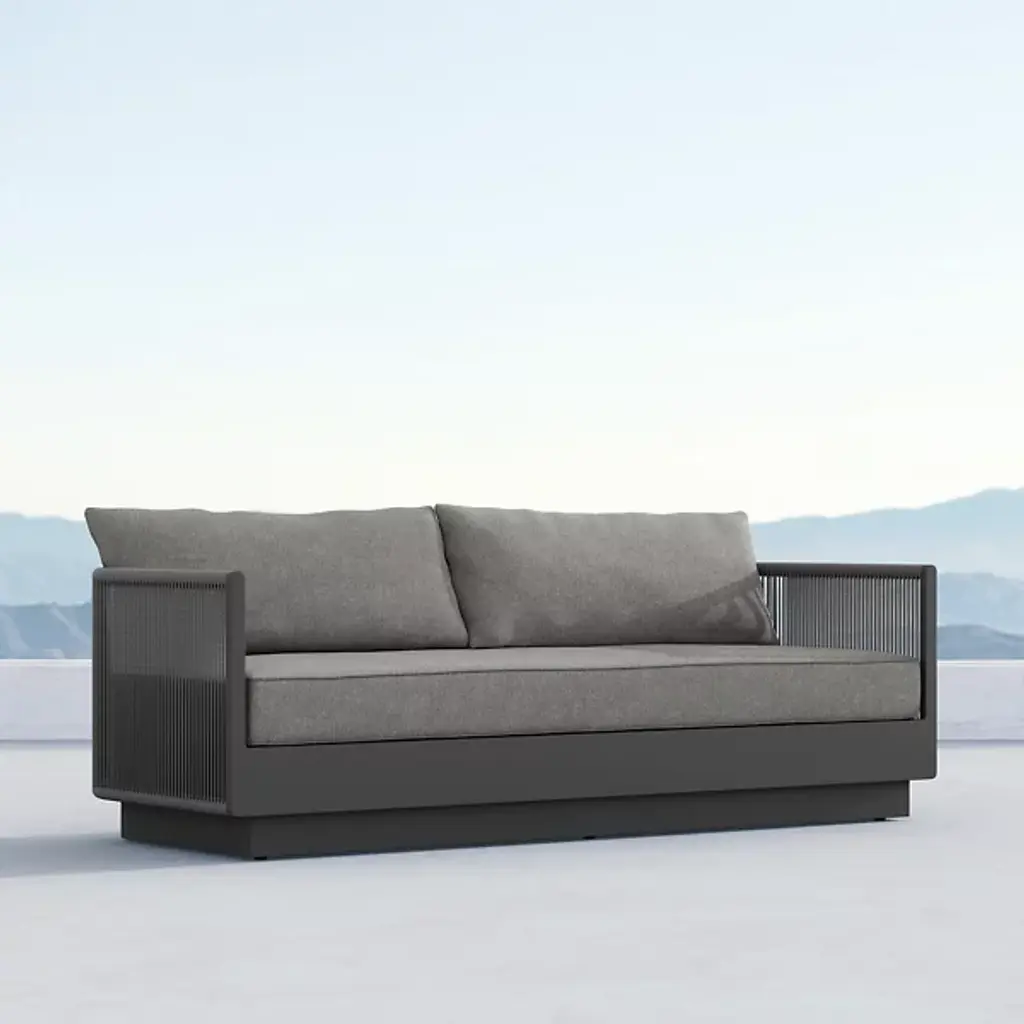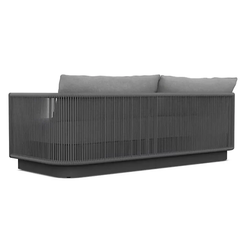 Give an expressive modern appeal to outside lounge spaces with the arresting appeal of the Porto Outdoor 3 Seater Sofa from Azzurro Living. Adroitly pairing streamlined design with modern expressiveness, its clear, articulate design extends from a stepped aluminum base, incorporating parallel strands of all-weather rope around the frame. A rectangular seat cushion and plush pillows with soft fill, each one surfaced in Solvita fabric, add an extra layer of comfort, transforming the airy, coastal structure with a welcome softness still able to endure the most inclement weather.