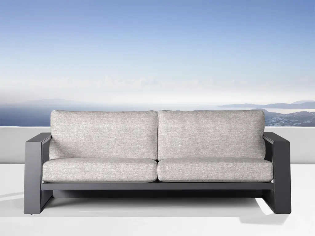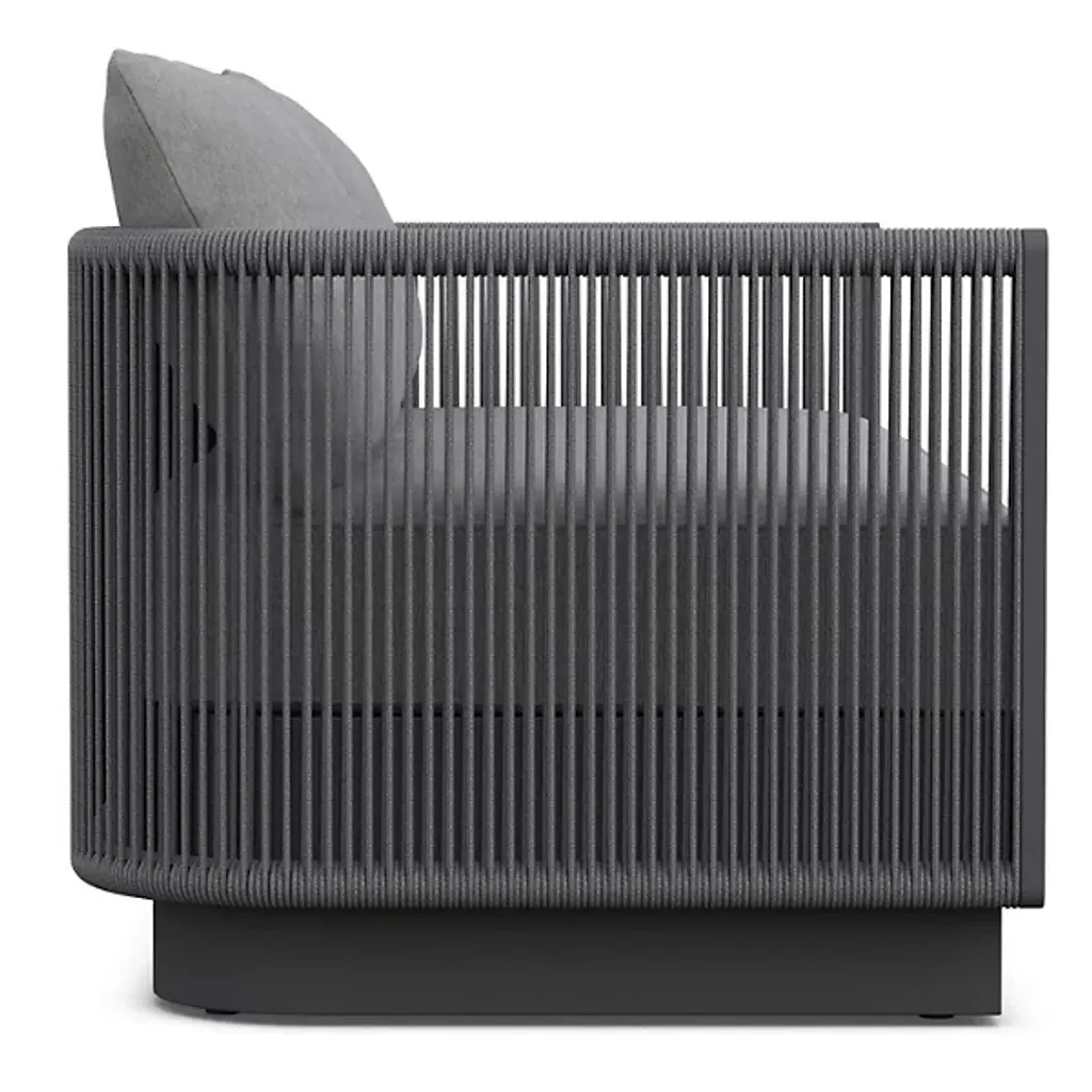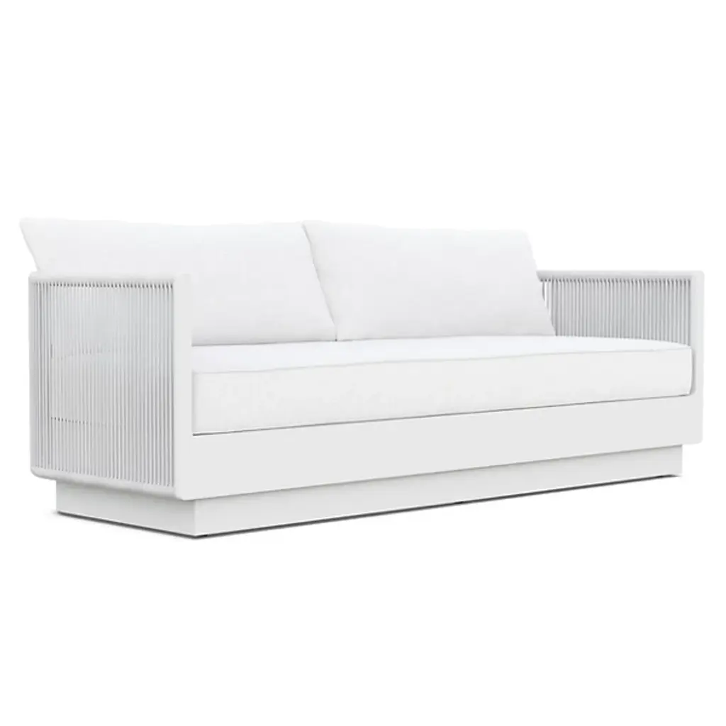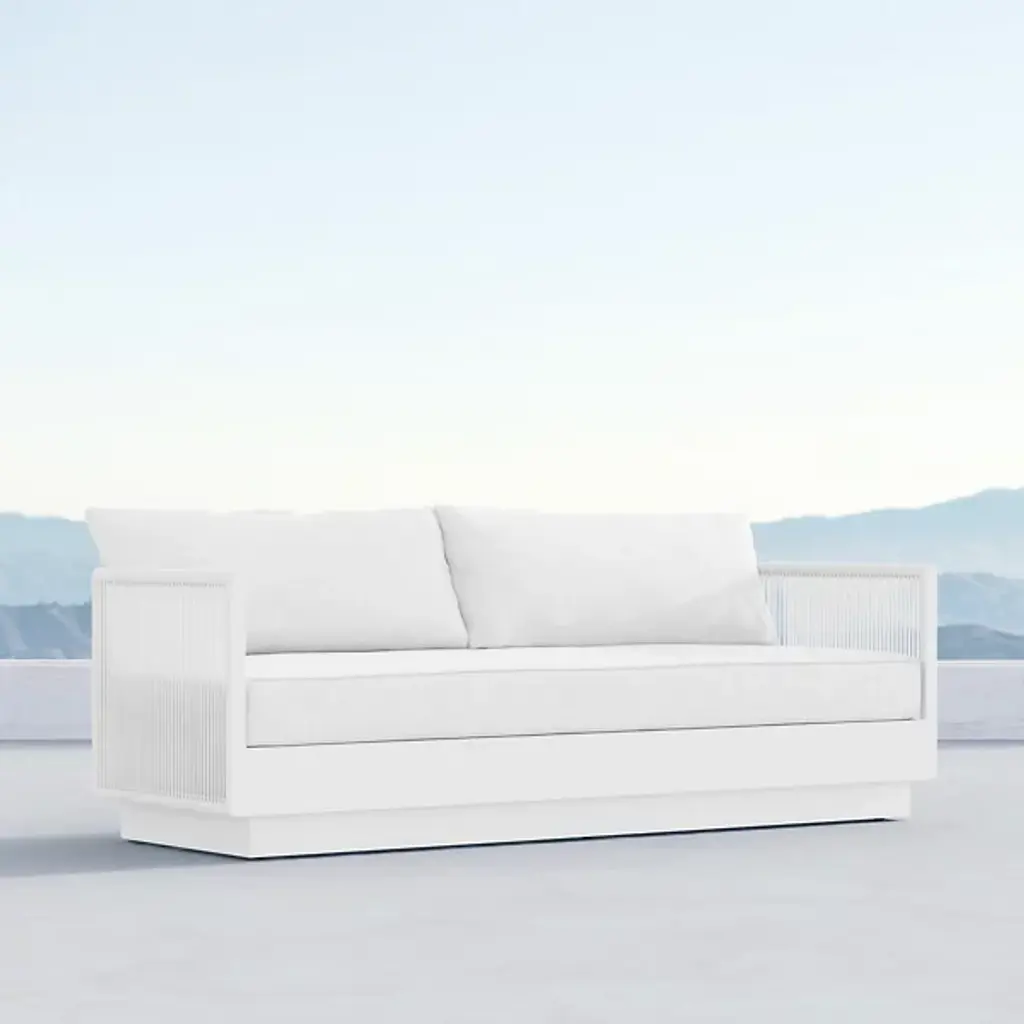 Give an expressive modern appeal to outside lounge spaces with the arresting appeal of the Porto Outdoor 3 Seater Sofa from Azzurro Living. Adroitly pairing streamlined design with modern expressiveness, its clear, articulate design extends from a stepped aluminum base, incorporating parallel strands of all-weather rope around the frame. A rectangular seat cushion and plush pillows with soft fill, each one surfaced in Solvita fabric, add an extra layer of comfort, transforming the airy, coastal structure with a welcome softness still able to endure the most inclement weather.