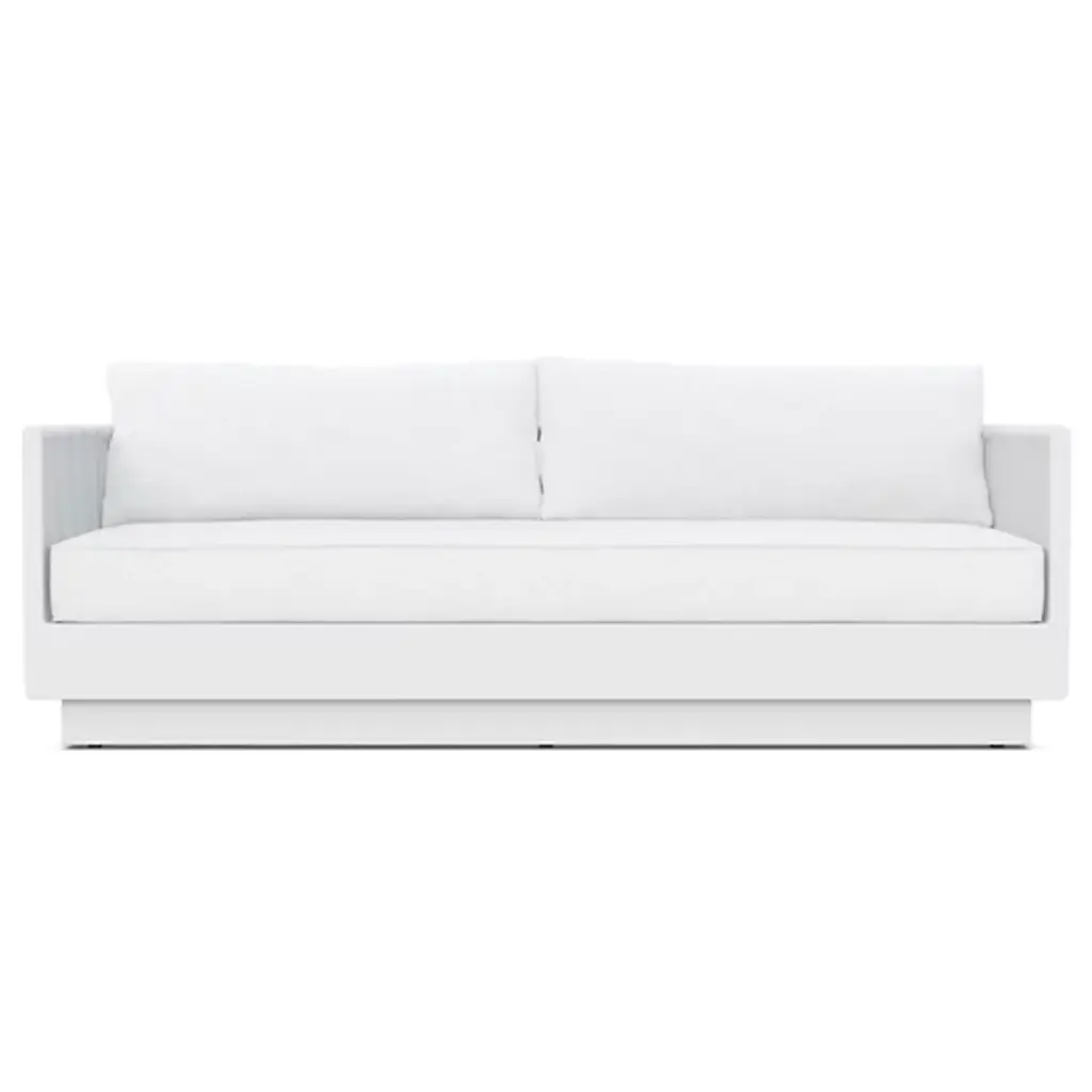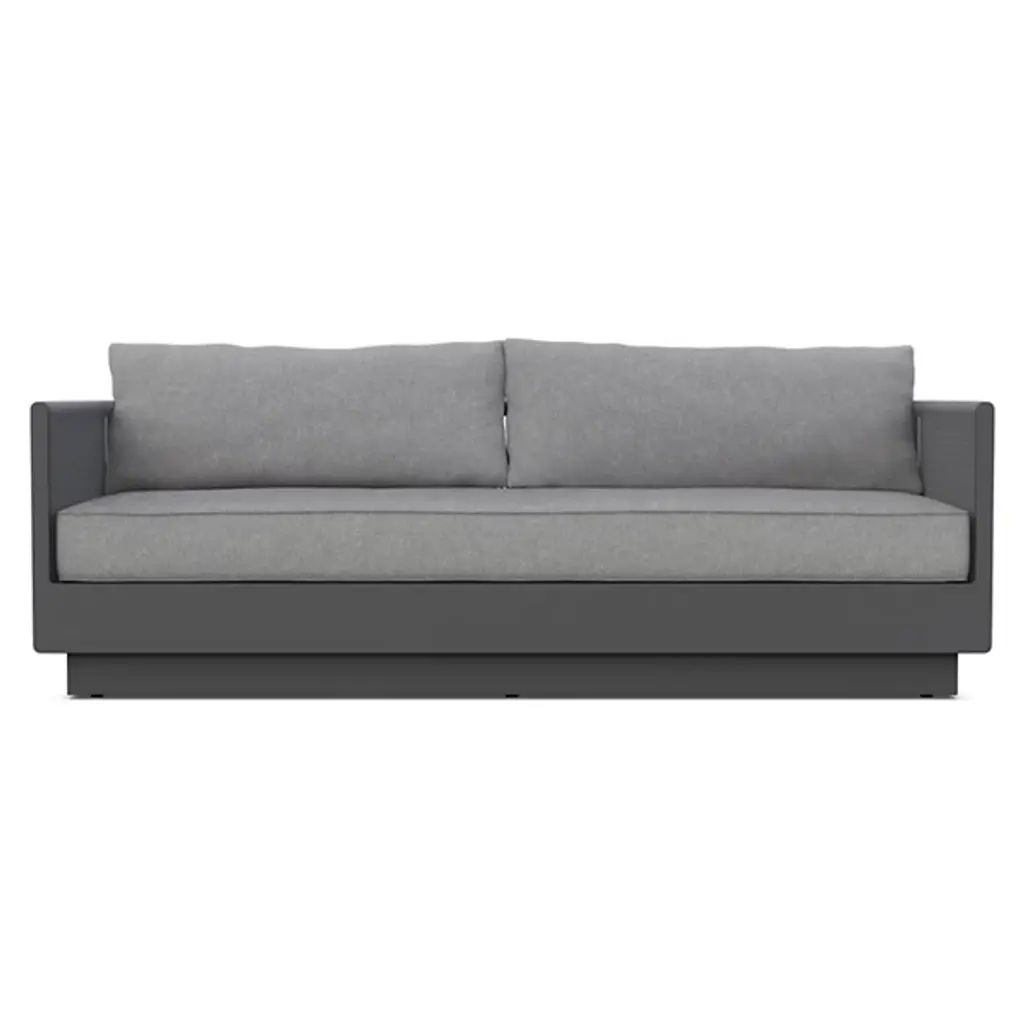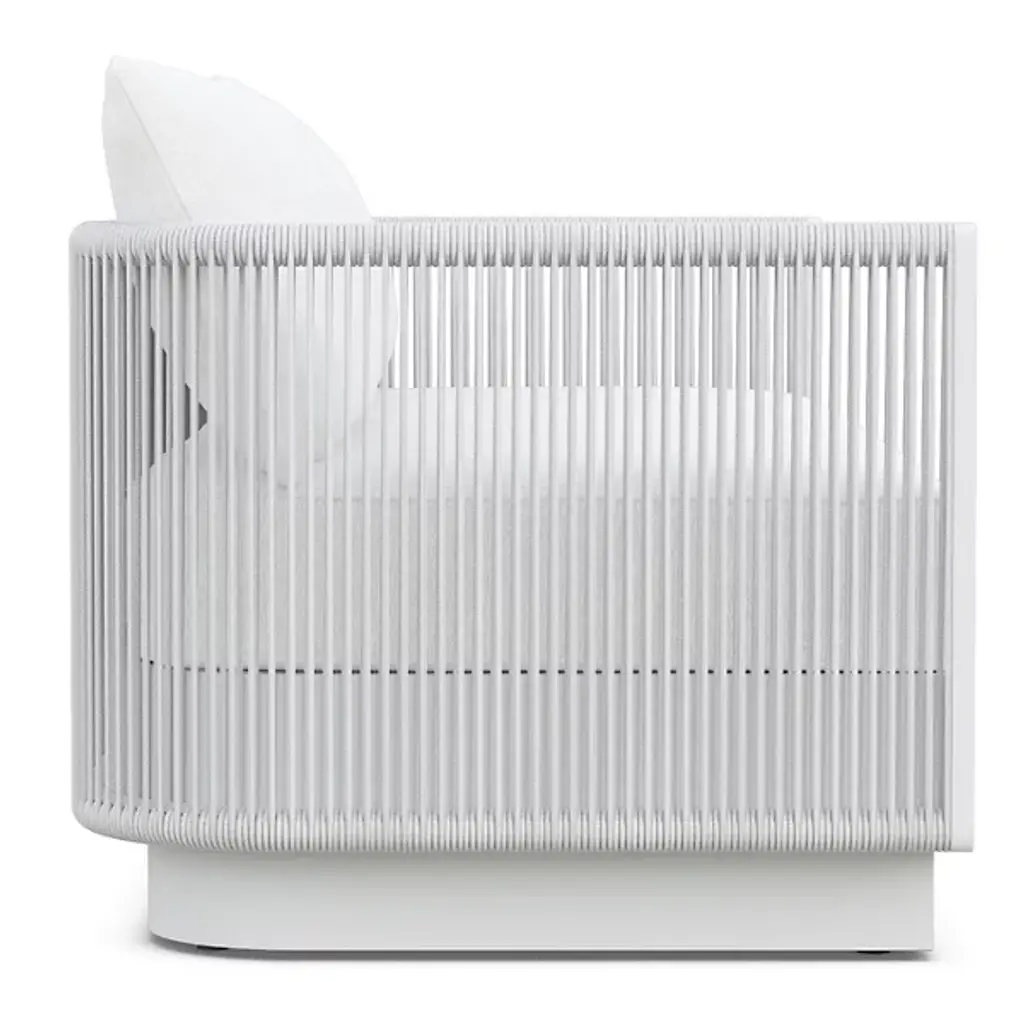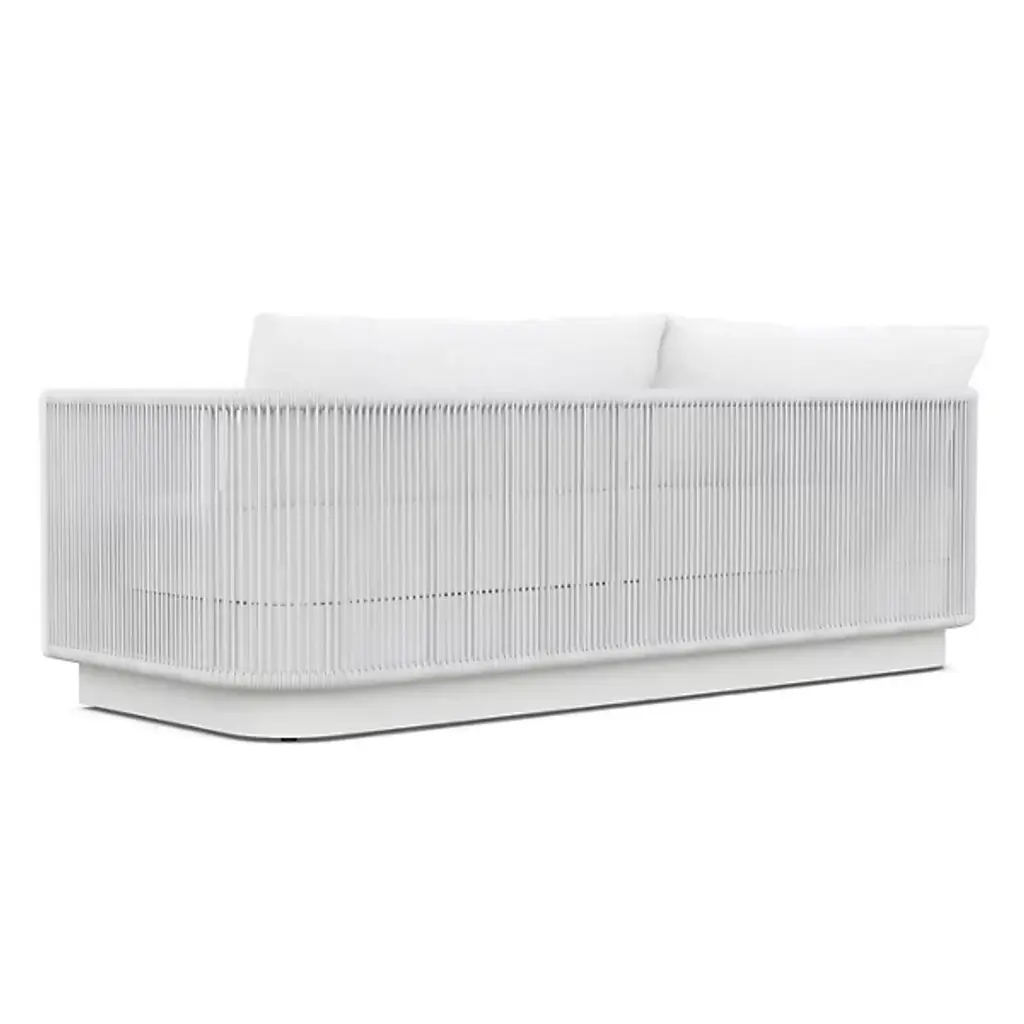 Give an expressive modern appeal to outside lounge spaces with the arresting appeal of the Porto Outdoor 3 Seater Sofa from Azzurro Living. Adroitly pairing streamlined design with modern expressiveness, its clear, articulate design extends from a stepped aluminum base, incorporating parallel strands of all-weather rope around the frame. A rectangular seat cushion and plush pillows with soft fill, each one surfaced in Solvita fabric, add an extra layer of comfort, transforming the airy, coastal structure with a welcome softness still able to endure the most inclement weather.
